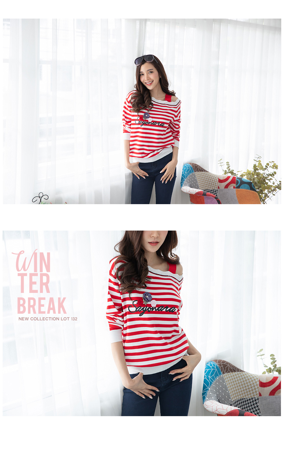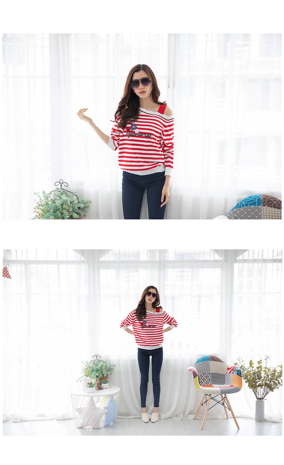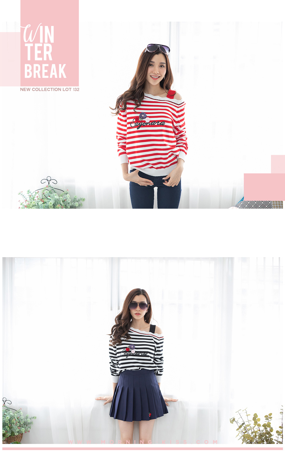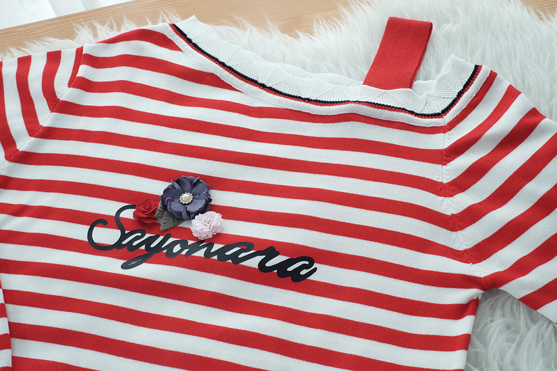 ไอเท็มแนะนำที่สาวๆควรตำ กับเสื้อแขนเปิดไหล่แบบมีสาย ลายขวางอินเทรนตลอดกาล เนื้อผ้า Knitting เนื้อนิ่มสุดๆ ไม่ระคายผิว แบบด้านหน้าสกรีนลายอักษรสีดำ ประดับดอกไม้อัดกลีบสวยๆแบบสามมิติ 3D สวยหวาน ดีเทลกำลังน่ารัก ขอบคอทอไหมลายหยักๆ มีมาให้เลือกสวย 2 ริ้ว (ริ้วดำ ริ้วแดง) ลุคนี้ใส่ได้สบายๆ