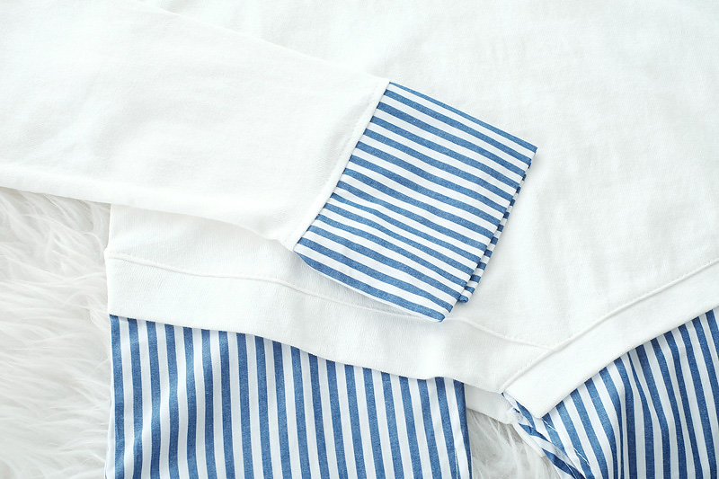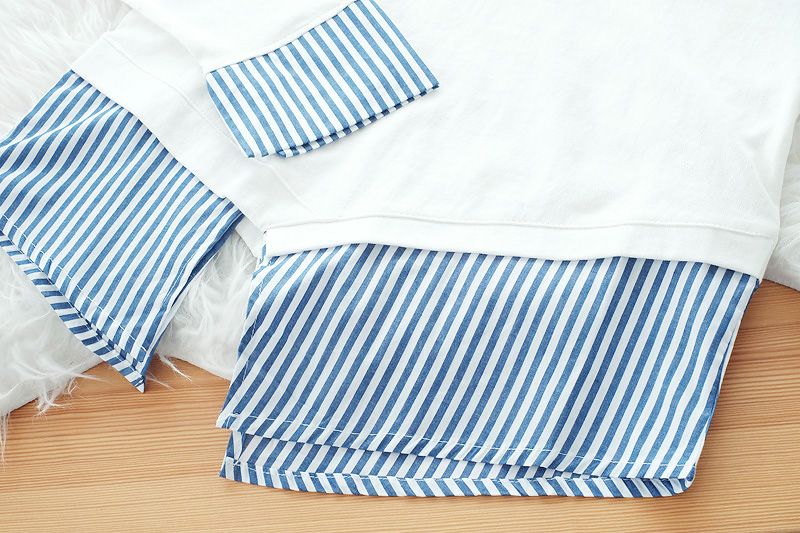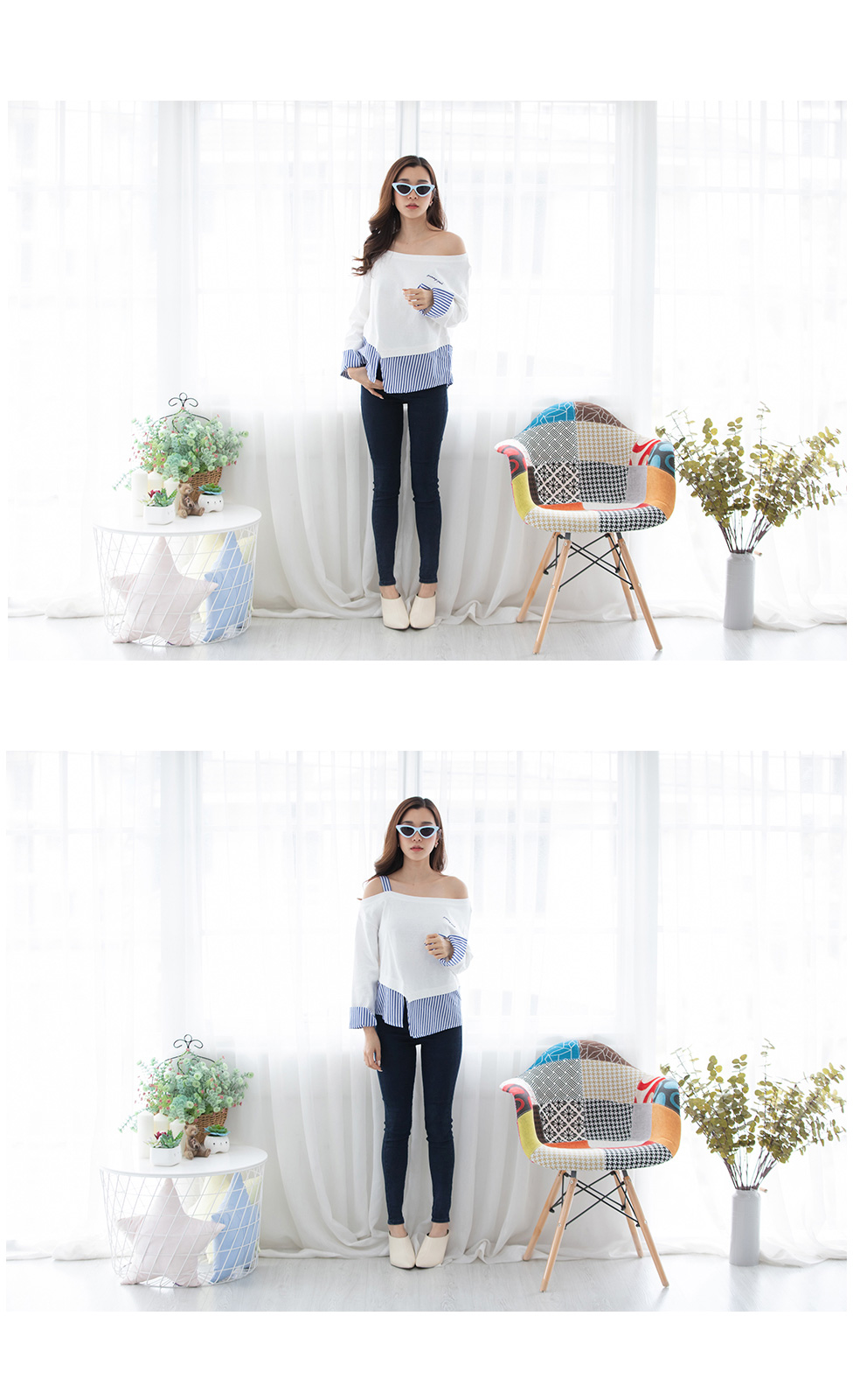 เสื้อแขนยาวแบบเปิดไหล่สายเดี่ยว หน้าอกแต่งงานปักอักษรเล็กๆ ชายเสื้อตัดเป็นสามเหลี่ยมต่อด้วยผ้าลายริ้ว แบบสวยเก๋ไม่ซ้ำใคร แมทกับกางเกงยีนส์สวยเท่ห์อย่าบอกใคร