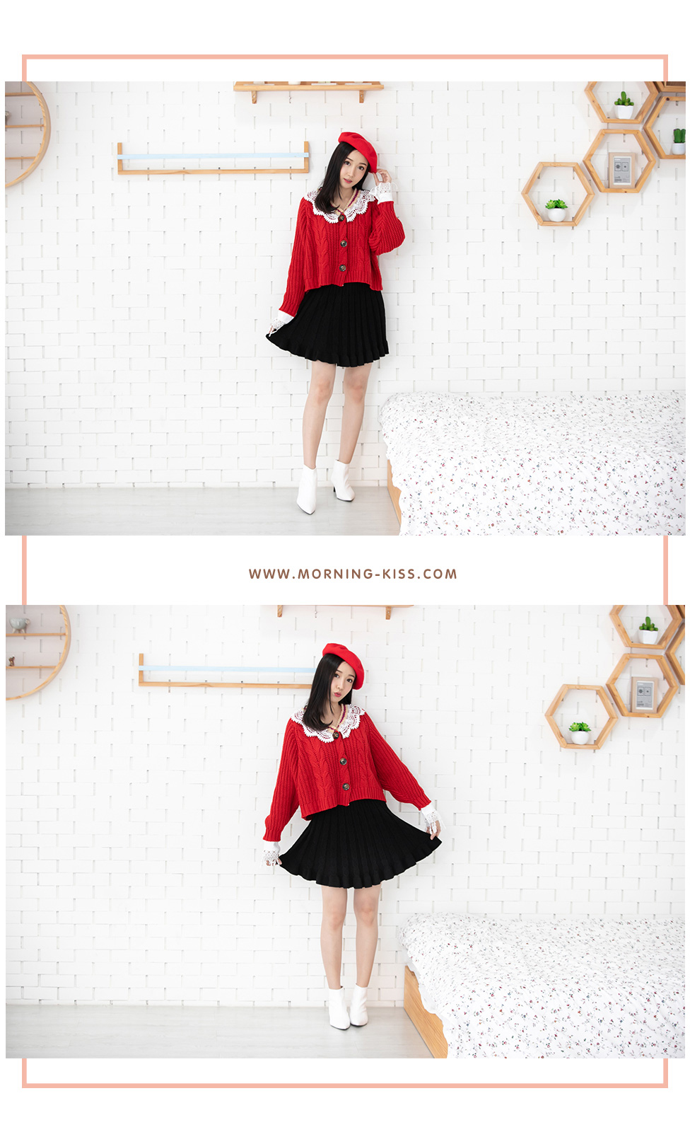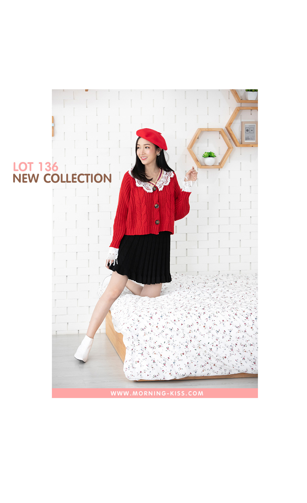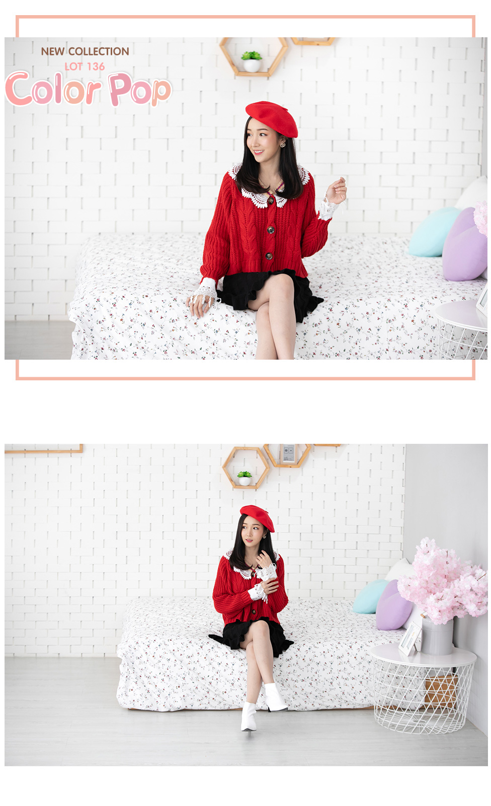 วินเทจนี้ต้องจัดจ้านกันหน่อย กับเสื้อคลุมไหมพรมสีแดงสด งานเกาหลีพรีเมี่ยม เนื้อไหมพรมเส้นใหญ่ทออัดแน่น แต่งลูกไม้สีขาวช่วงคอและปลายแขนสีขาวตัดกับตัวเสื้อได้อย่างลงตัว
