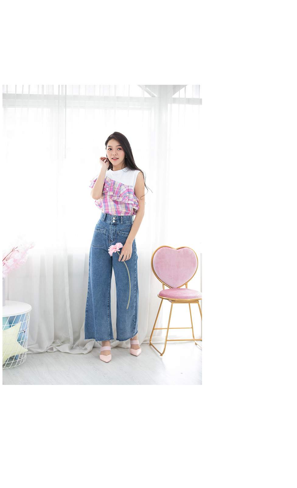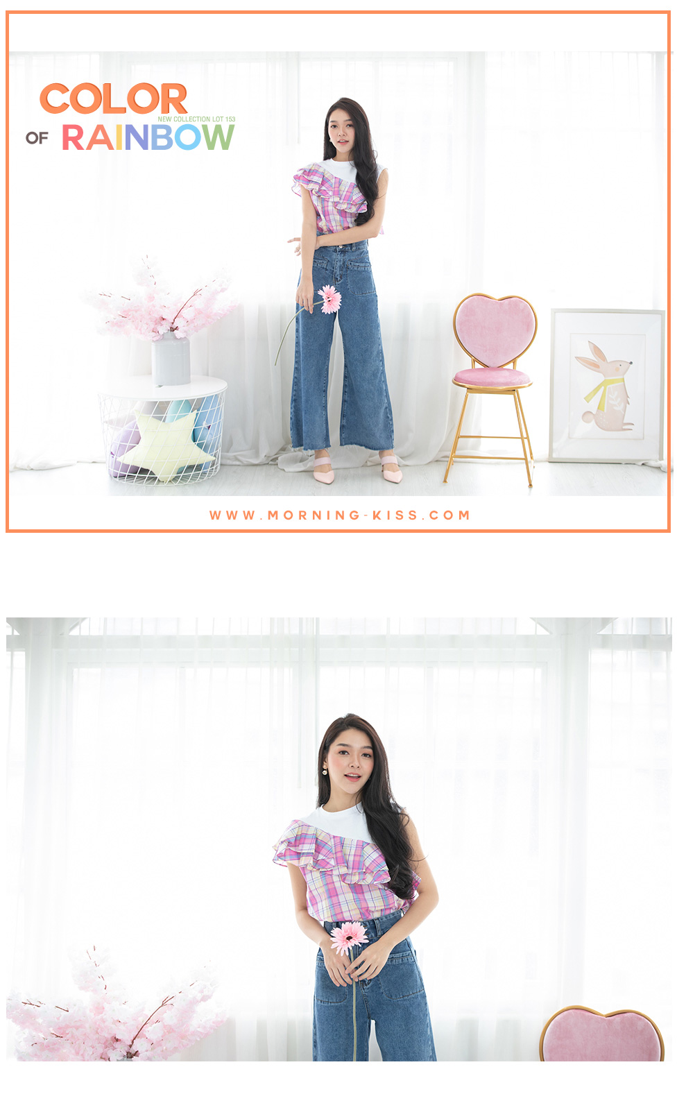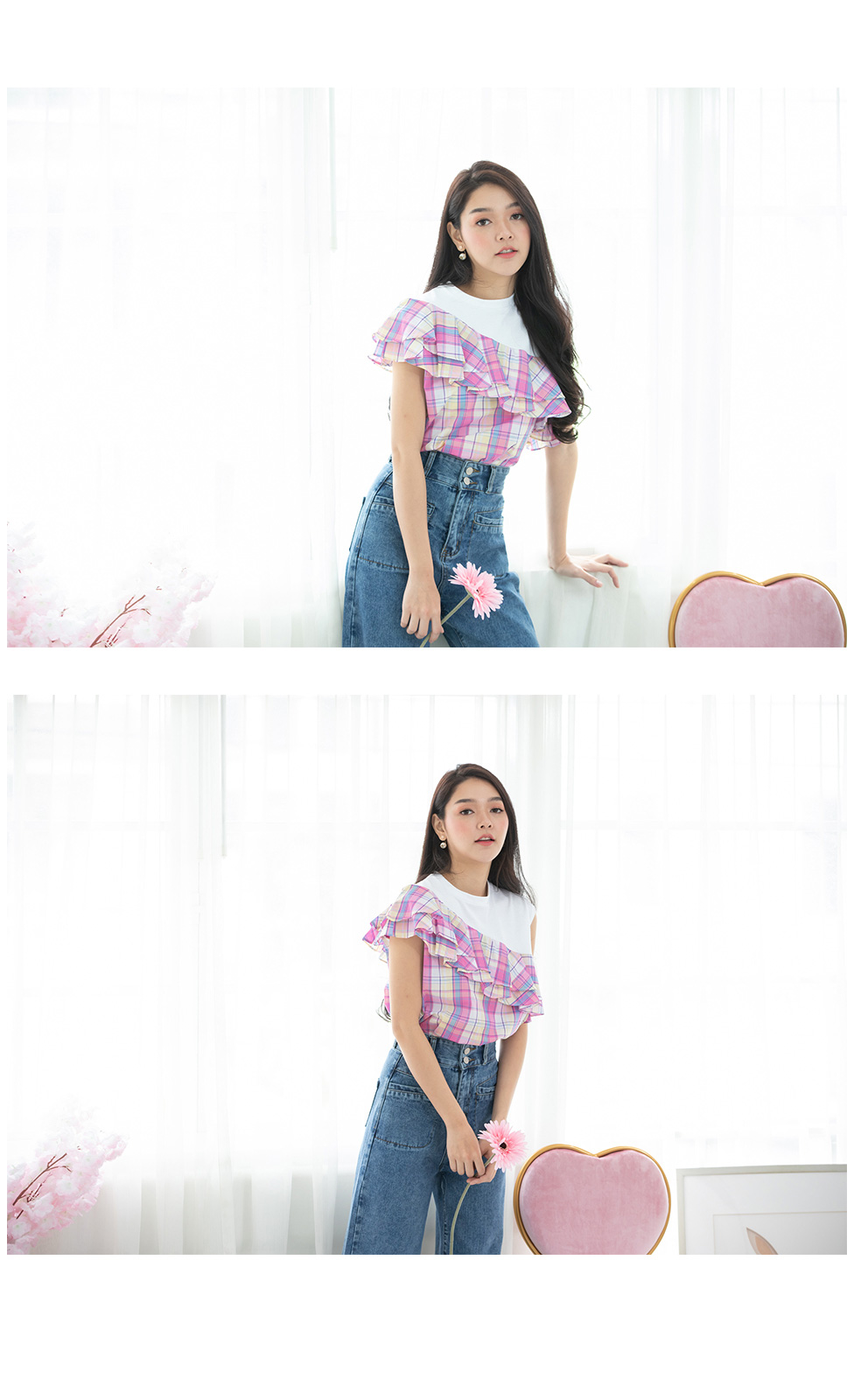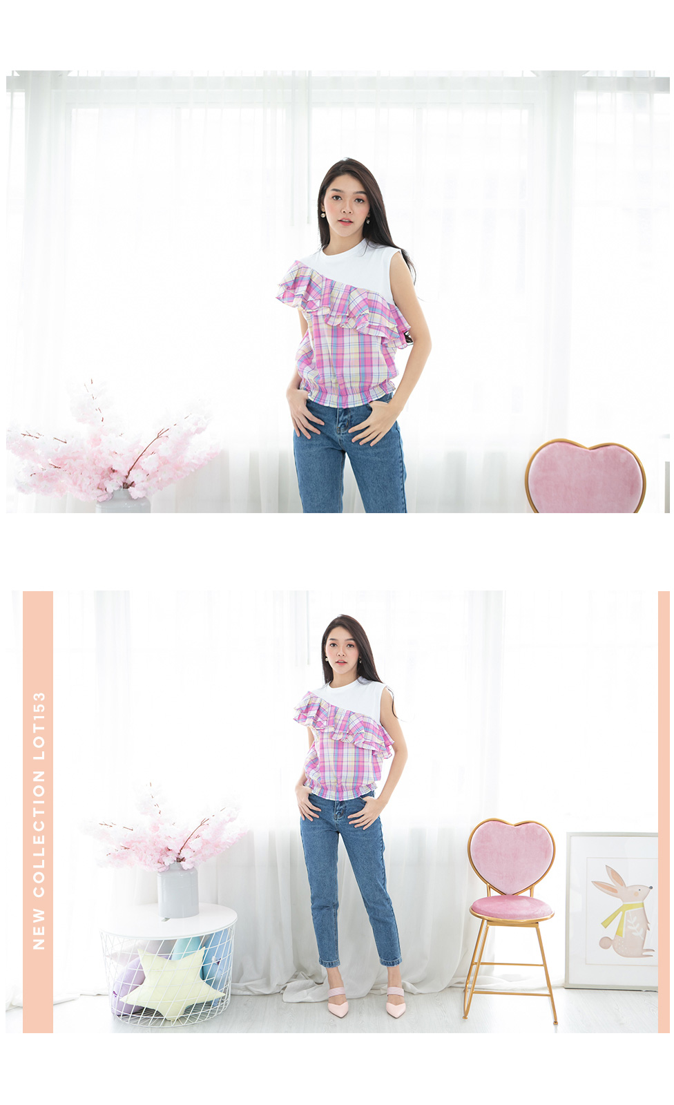 ลุคน่ารักๆกับเสื้อดีไซน์สวยเก๋ไม่ซ้ำใคร ลายสก็อตสีชมพู น่ารักมาก แต่งระบายเฉียงๆ ปลายเสื้อจั่มเบาๆ ลุคน่ารัก ชิวๆ ใส่สบายๆ ใส่ปล่อยชายเสื้อหรือใส่ทับในก็น่ารักเกินห้ามใจ