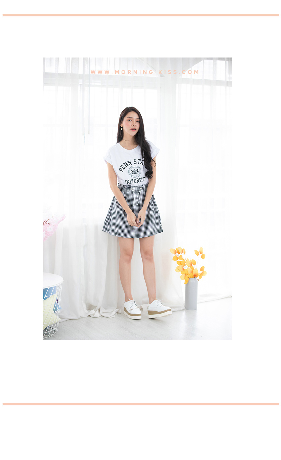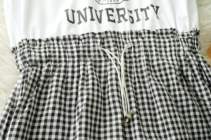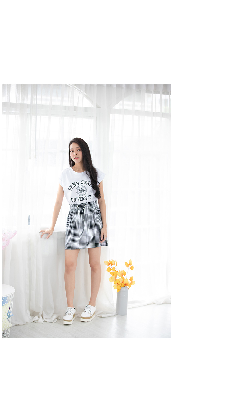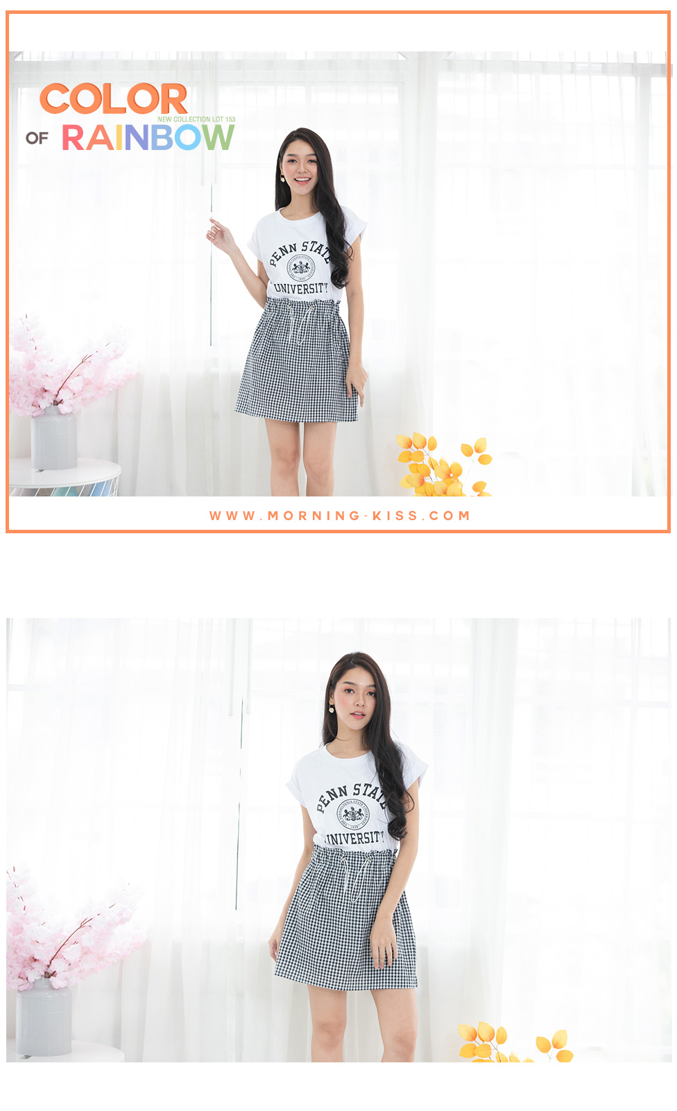 ลุควัยใสนักศึกษาก็จัดให้ กับเดรสน่ารักๆแบบต่อผ้า 2 ชิ้น ตัวเสื้อด้านบนสีขาวผ้า Cotton งานสกรีนอักษรด้านหน้า ปลายแขนพับแบบเย็บติด ช่วงกระโปรงลายสก็อตโทนสีดำเอวยางยืดมีสายผูก ความยาวกำลังสวย แบบสวยจบในชุดเดียวจบ