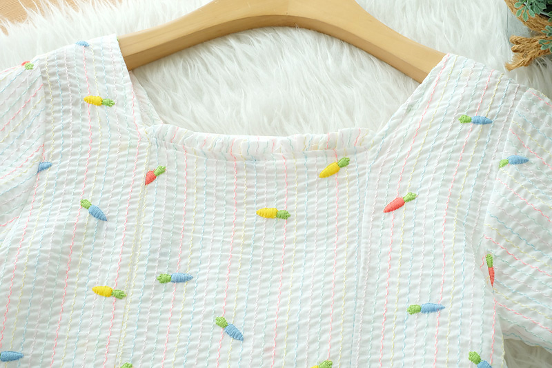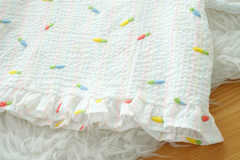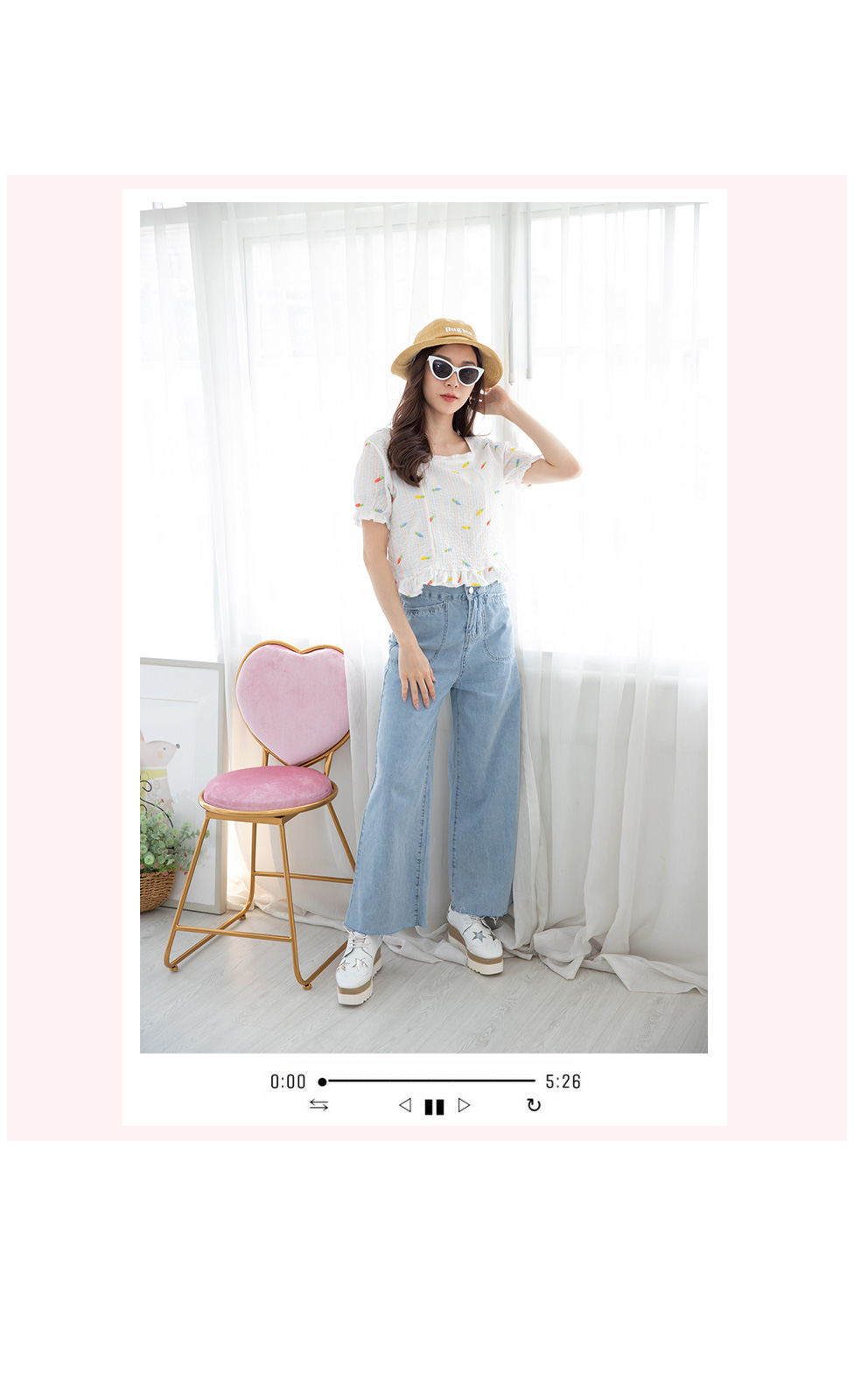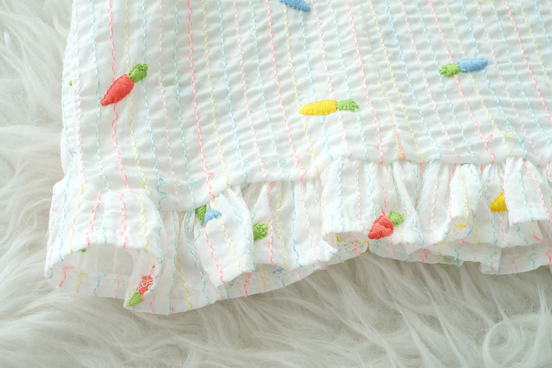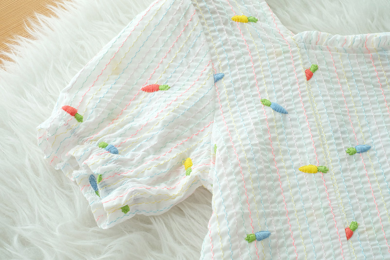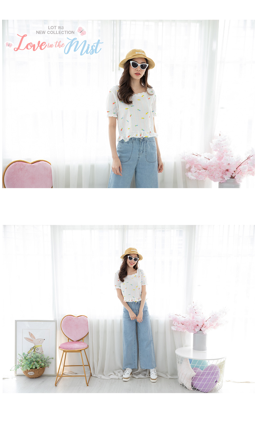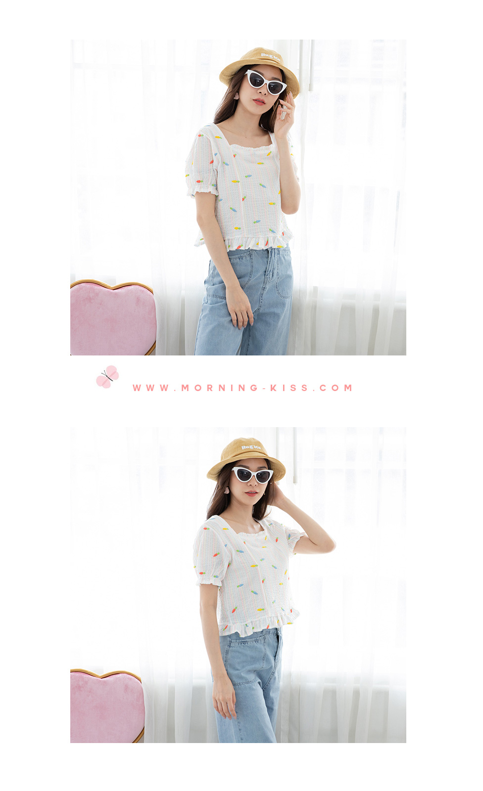 เสื้อทรง crop สีขาว งานเดินเส้นด้ายสีสดใส+งานปักแครอทหลากสีรอบตัว ชายทำระบายเล็กๆ แบบสวยหวานรายการนี้ใส่คู่กับกางเกงเอวสูง ใส่แล้วน่ารักมากจริงๆ