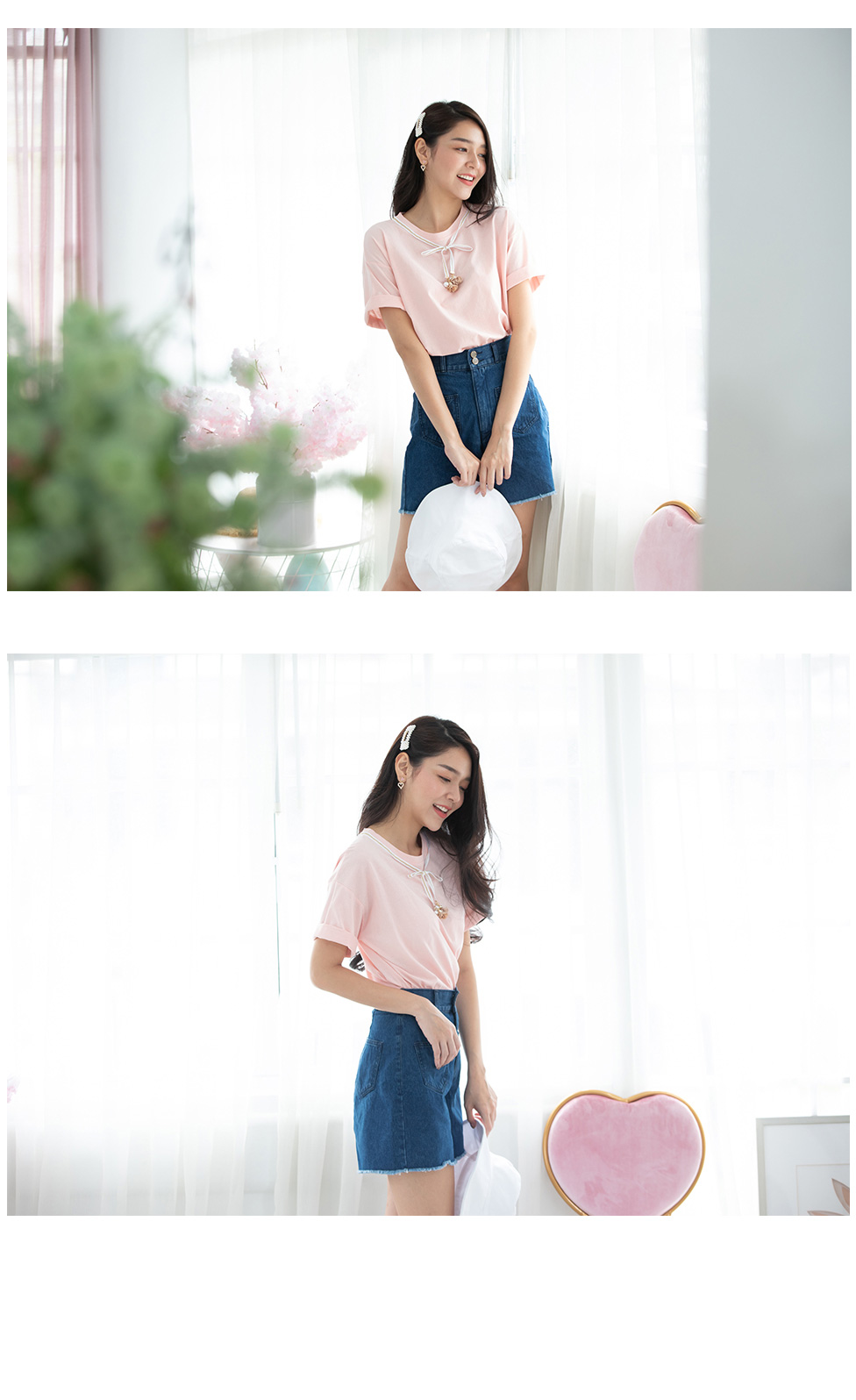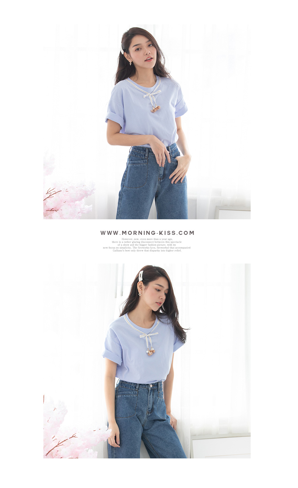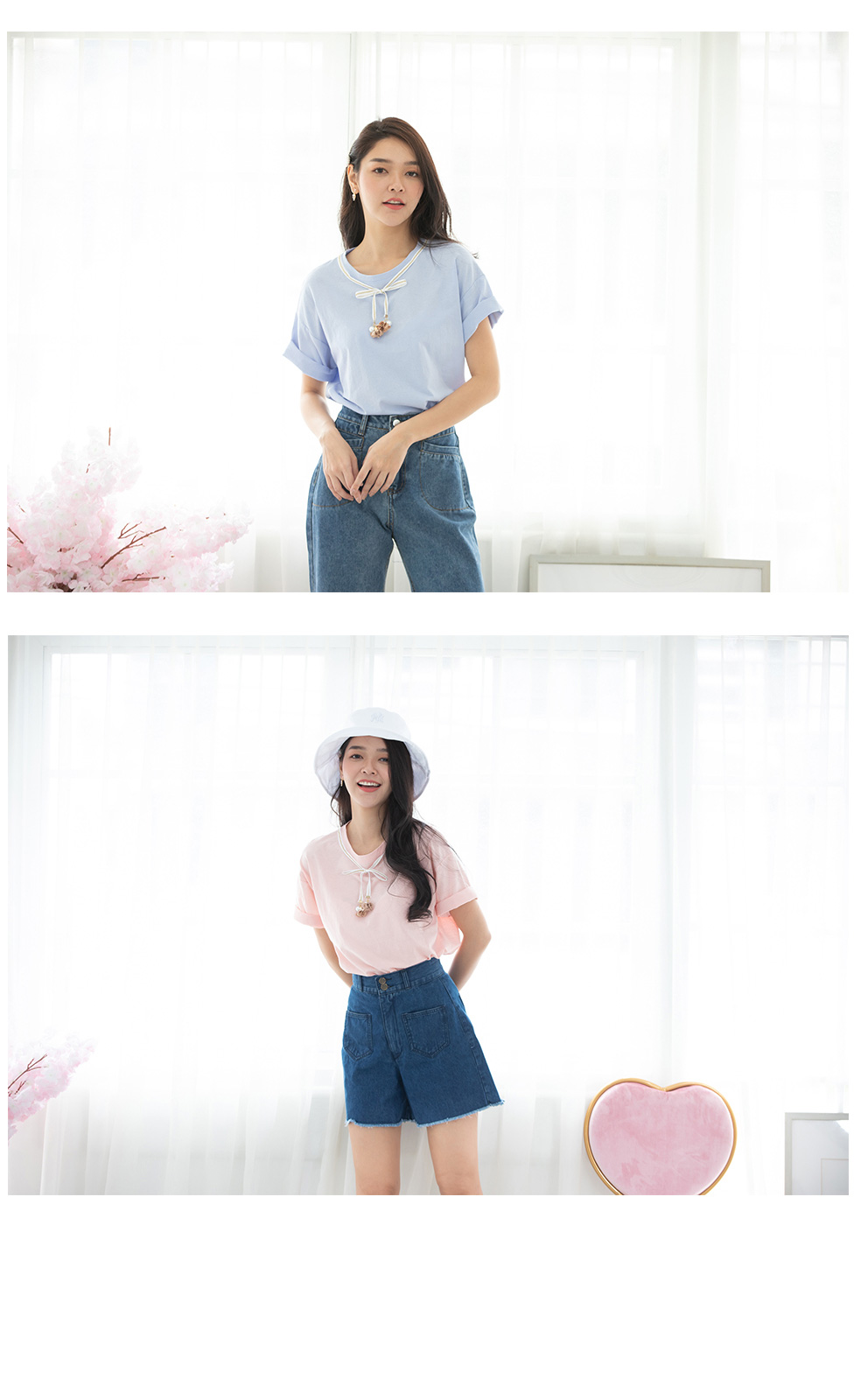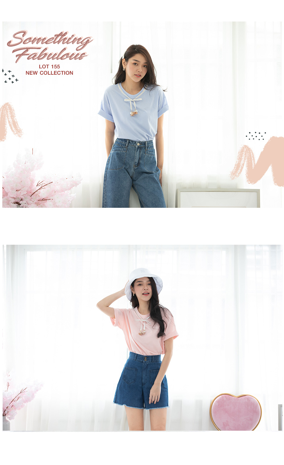 ไอเท็มนี้น่ารักมากๆกับเสื้อยืดใส่ง่ายใส่สบาย ช่วงคอมีสายผูกห้อยดอกไม้+มุกแบบเก๋ๆ แบบสวยหวานเรียบๆ แมทกับเสื้อผ้าได้เยอะ จะยีนส์ขาสั้นหรือกระโปรงก็น่ารัก มีให้เลือก 2 สี ชมพู/ฟ้า