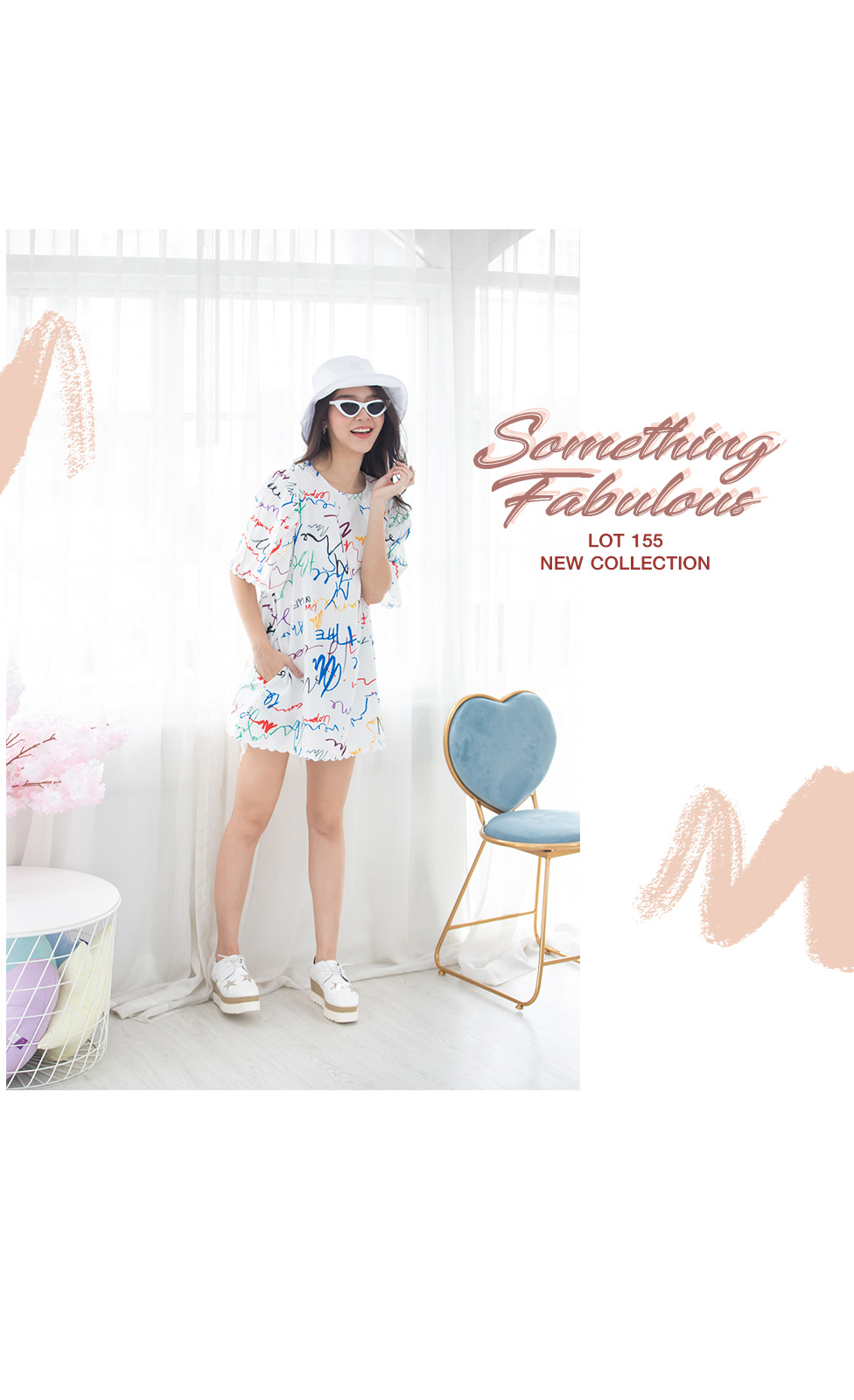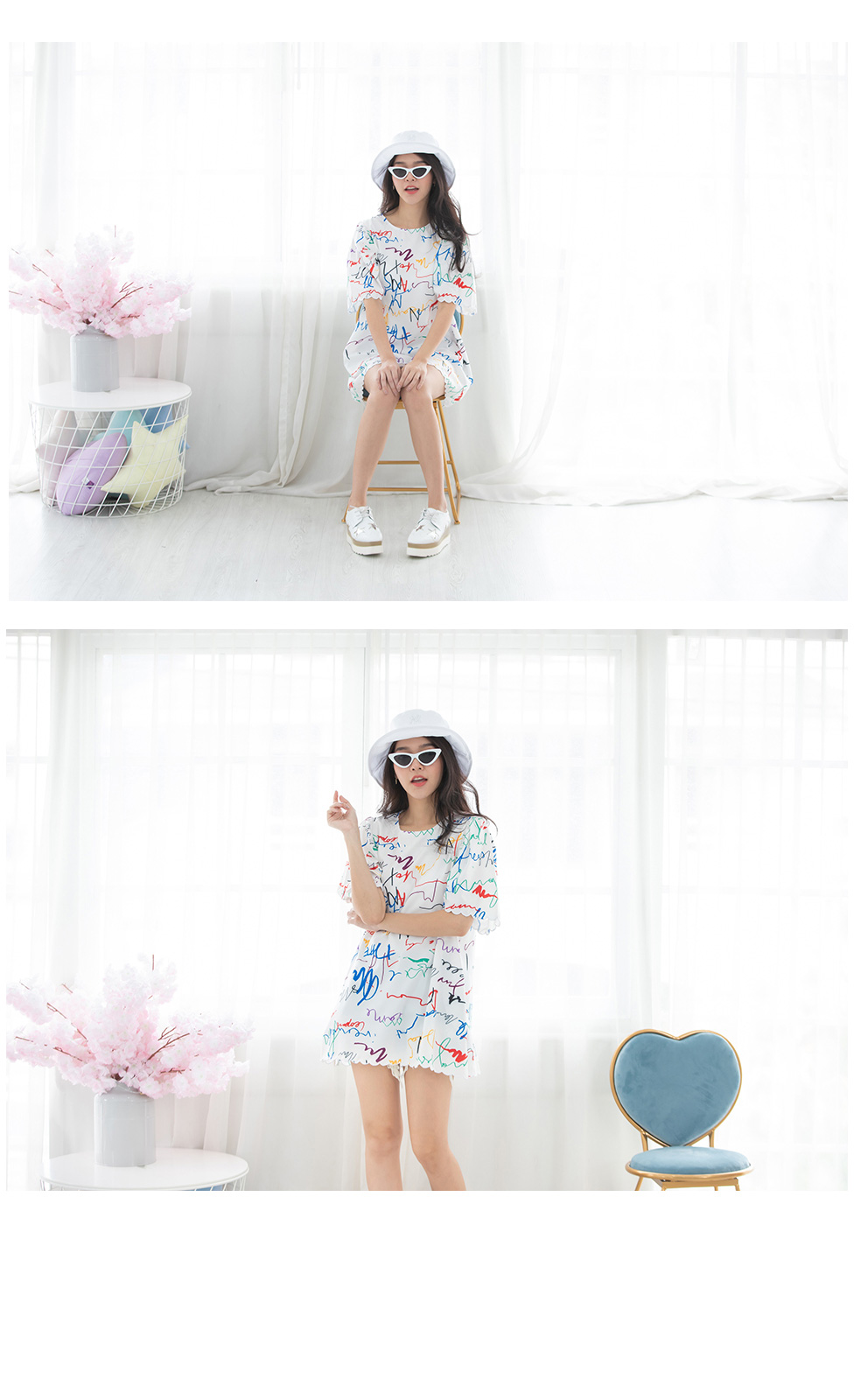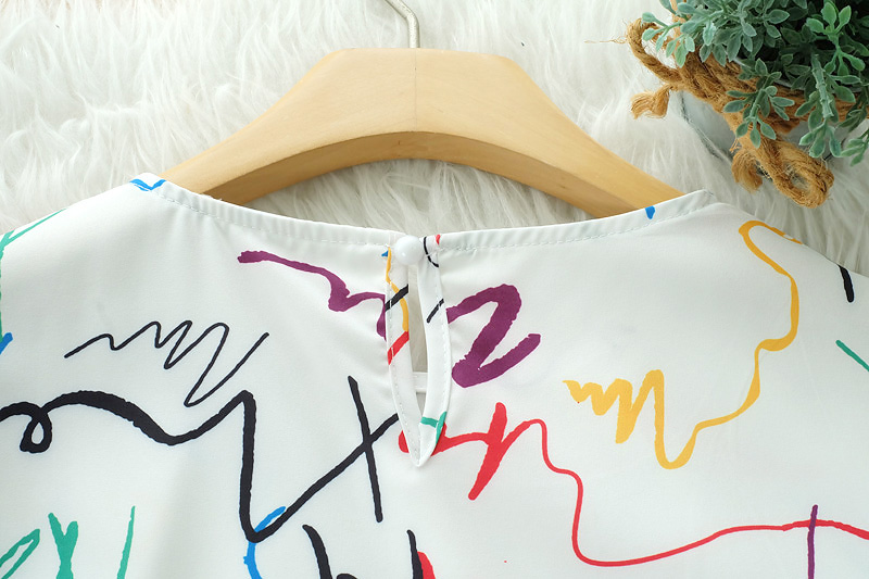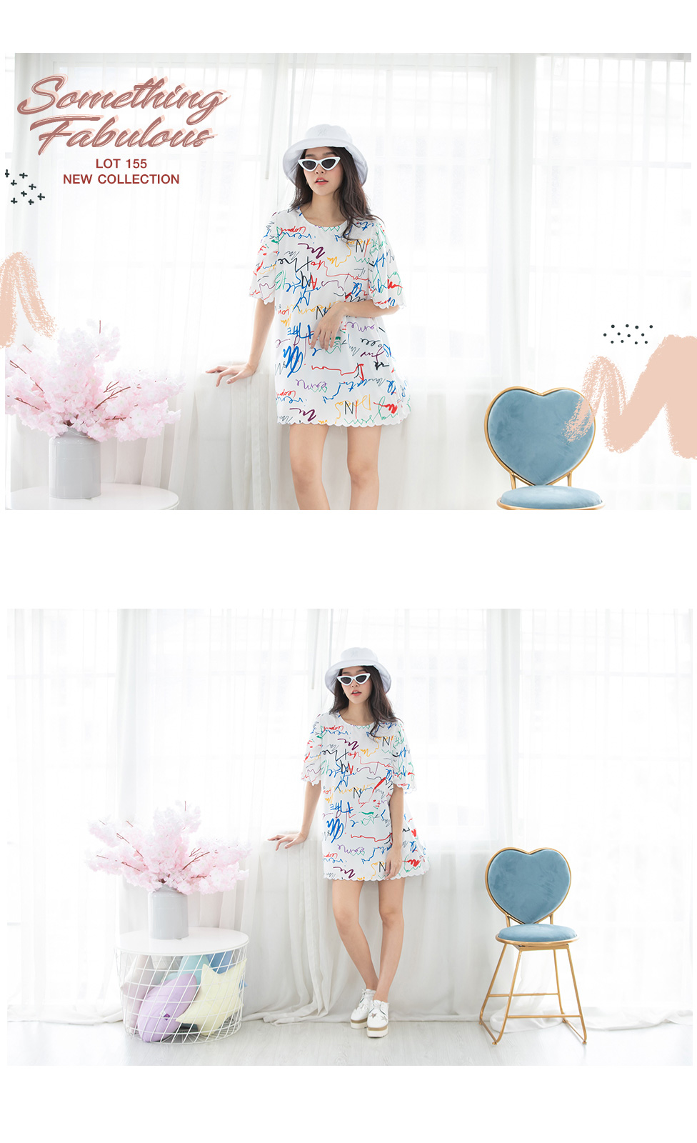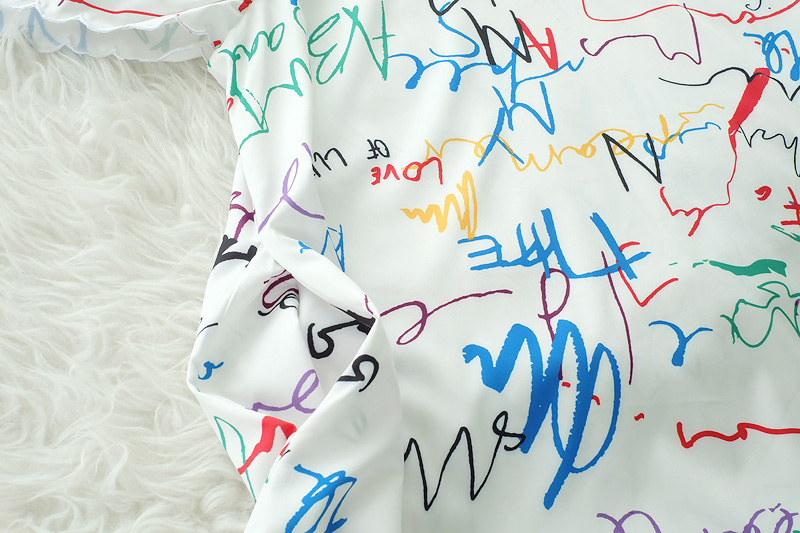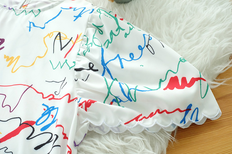มินิเดรสสีขาวงานปริ้นลวดลายเส้นกราฟฟิคเก๋ๆ สีสดใส ทรง oversize เนื้อผ้าดีใส่สบายไม่ร้อน ปลายแขนและชายกระโปรงทำเป็นหยักๆน่ารักกุ๊นขอบสีขาว มีกระเป๋าจริง 2 ข้าง ใส่ง่าย ลุคชิวๆ ตัวเดียวจบ