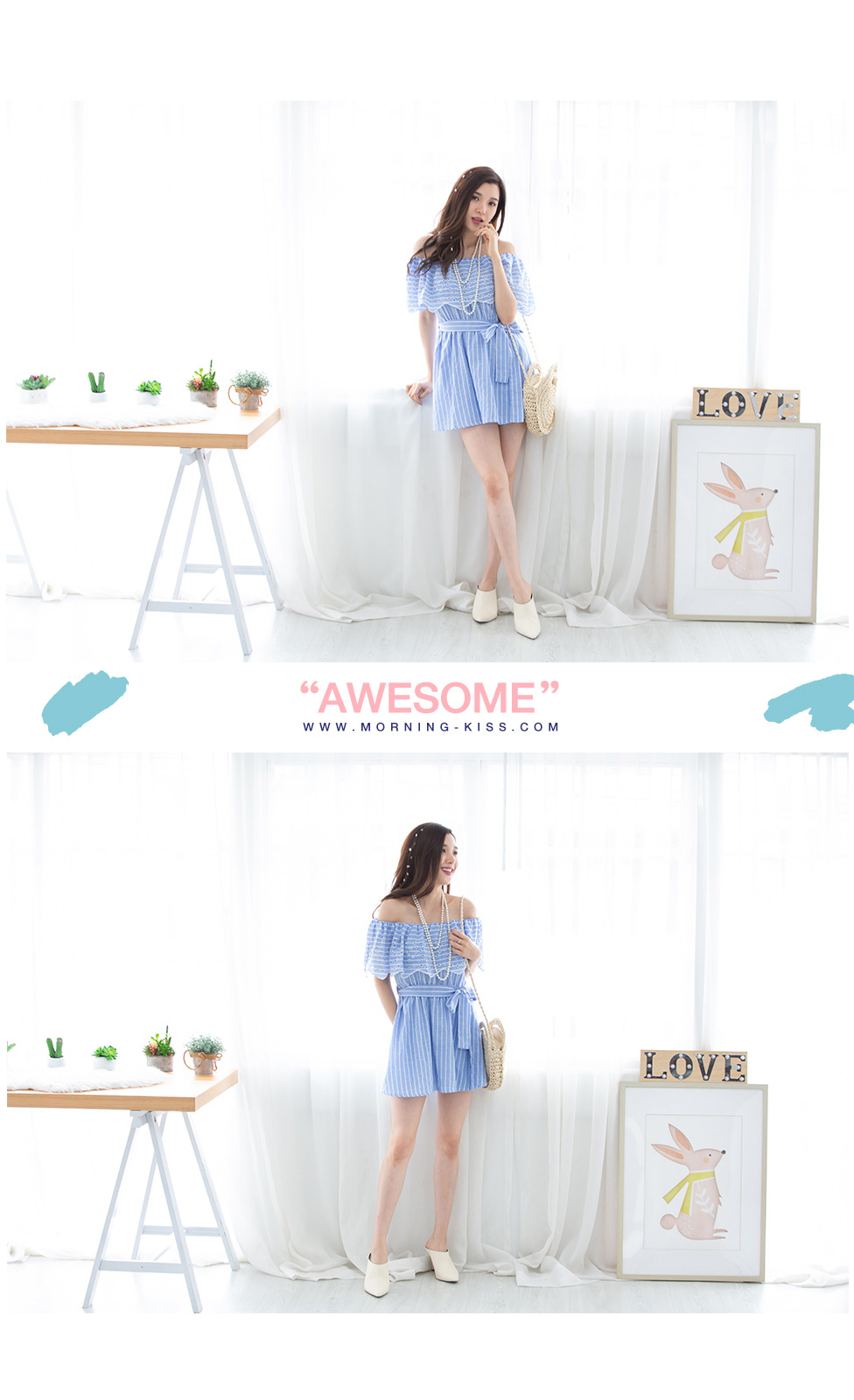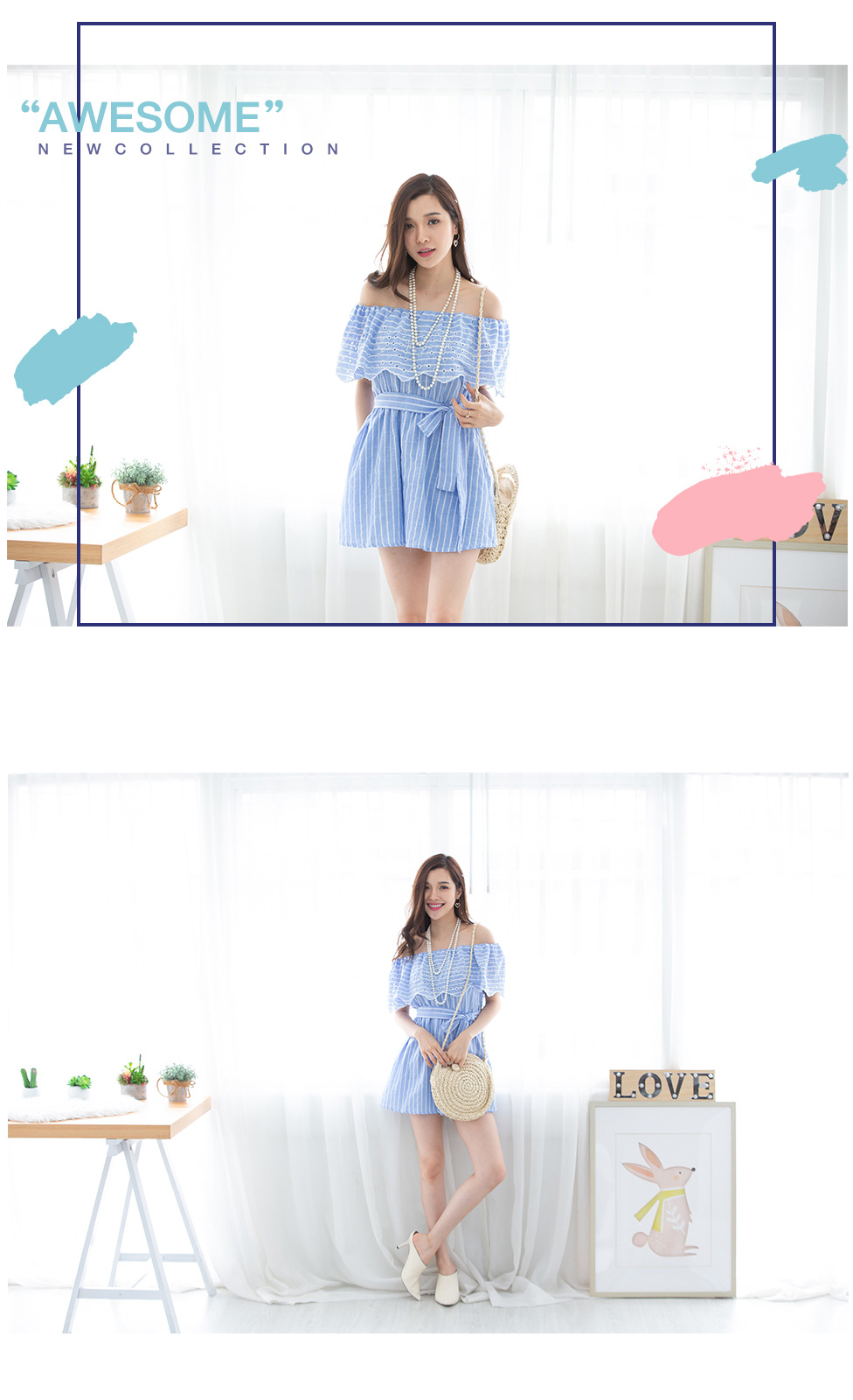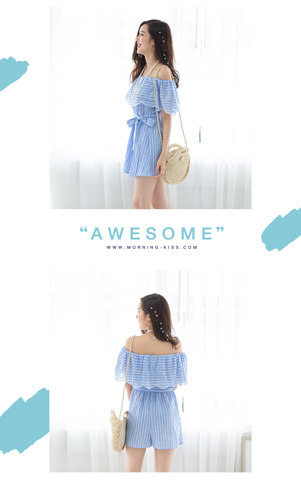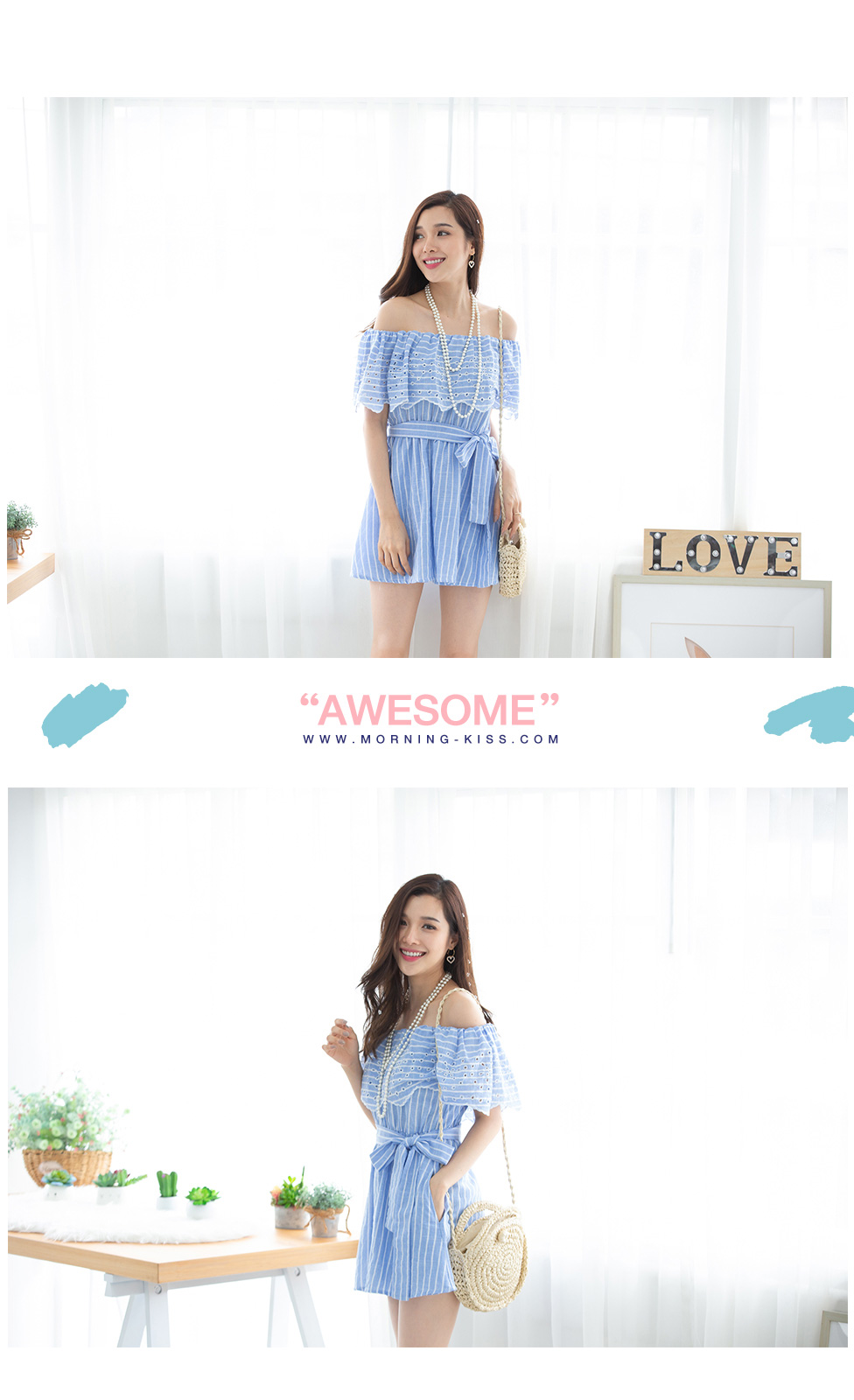 น่ารักสุดไอเท็มนี้ Jumpsuit สีฟ้าริ้วขาวสดใสแต่งระบายฉลุลายได้ลุคสวยแพง ช่วงกางเกงด้านหน้าตัดเย็บผ้าทับคล้ายกระโปรงและด้านหลังปล่อยเป็นทรงกางเกงปกติ ขอบเอวยางยืดใส่สบายไม่อึดอัด รุ่นนี้ทรงสวย เป้ายาวไม่ต้องกังวลเรื่องเป้ารั้งนะคะ แบบน่ารักมากๆลุคคล้ายกระโปรง จะใส่แบบเปิดไหล่หรือจะใส่เป็นแบบดึงขึ้นก็น่ารักดูดีทั้งสองสไตล์ มาพร้อมสายขาดเอวผูกปรับเป็นโบว์เข้าเซ็ต ใสใสวัยรุ่นชอบจัดเลย