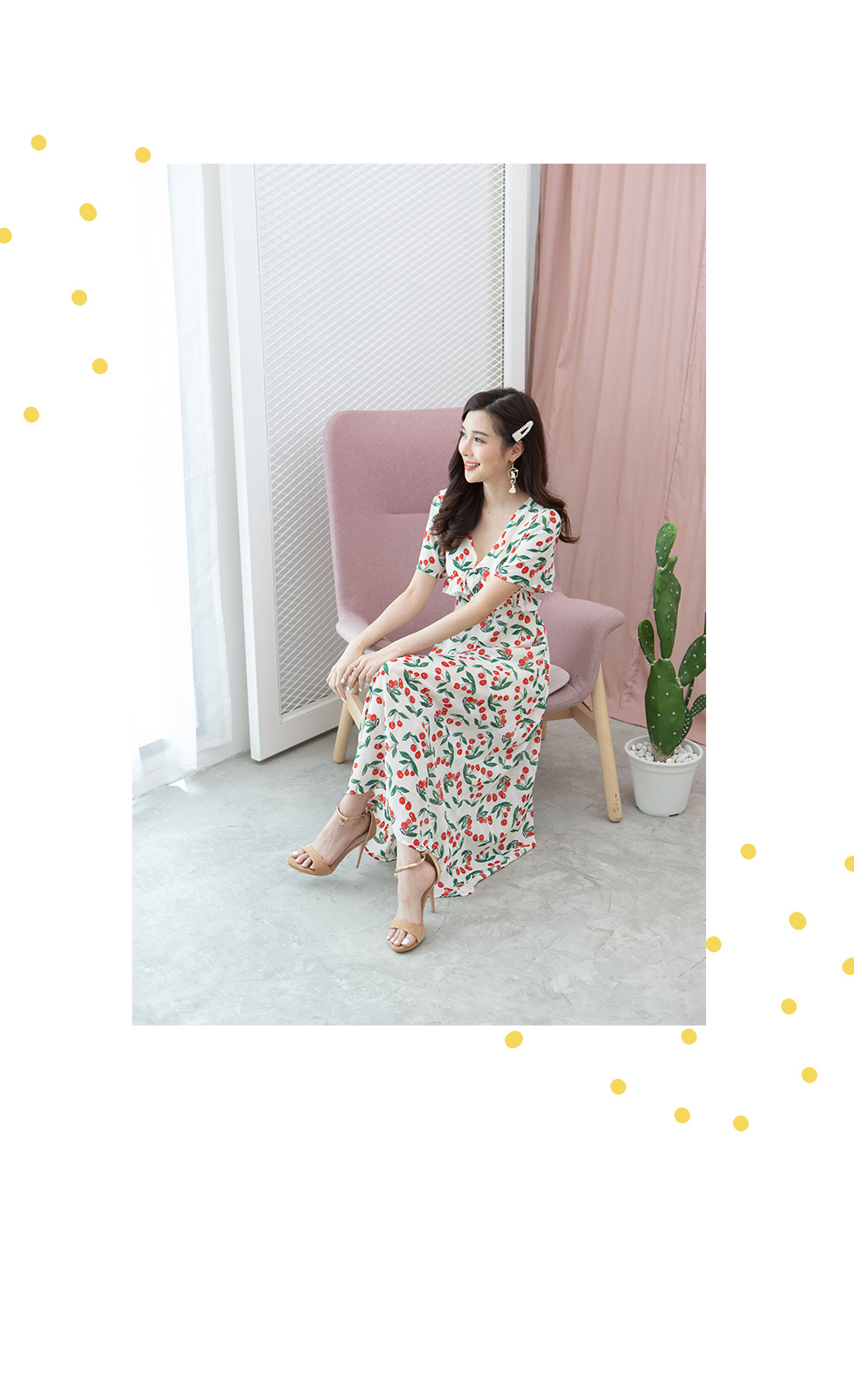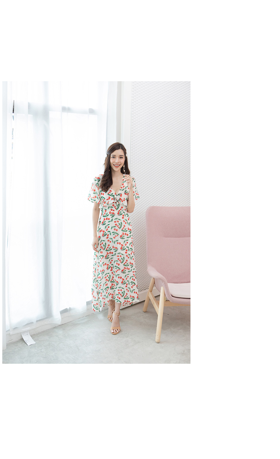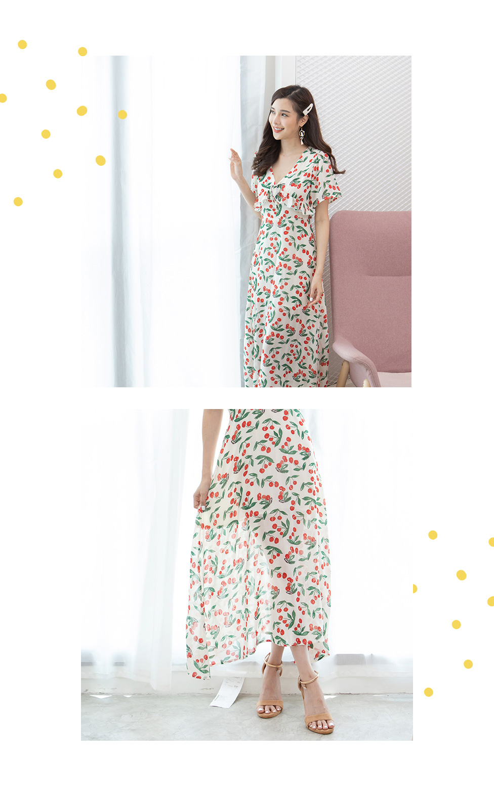 ไอเท็มนี้แนะนำสาวๆเลยค่า นุ้งเชอรี่ น่ารักมากกกก เป็นเดรสชีฟองลายเชอรี่สีแดง งานสวย เนื้อผ้าพริ้วดีงามมาก ทรงคอวีจับจีบมีเชือกผูกช่วงอก เอวฟิค ซิปซ่อนหลัง แขนระบาย มาพร้อมซับในทั้งตัว งานสวยหวานมากค่ะ จัดไปไม่ผิดหวังแน่นอน