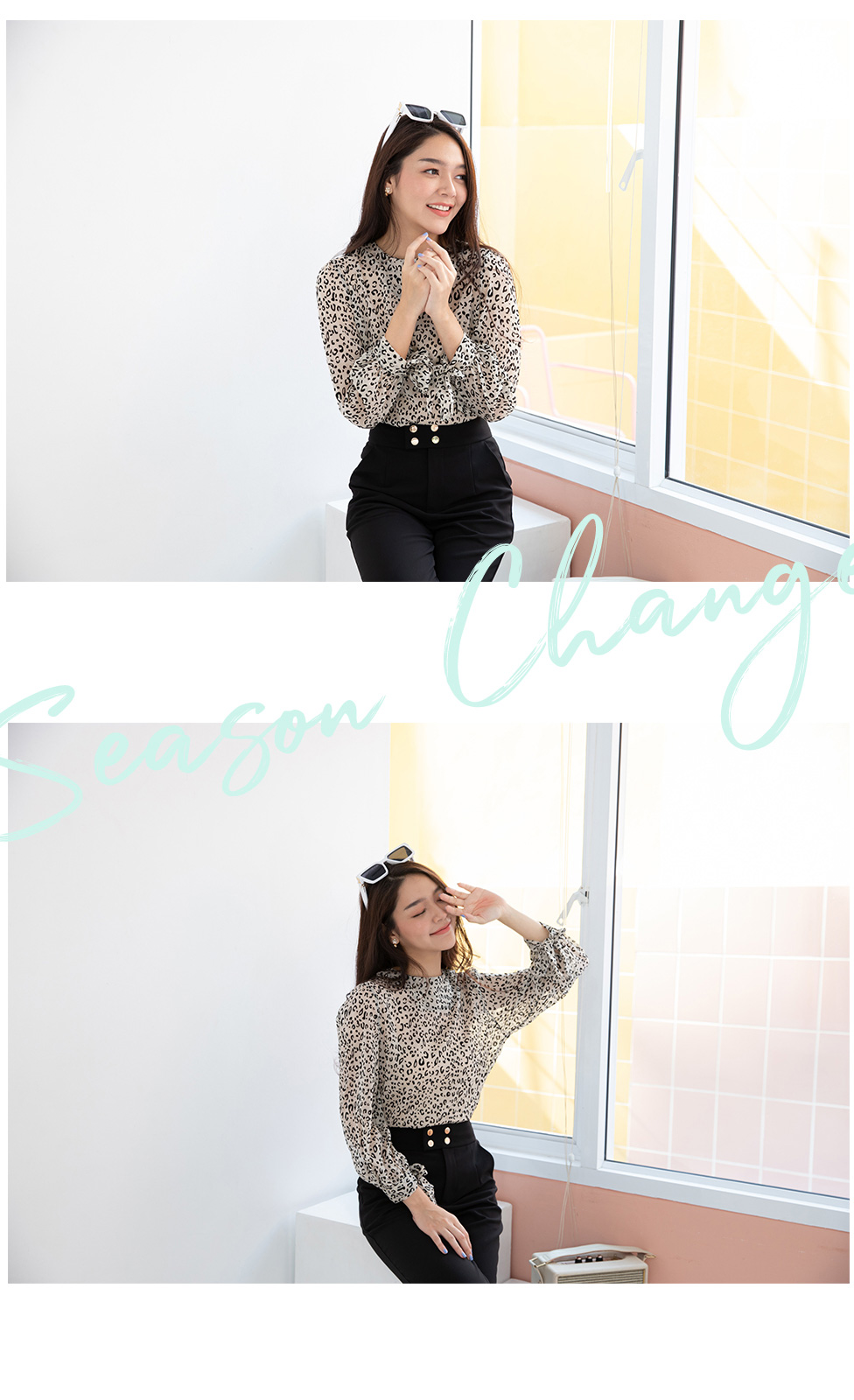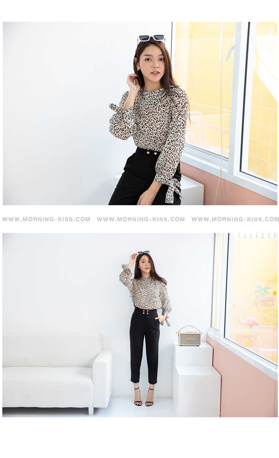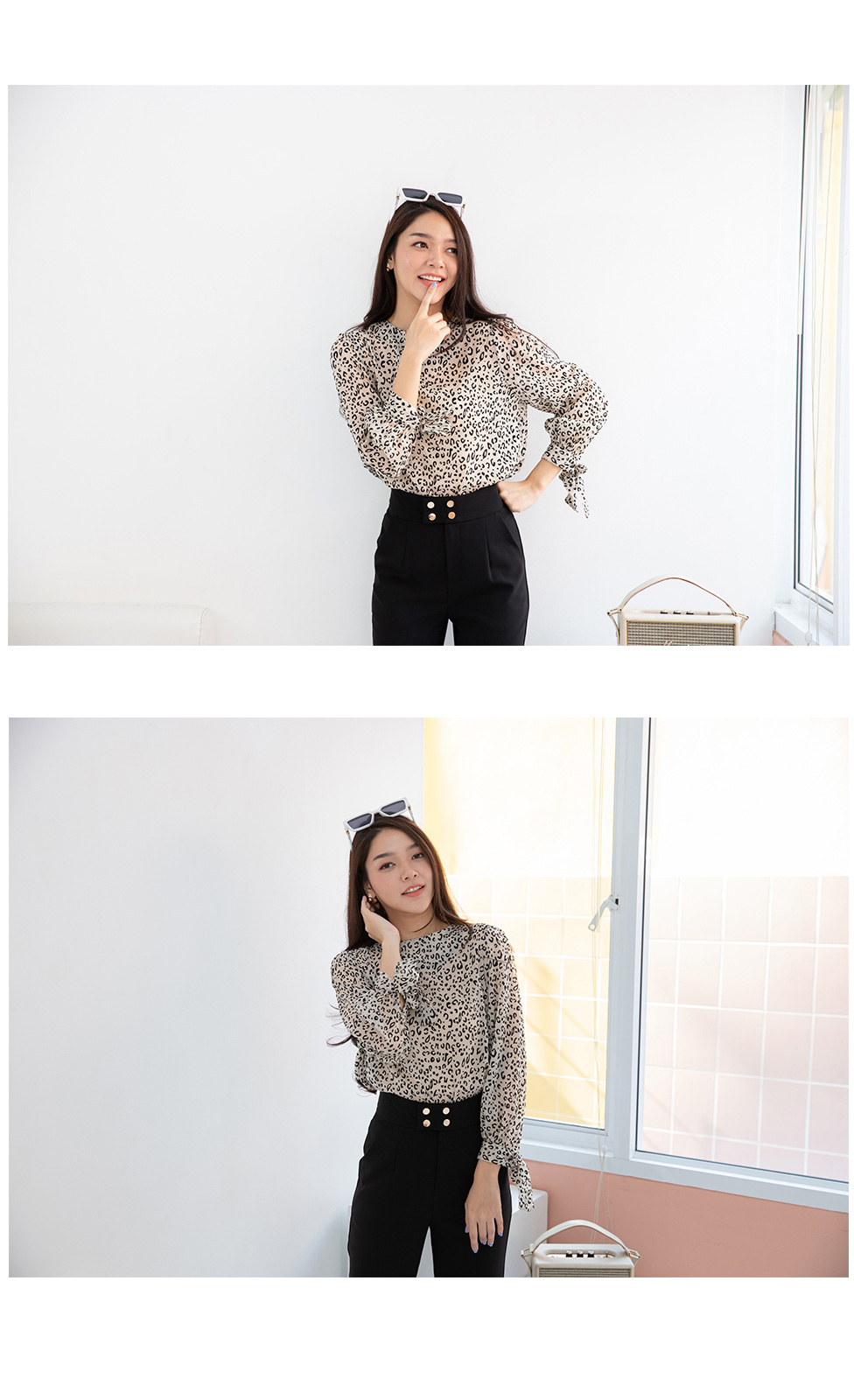 สาวเปรี้ยวแบบ smart look เสื้อแขนยาวผ้าซีฟองลายเสือ เนื้อผ้าแบบมี texture ในตัว ปลายแขนผูกเป็นโบว์น่ารักๆ แบบเรียบๆไม่เน้นดีเทลเยอะ แค่ลายผ้าก็สวยเก๋ไม่เบาอยู่แล้ว ใส่แมทกับกางเกงใส่ทำงาน ใส่เดินห้าง ได้หลายโอกาส