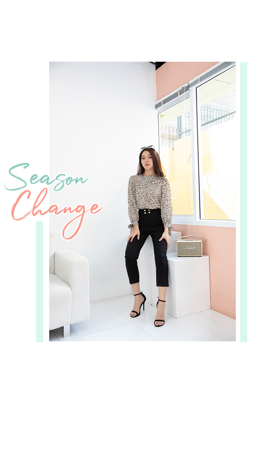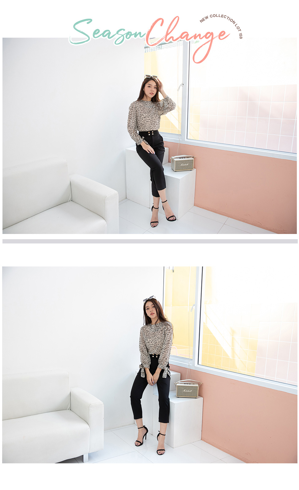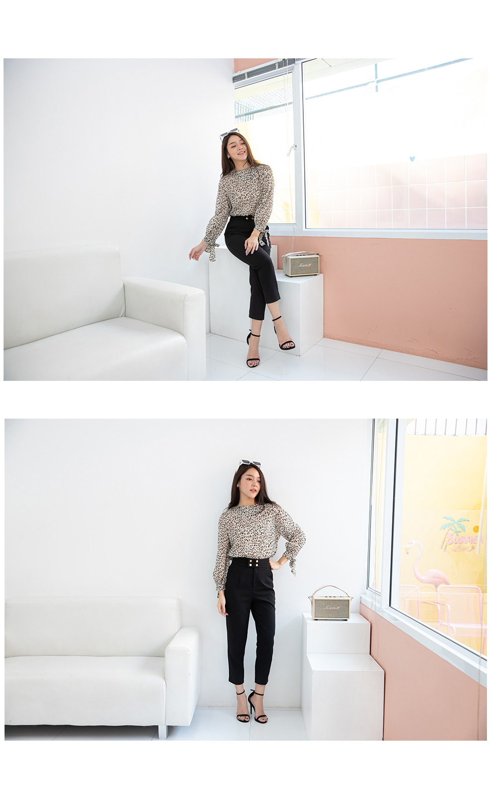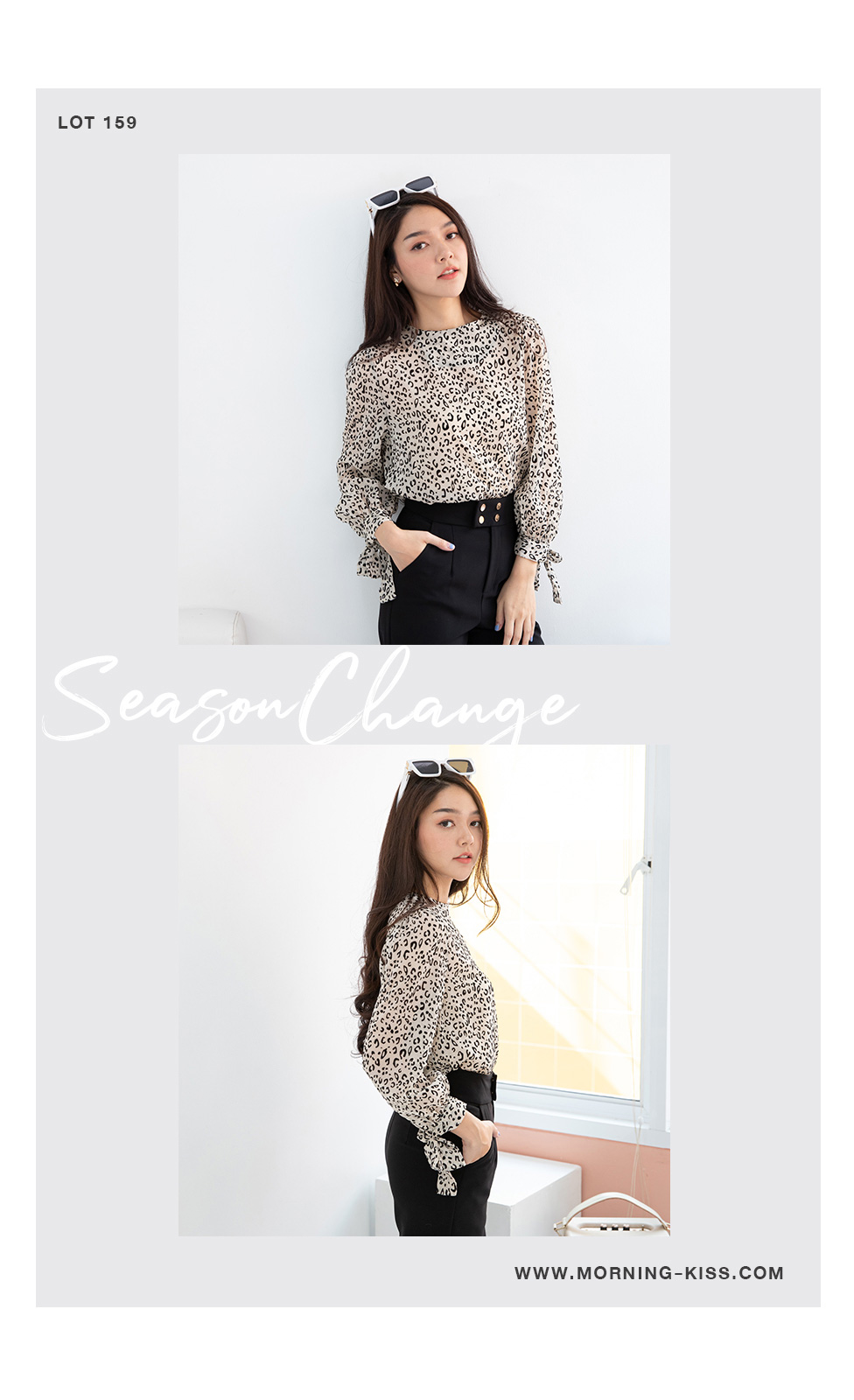 สาวเปรี้ยวแบบ smart look เสื้อแขนยาวผ้าซีฟองลายเสือ เนื้อผ้าแบบมี texture ในตัว ปลายแขนผูกเป็นโบว์น่ารักๆ แบบเรียบๆไม่เน้นดีเทลเยอะ แค่ลายผ้าก็สวยเก๋ไม่เบาอยู่แล้ว ใส่แมทกับกางเกงใส่ทำงาน ใส่เดินห้าง ได้หลายโอกาส