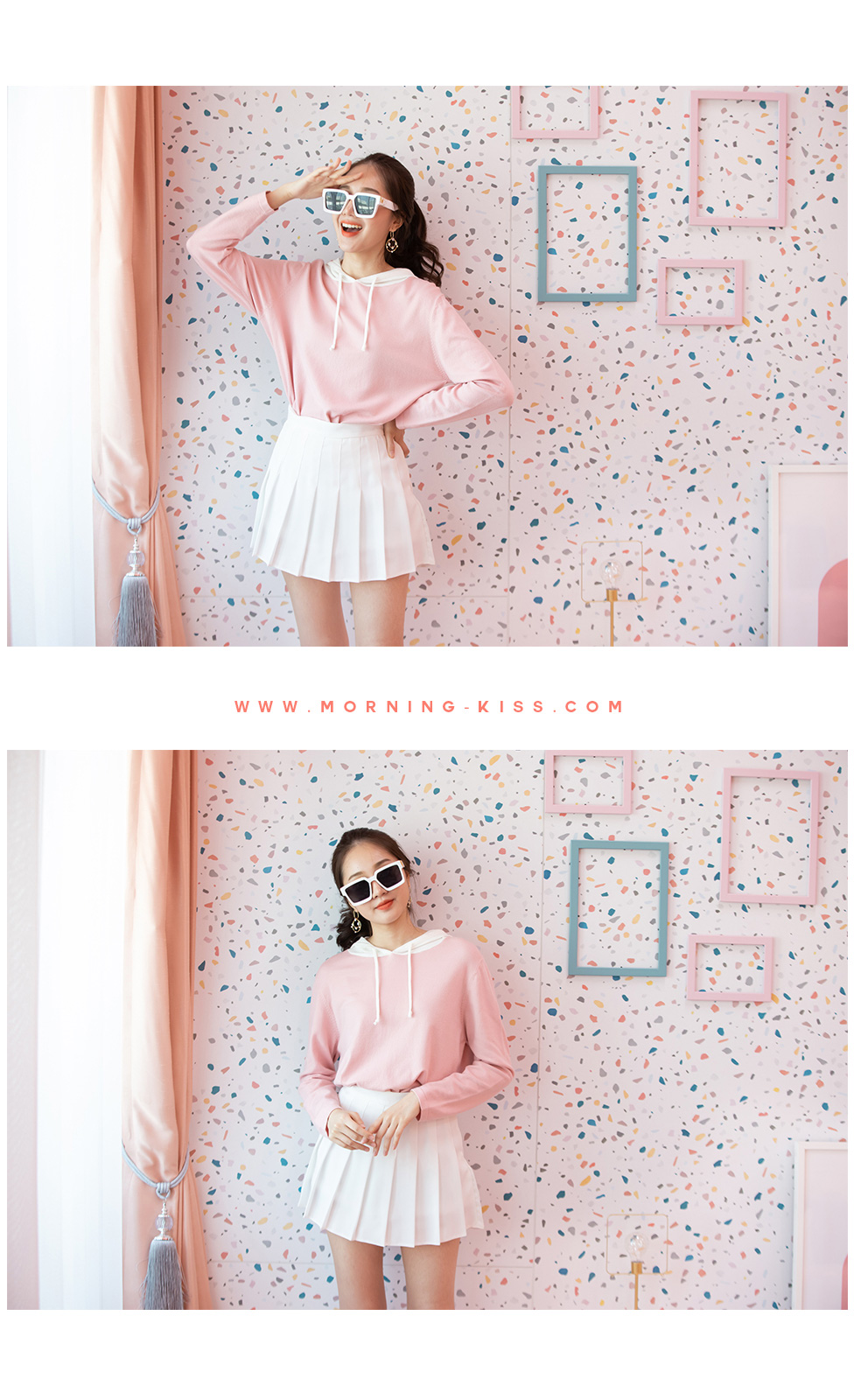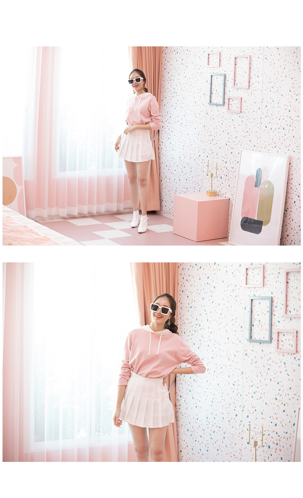 หวานเจี๊ยบกับเสื้อแบบเรียบๆสีชมพูมีฮู้ดสีขาว เนื้อผ้านุ่มนิ่มใส่สบายมากๆ รุ่นนี้เนื้อผ้าไม่หนา ใส่ในเมืองไทยลมเย็นๆหรือห้องแอร์ได้สบายๆ แมทกับกางเกงหรือกระโปรง ก็น่ารัก