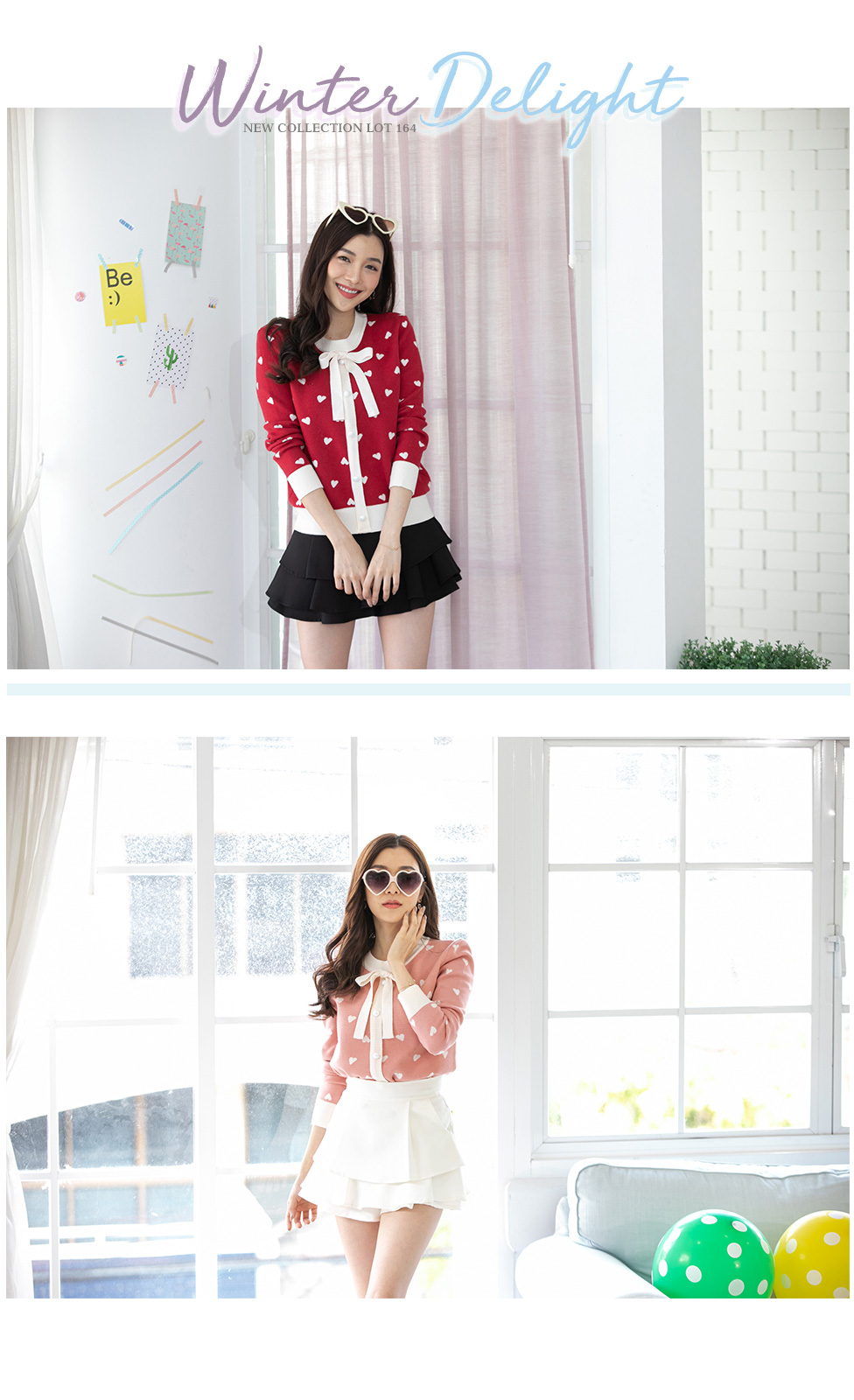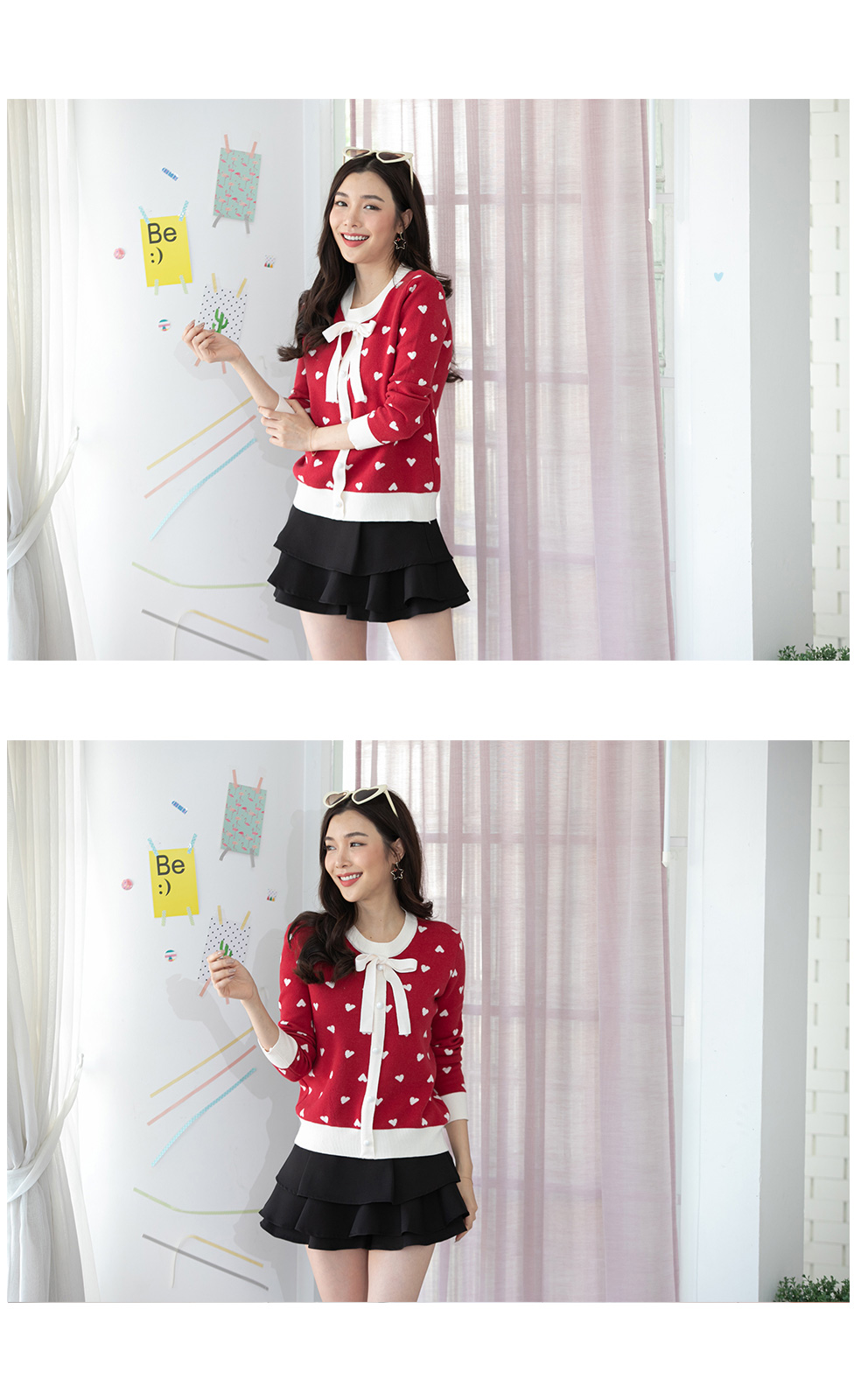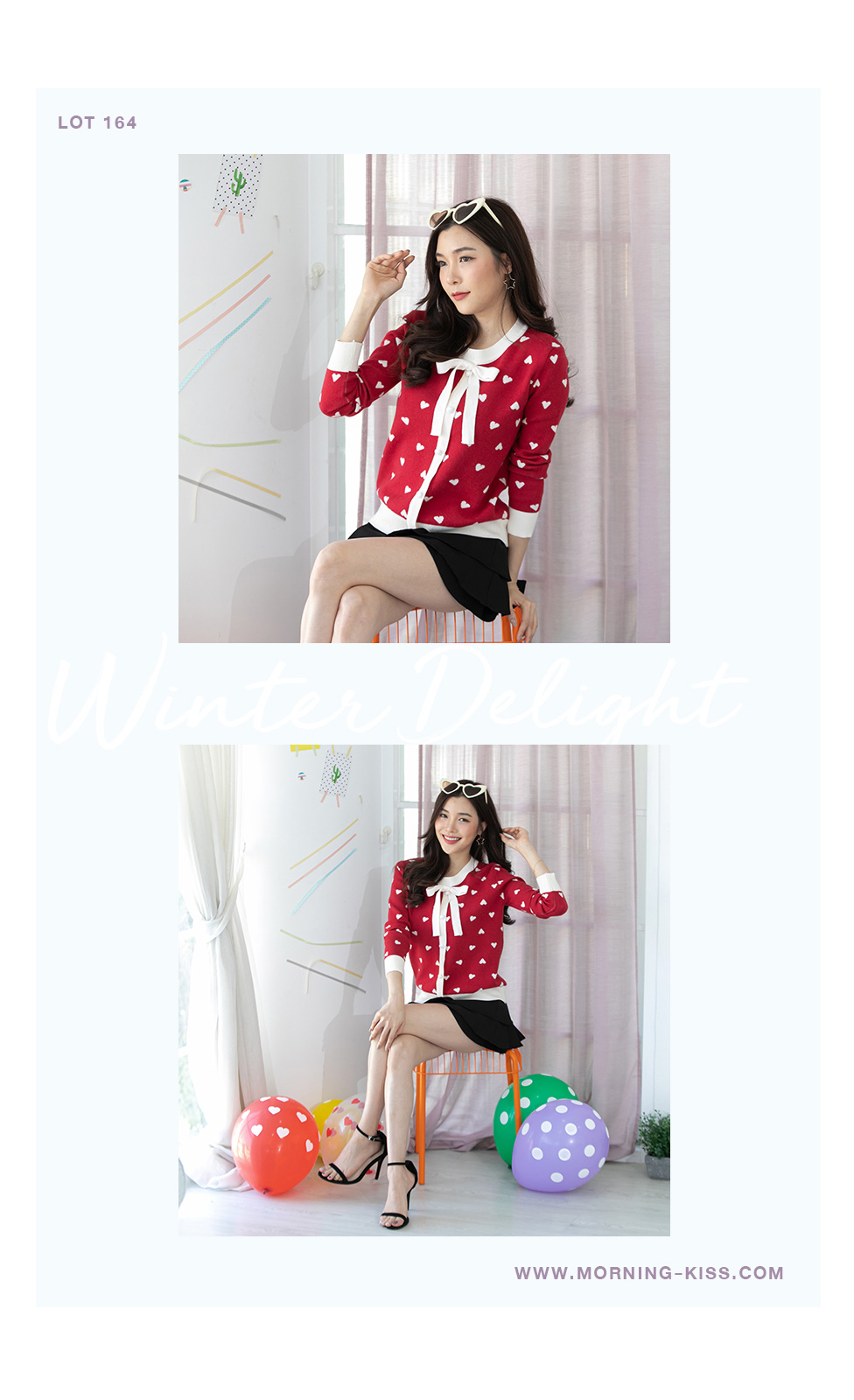 น่ารักสุดๆกับเสื้อแขนยาวงานรูปหัวใจรอบตัว ช่วงคอมีสายผูกเป็นโบว์น่ารักๆ แต่งกระดุมมุกหลอกเรียงหน้า ตัดขอบตัวเสื้อด้วยสีครีมได้สวยหวานลงตัว เนื้อผ้า Knitting เนื้อทอละเอียดแน่น อุ่นๆ ใส่แล้วไม่ระคายผิว สวยหวานขนาดนี้ หนาวนี้จัดไปไม่ผิดหวัง