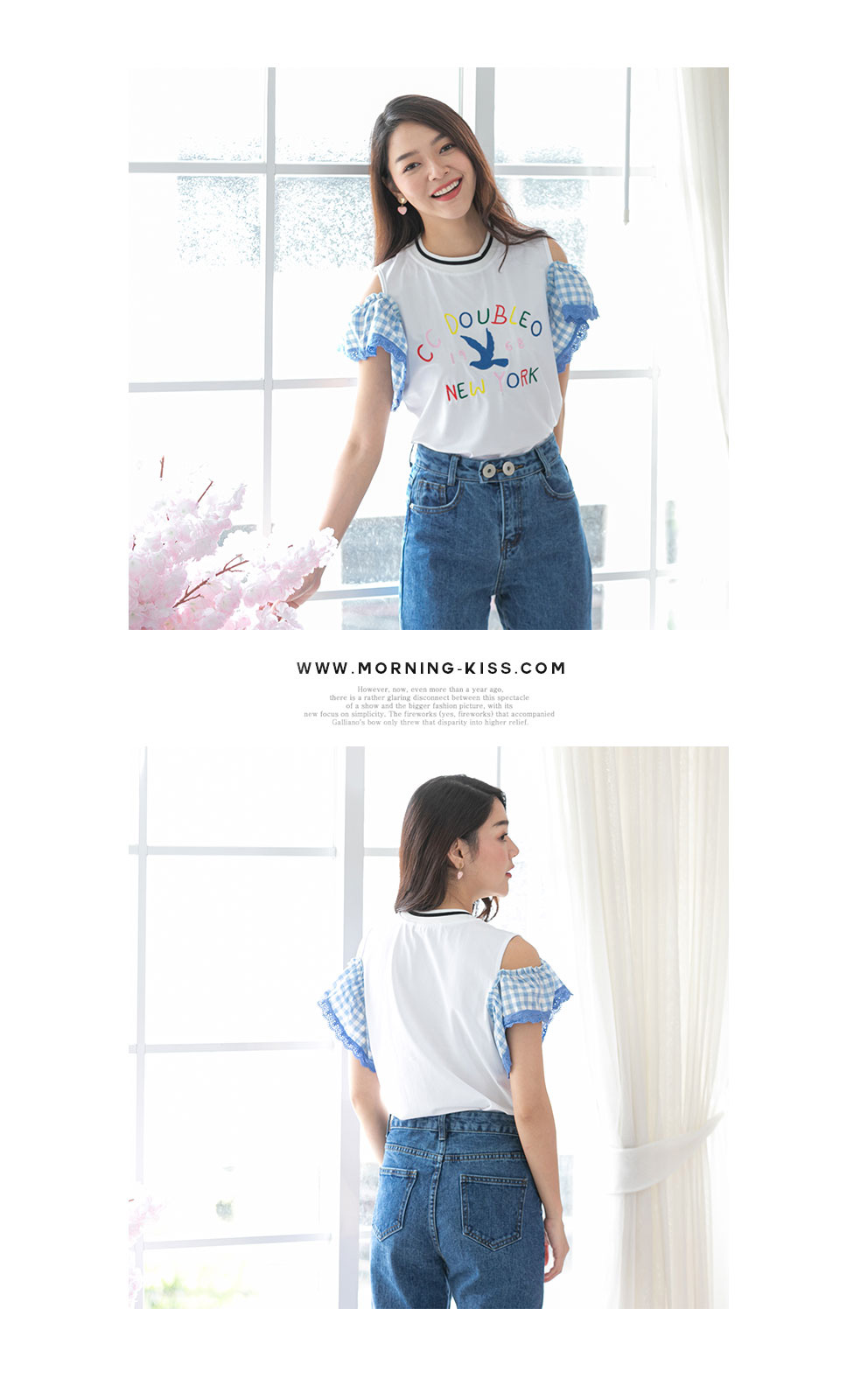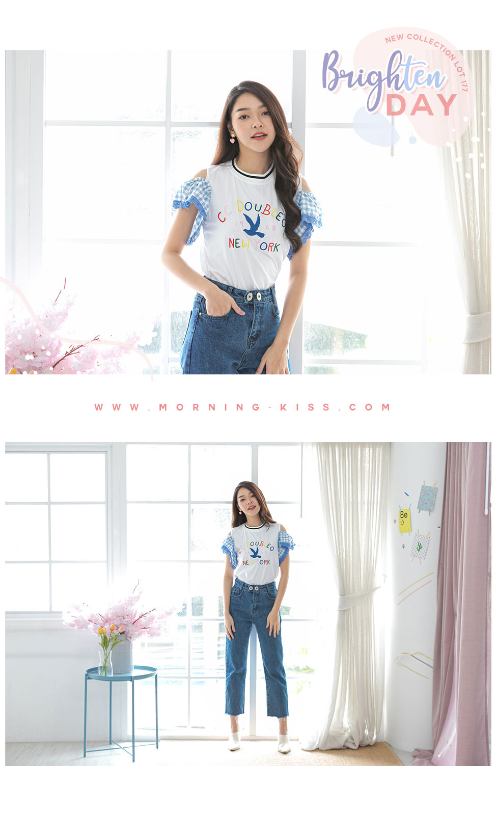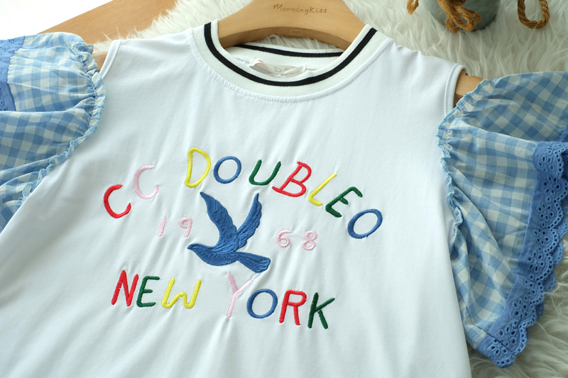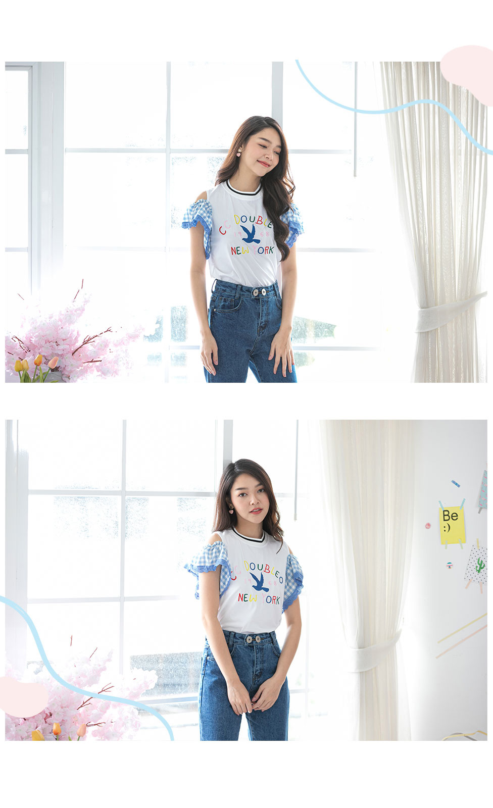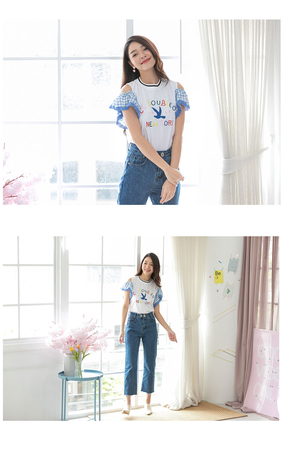 น่ารักใสๆ สไตล์หวานๆกับเสื้อเว้าไหล่แต่งระบายที่แขนด้ายผ้าลายสก็อตโทนสีฟ้า ด้านหน้าปักอักษร สีสดใส เสื้อสไตสเท่ๆปนหวานๆ เนื้อผ้า Cotton เนื้อนิ่ม ยืดได้เยอะ ใส่สบายเหมาะกับหน้าร้อน แมทกับกางเกงยีนส์สวยเท่สุดๆ