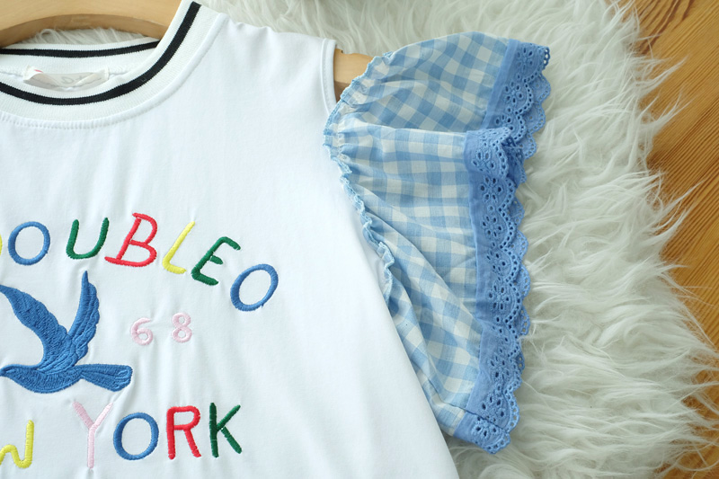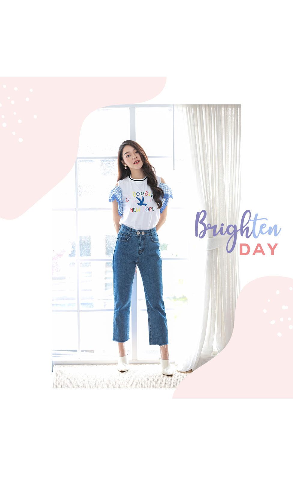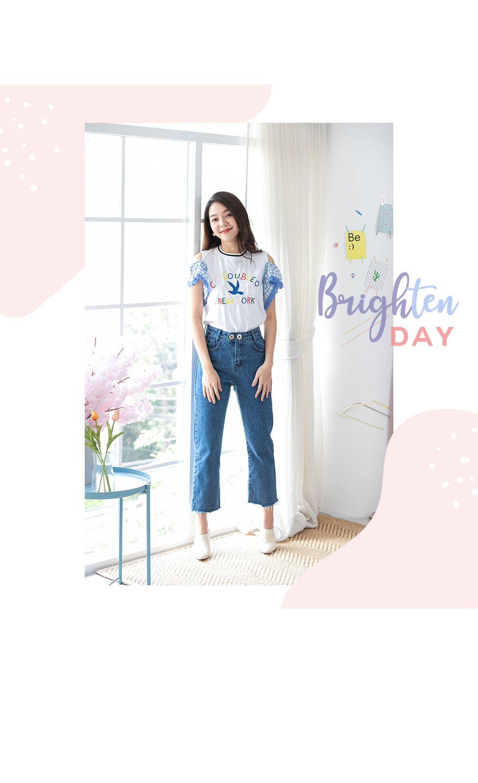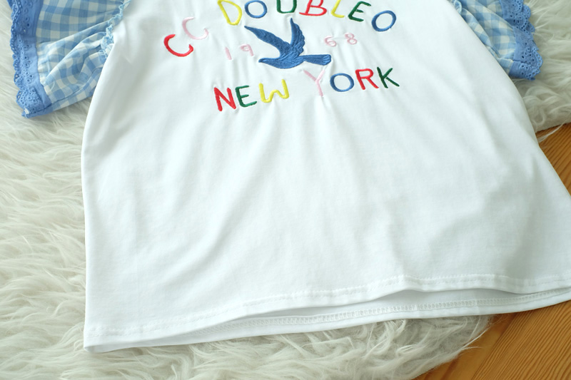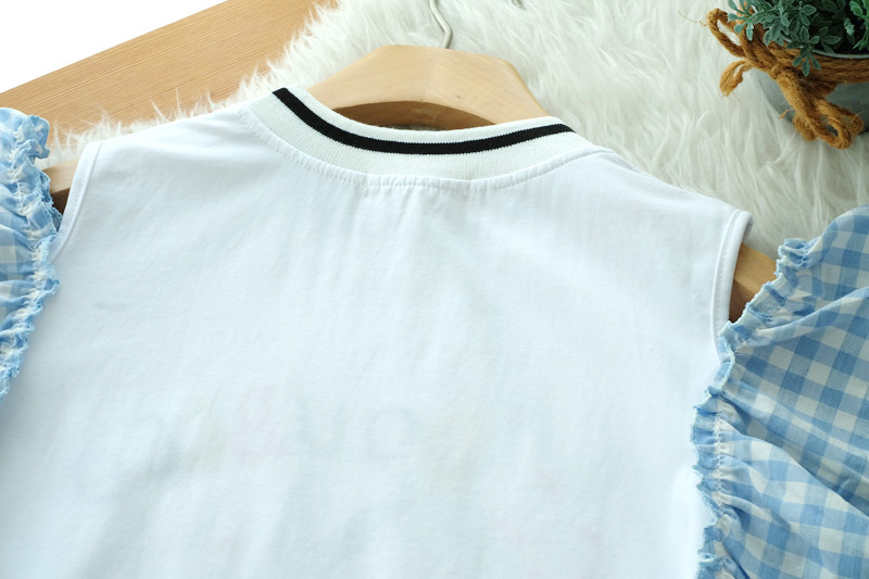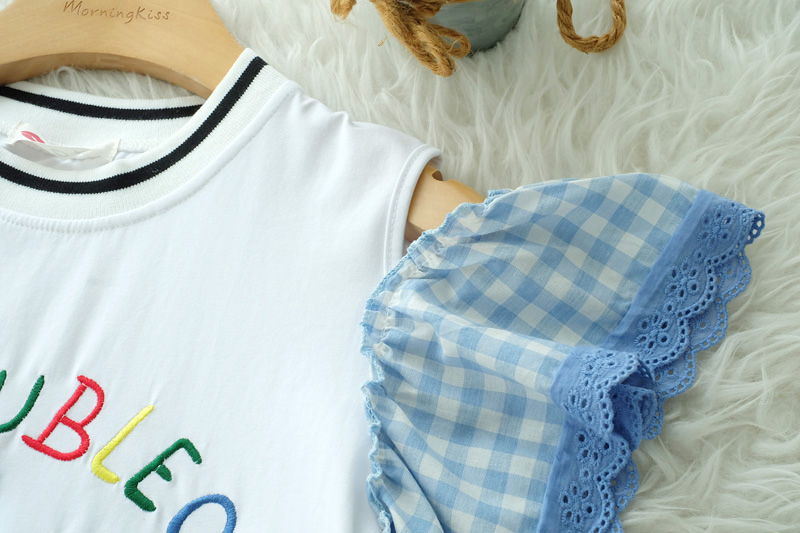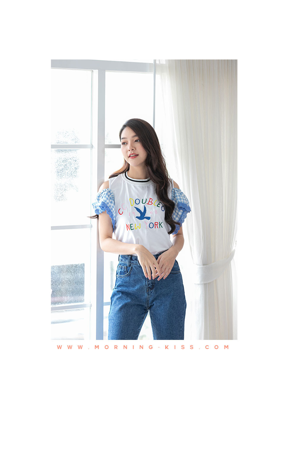 น่ารักใสๆ สไตล์หวานๆกับเสื้อเว้าไหล่แต่งระบายที่แขนด้ายผ้าลายสก็อตโทนสีฟ้า ด้านหน้าปักอักษร สีสดใส เสื้อสไตสเท่ๆปนหวานๆ เนื้อผ้า Cotton เนื้อนิ่ม ยืดได้เยอะ ใส่สบายเหมาะกับหน้าร้อน แมทกับกางเกงยีนส์สวยเท่สุดๆ