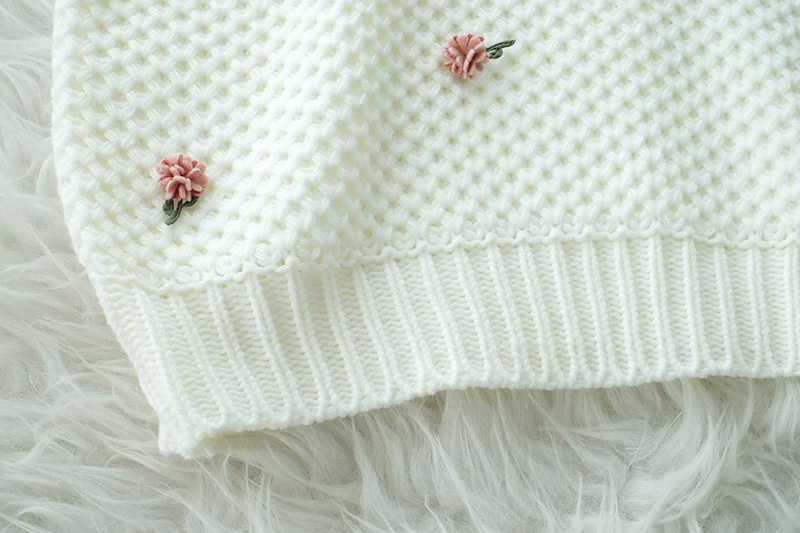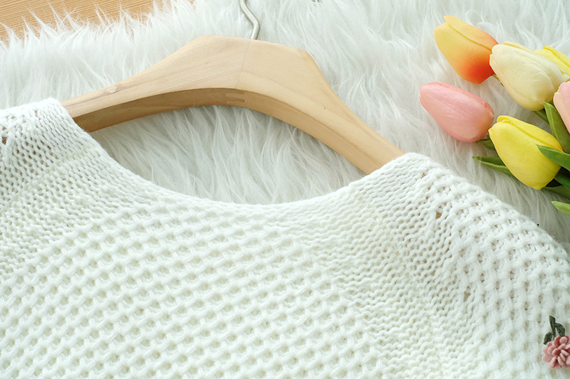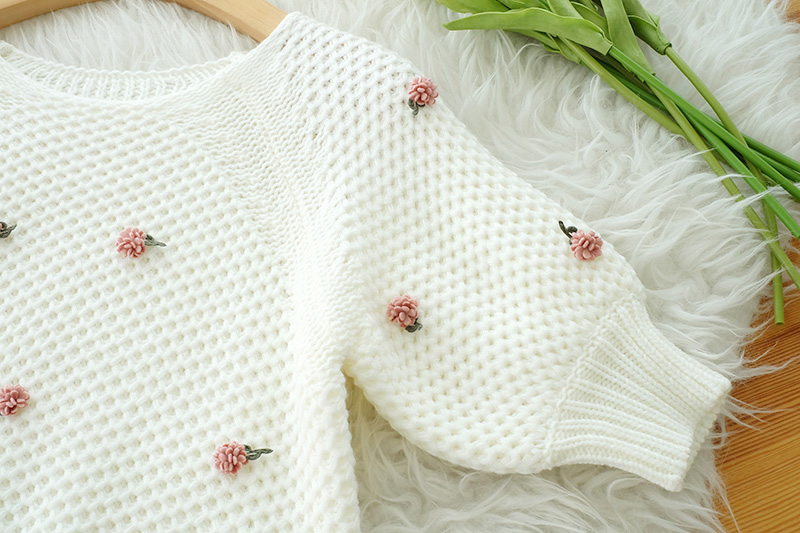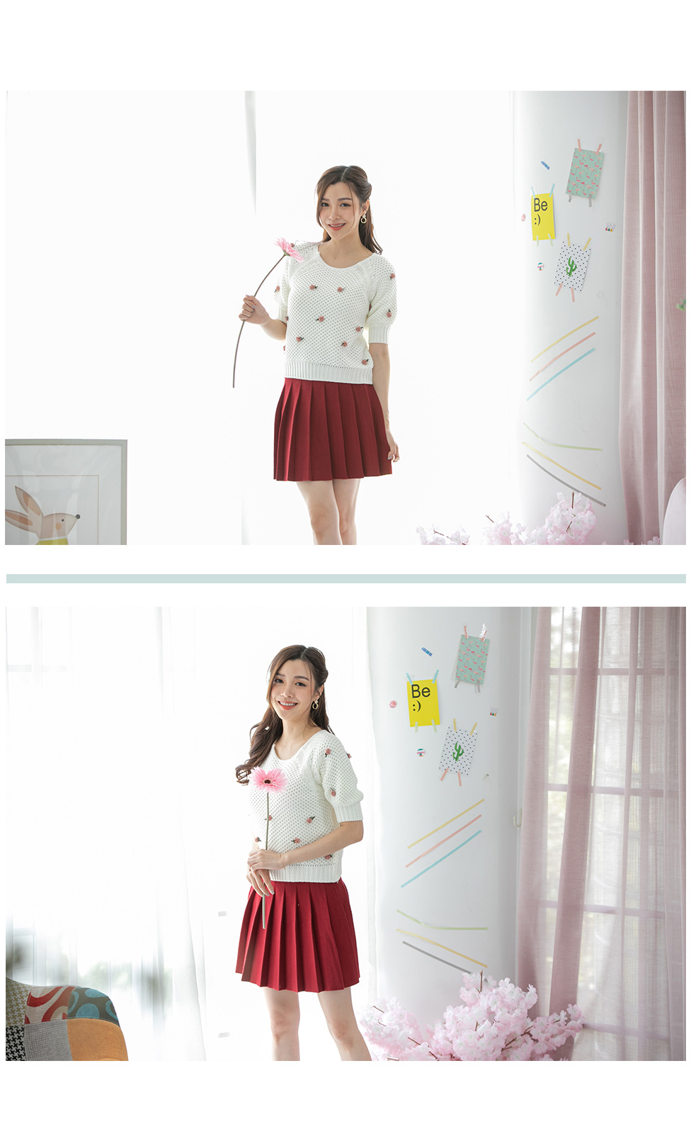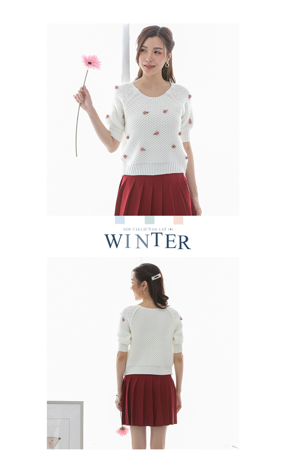 เสื้อแขนสั้นผ้าไหมพรมทอโทนสีขาว โดดเด่นที่งานถักสลับไปมา เนื้อผ้ามี texture ในตัว ติดดอกไม้ด้านหน้าเป็น 3 มิติ แบบเรียบๆหวานๆ รุ่นนี้ใส่ง่ายๆ ใส่ได้ทั้งเมืองไทยและมืองนอก แมทกับกระโปรงได้ลุคคุณหนูสุดๆ