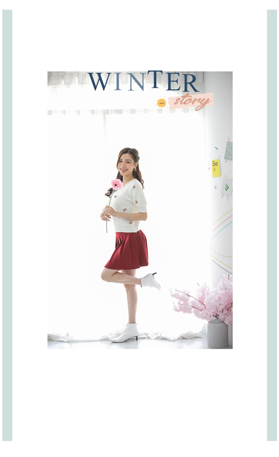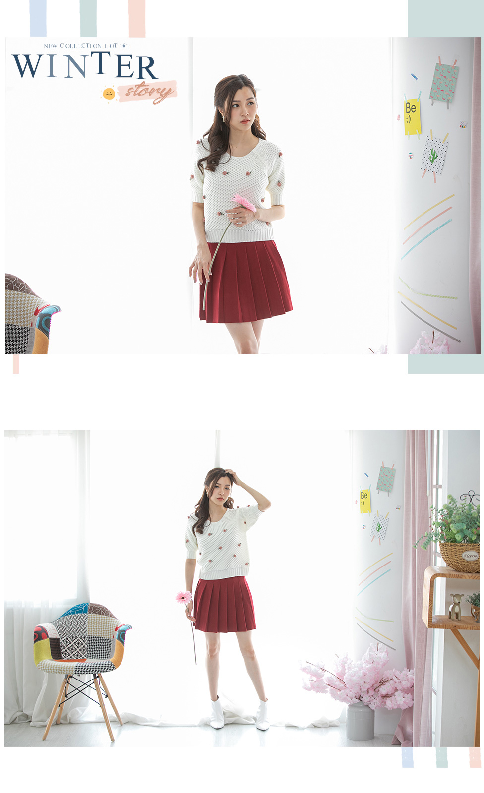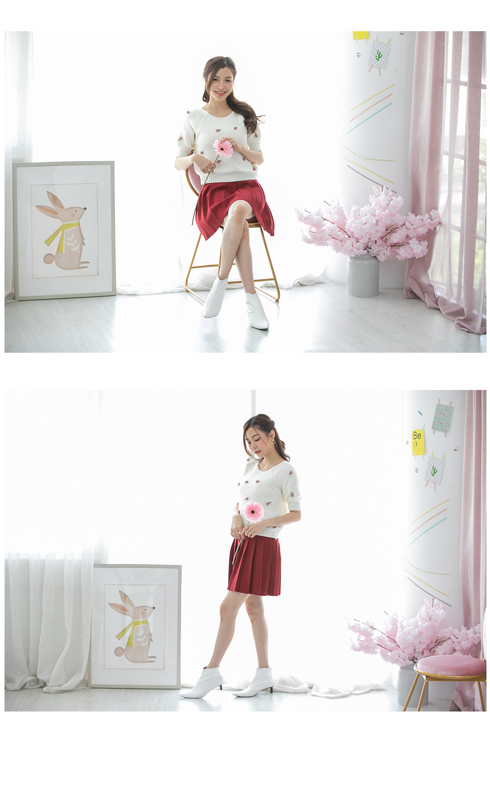 เสื้อแขนสั้นผ้าไหมพรมทอโทนสีขาว โดดเด่นที่งานถักสลับไปมา เนื้อผ้ามี texture ในตัว ติดดอกไม้ด้านหน้าเป็น 3 มิติ แบบเรียบๆหวานๆ รุ่นนี้ใส่ง่ายๆ ใส่ได้ทั้งเมืองไทยและมืองนอก แมทกับกระโปรงได้ลุคคุณหนูสุดๆ