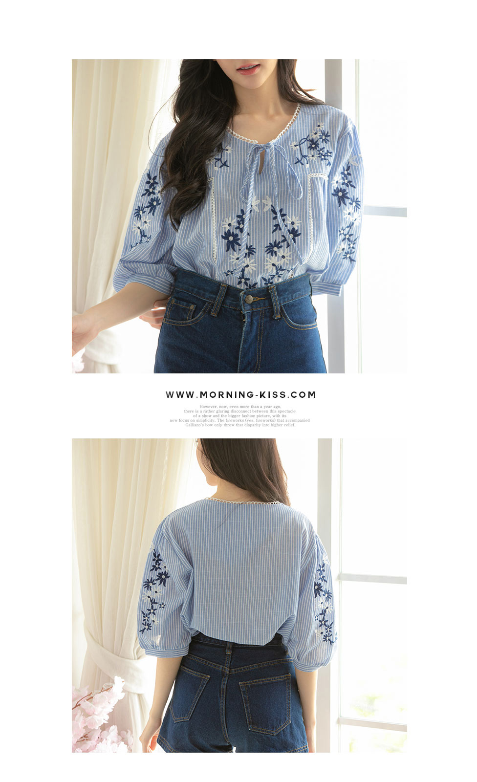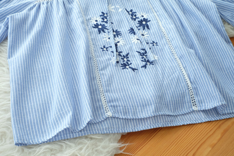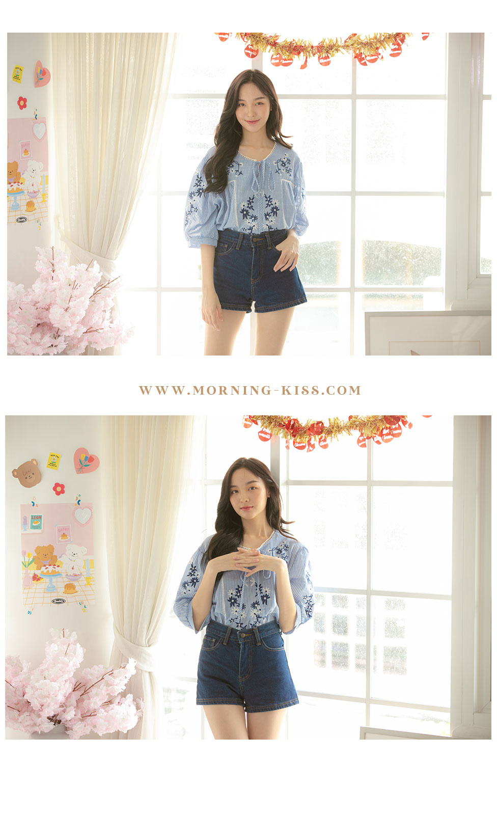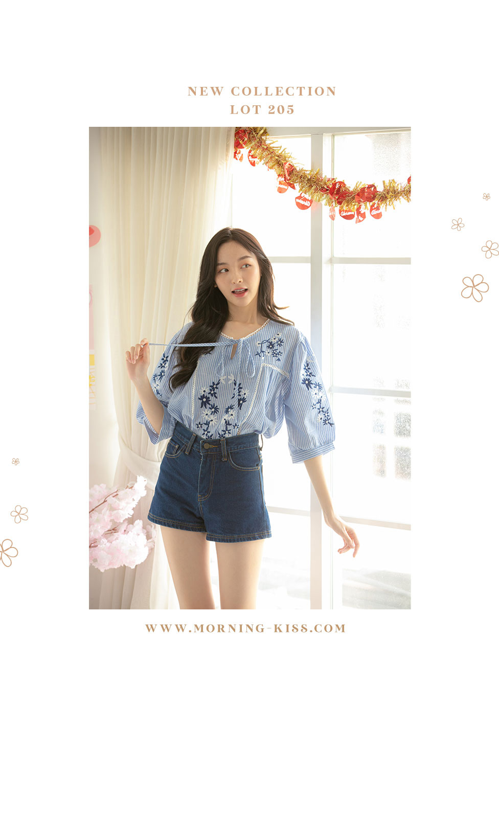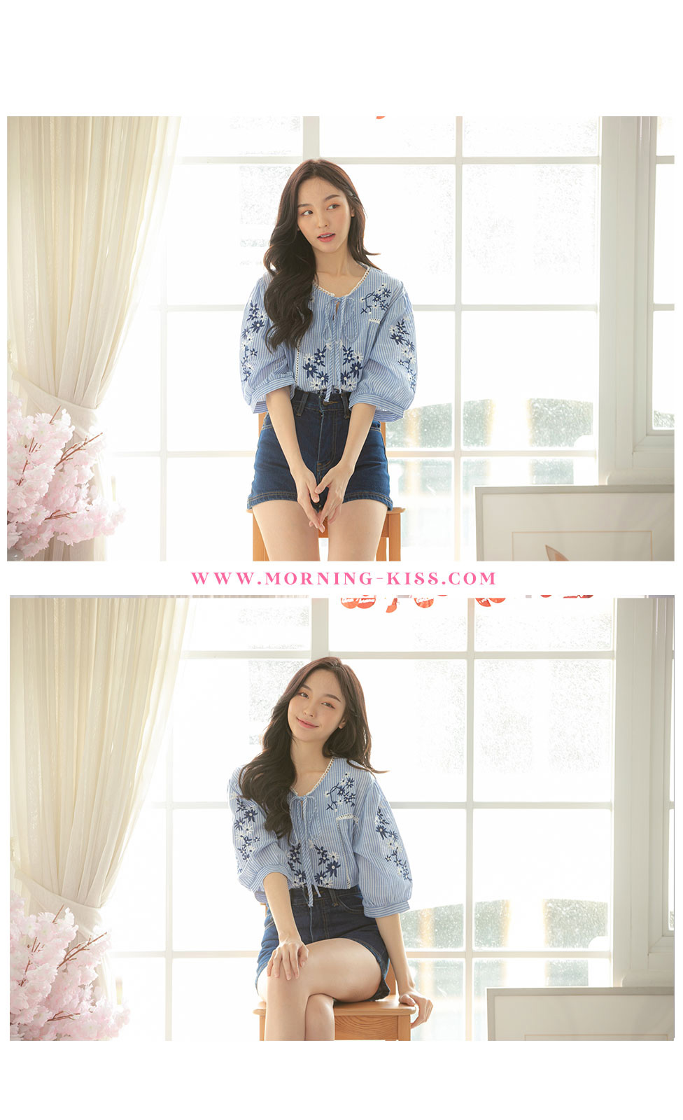 รุ่นนี้น่ารักมากกก ใครชอบสไสตส์โบฮีเมียนจัดด่วนเลยค่า เสื้อสีฟ้าลายริ้วสีขาวเล็กๆ งานปักดอกไม้ด้านหน้าและช่วงแขนแขนทำพองๆ ช่วงคอมีสายผูกน่ารักๆ ใส่เป็นทรงปล่อยๆ เนื้อผ้า Cotton เนื้อดีไม่แข็ง ดีเทลน่ารักๆอัดแน่น แมทได้ทั้งขาสั้นและขายาว