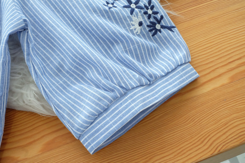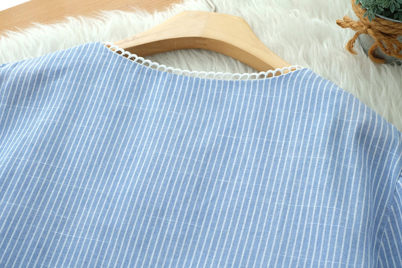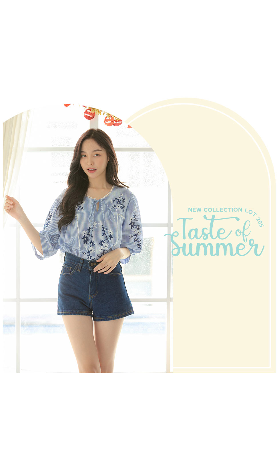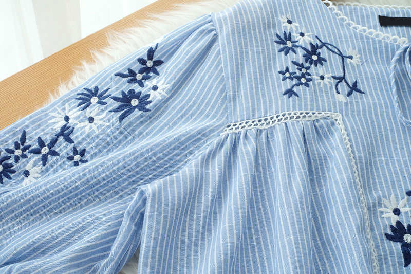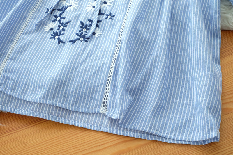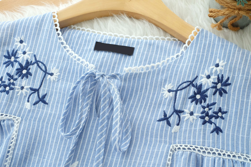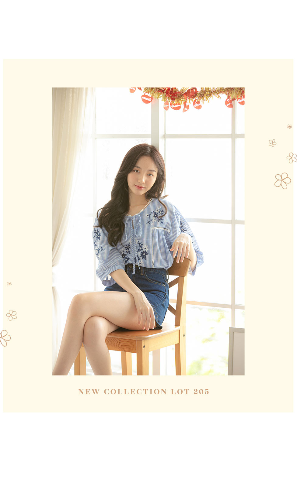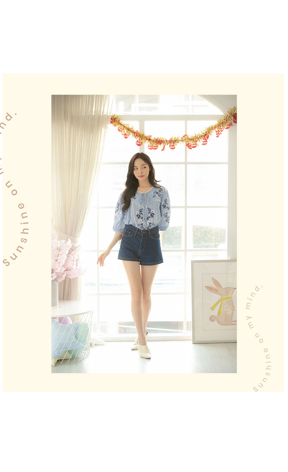 รุ่นนี้น่ารักมากกก ใครชอบสไสตส์โบฮีเมียนจัดด่วนเลยค่า เสื้อสีฟ้าลายริ้วสีขาวเล็กๆ งานปักดอกไม้ด้านหน้าและช่วงแขนแขนทำพองๆ ช่วงคอมีสายผูกน่ารักๆ ใส่เป็นทรงปล่อยๆ เนื้อผ้า Cotton เนื้อดีไม่แข็ง ดีเทลน่ารักๆอัดแน่น แมทได้ทั้งขาสั้นและขายาว