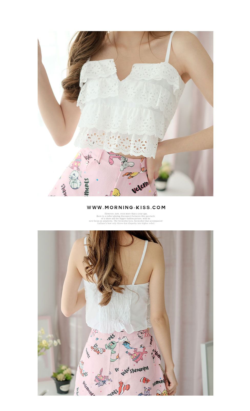 เสื้อสายเดี่ยวสีขาวเป็นผ้าฉลุลายลูกไม้เนื้อดีทำระบายหยักๆ 3 ชั้น แบบหวานซ่อนเปรี้ยว ทรงสายเดี่ยว สม็อคด้านหลัง รุ่นนี้ใส่เป็นเสื้อตัวในแมทกับเสื้อคลุมก็ได้ หรือใส่เดี่ยวแมทกับกระโปรงแบบนางแบบก็น่ารักๆดูสวยใสมากเลยค่ะ