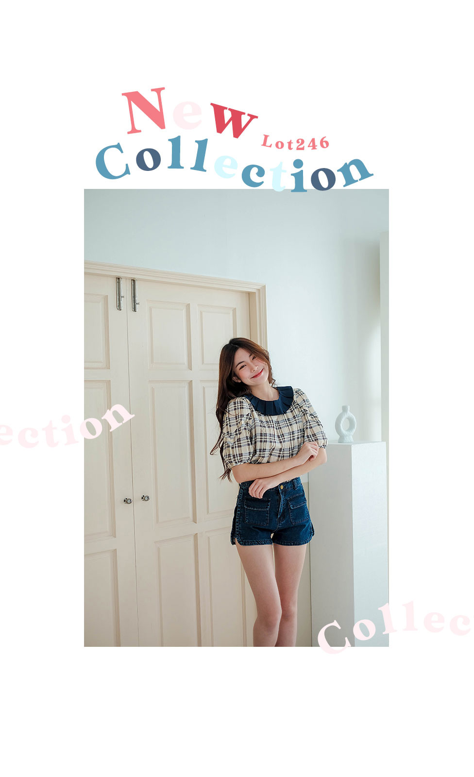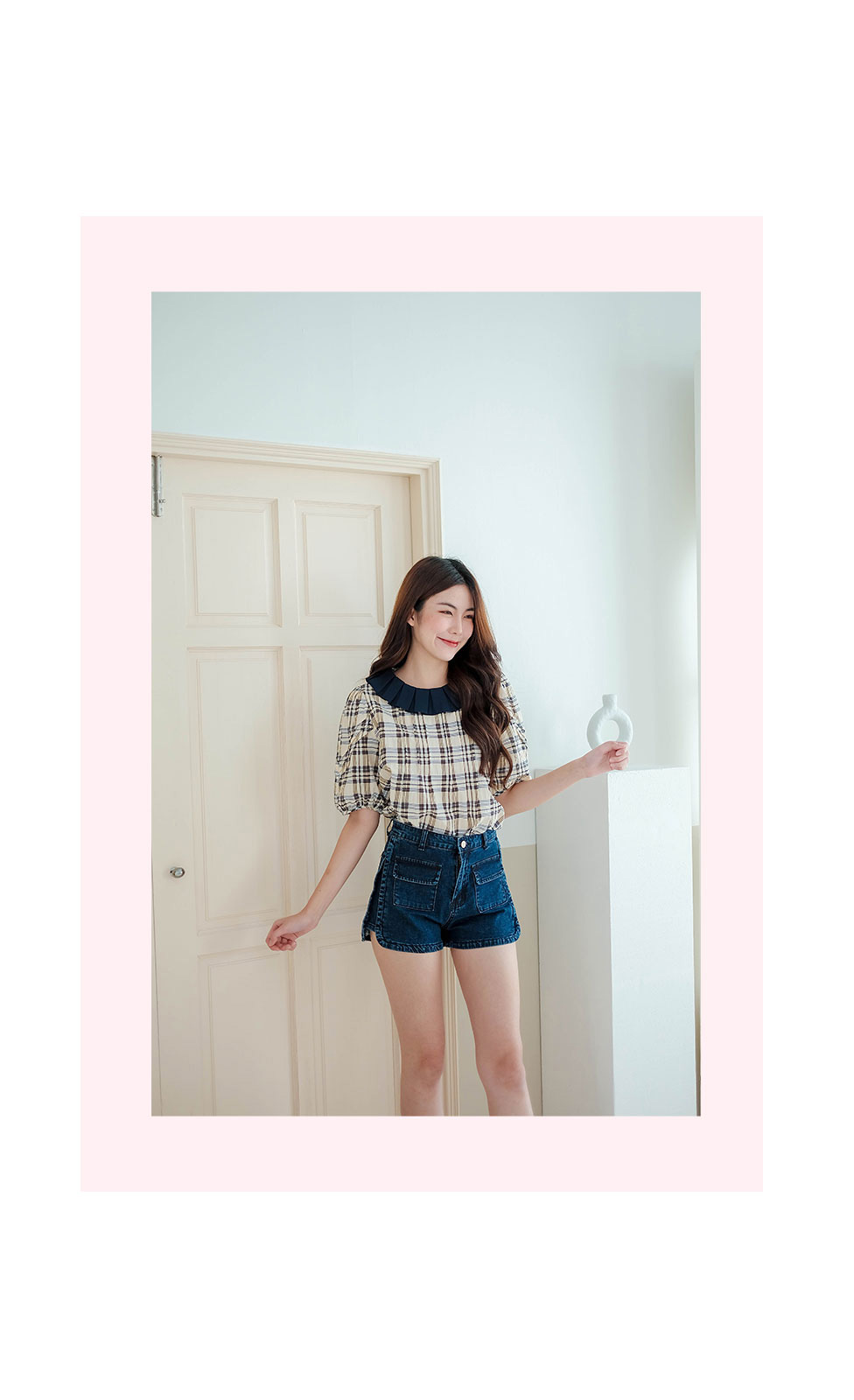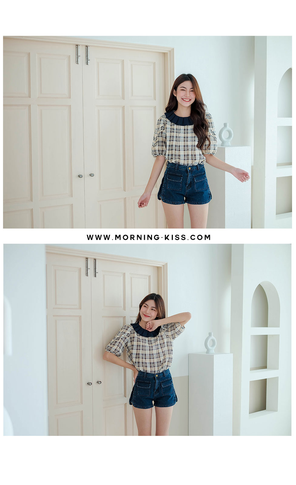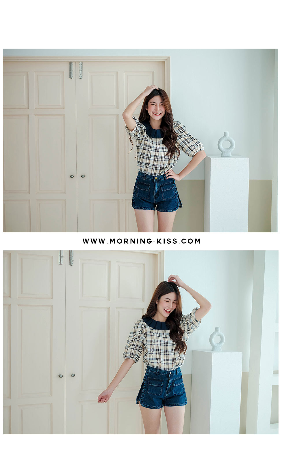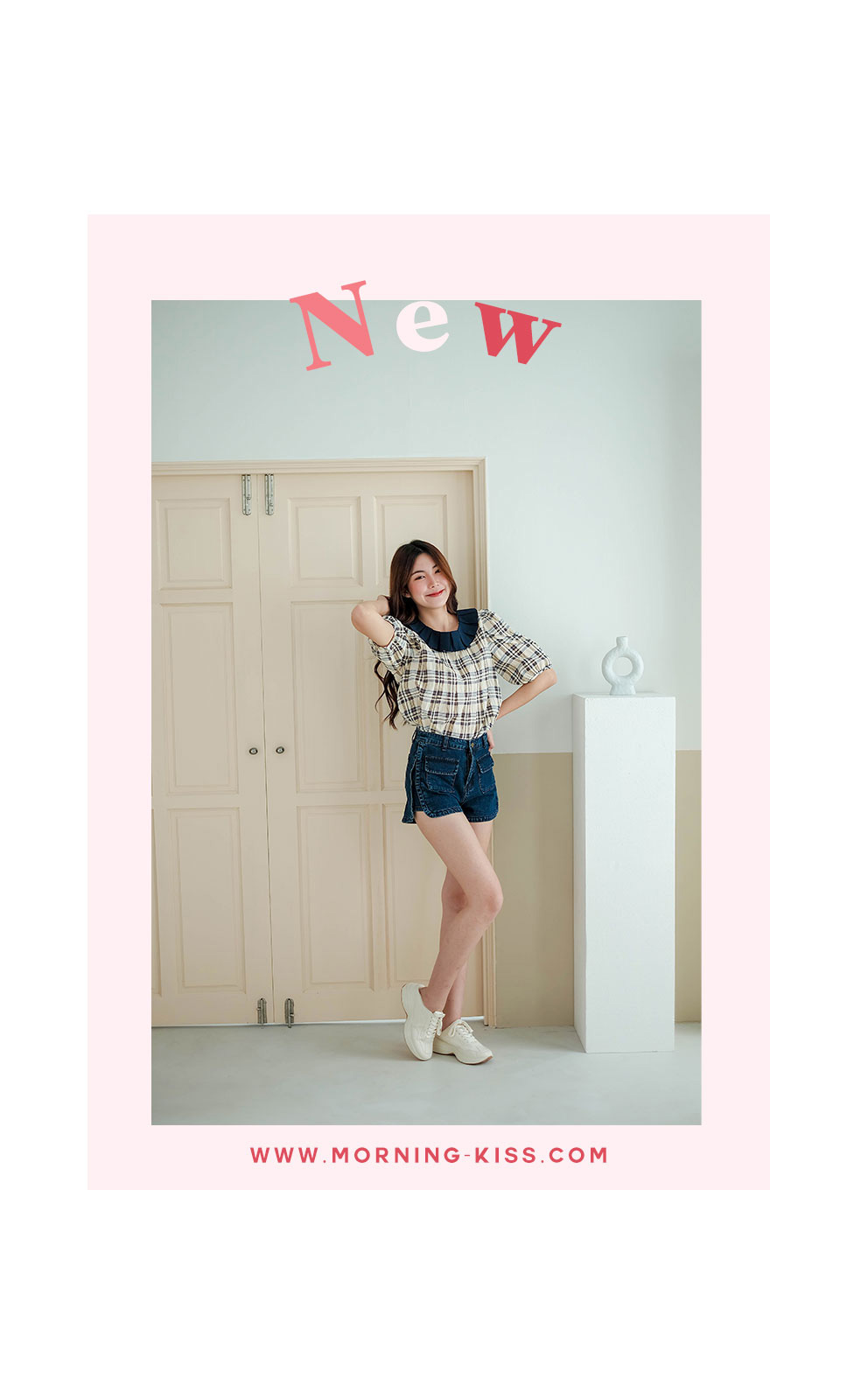 ไอเท็มแนะนำที่ไม่ควรพลาด น่ารักมาก เสื้อแขนสั้นลายสก็อตสีครีม ช่วงคอดีไซน์เย็บแบบจับจีบเก๋ๆ เนื่อผ้าแบบมี texture ในตัว ทรงตัวปล่อยๆ แมทกับกระโปรงหรือกางเกงก็น่ารัก ไอเท็มนี้แนะนำเลย รุ่นนี้สไตส์นี้ใส่ได้ตลอดๆนะคะ