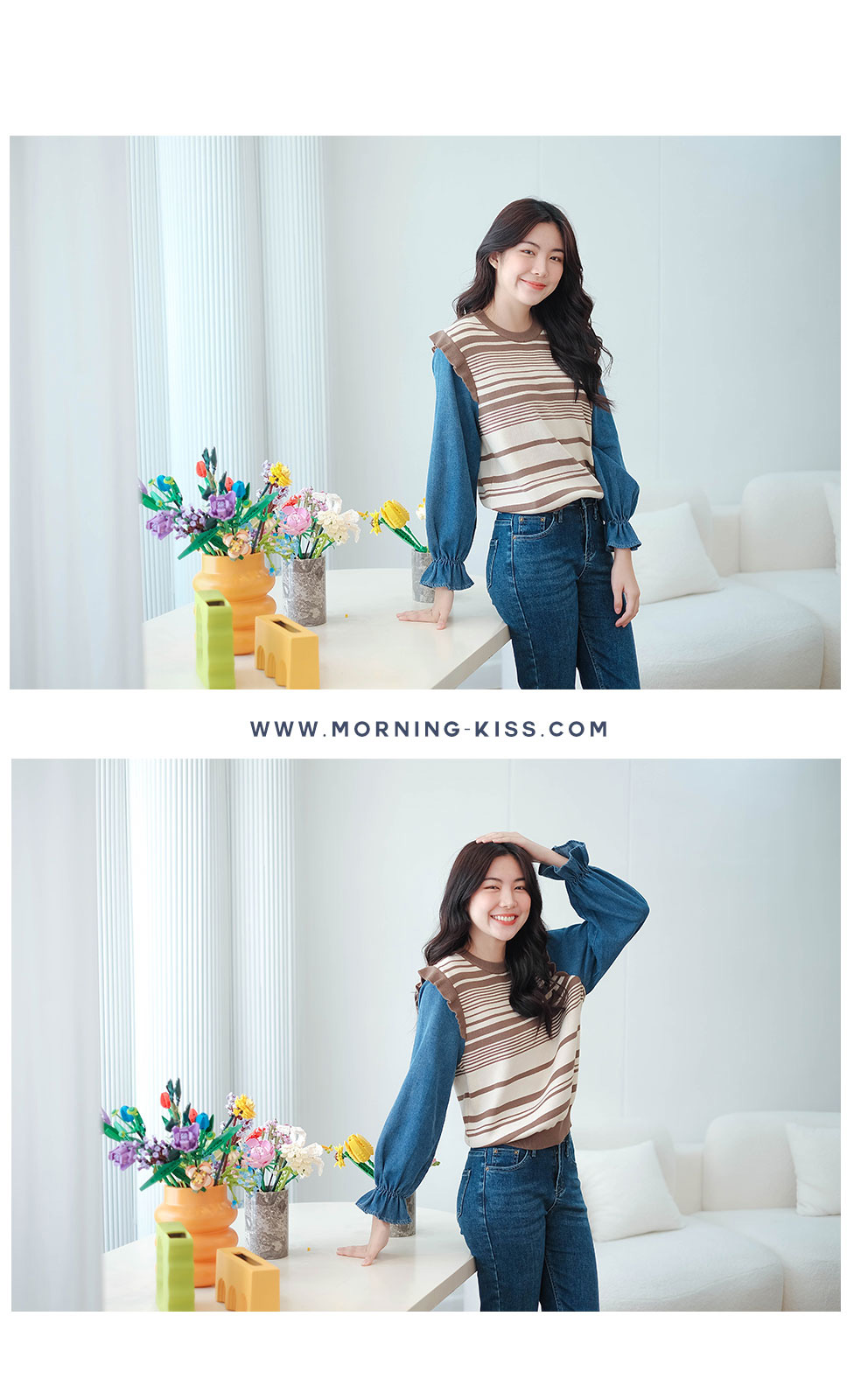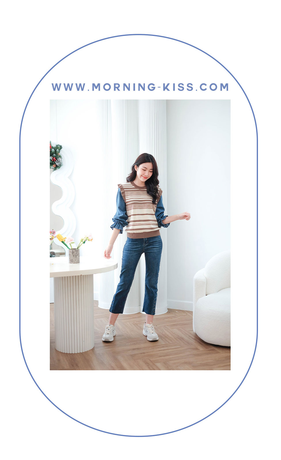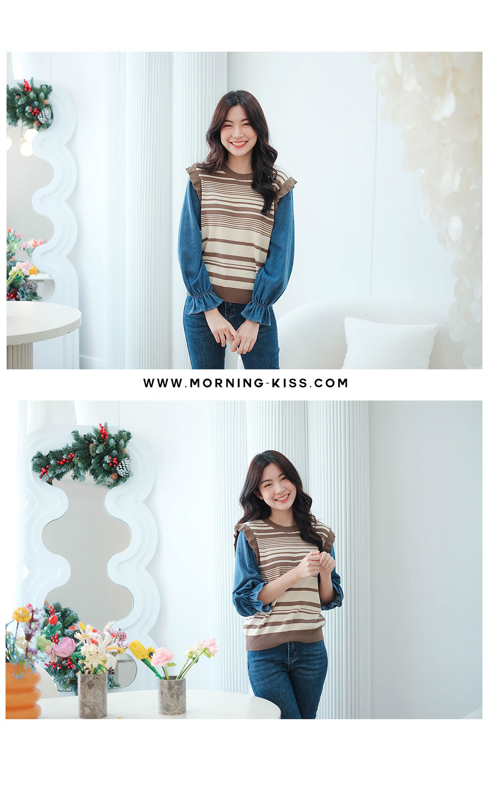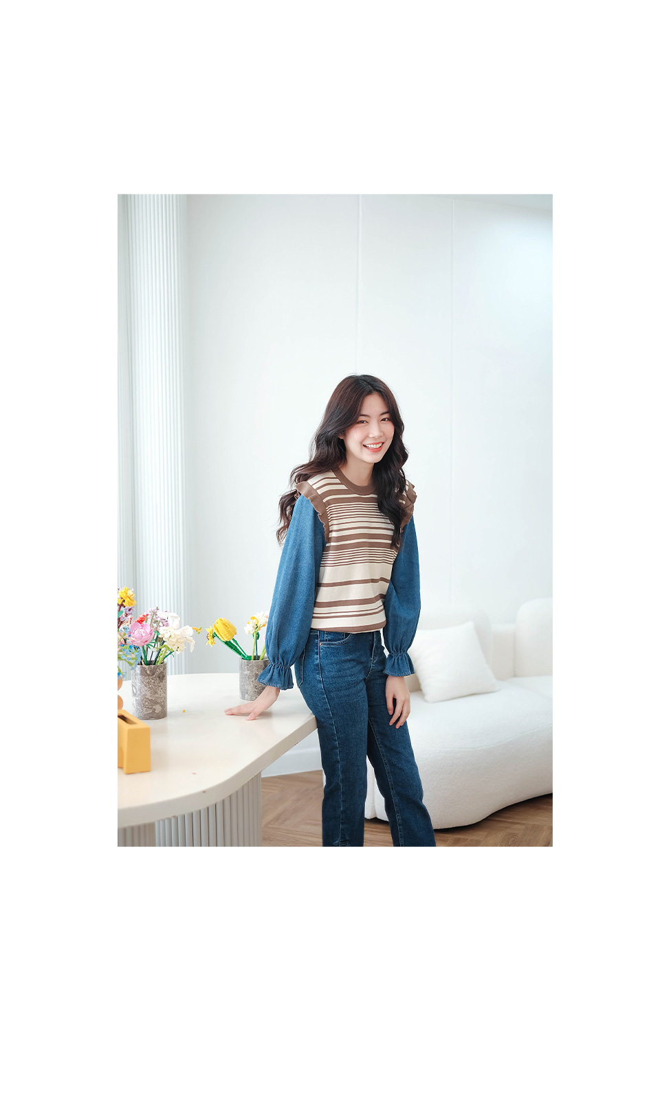 ลุคชิคๆ เท่ๆ กับตัวเสื้อเป็นผ้า knitting เนื้อบางเบาใส่สบาย เนื้อนิ่มๆ ลายริ้วครีมสลับน้ำตาลต้นแขนทำระบายเล็กๆ ช่วงแขนต่อผ้ายีนส์ แบบเรียบๆใส่ได้ตลอด