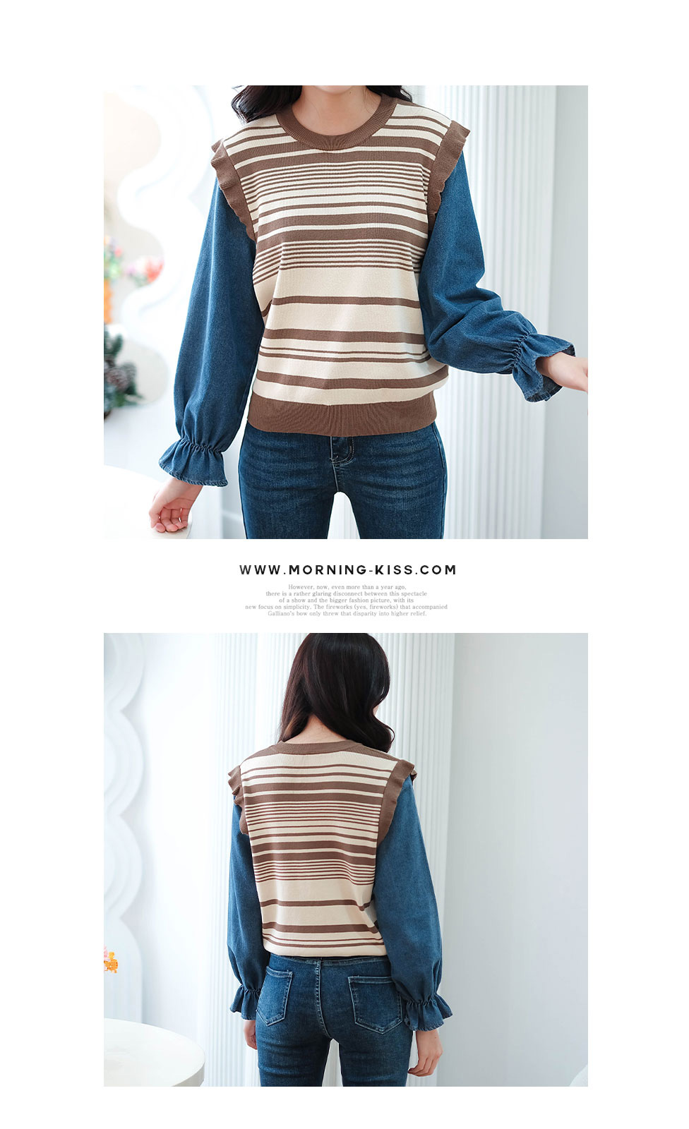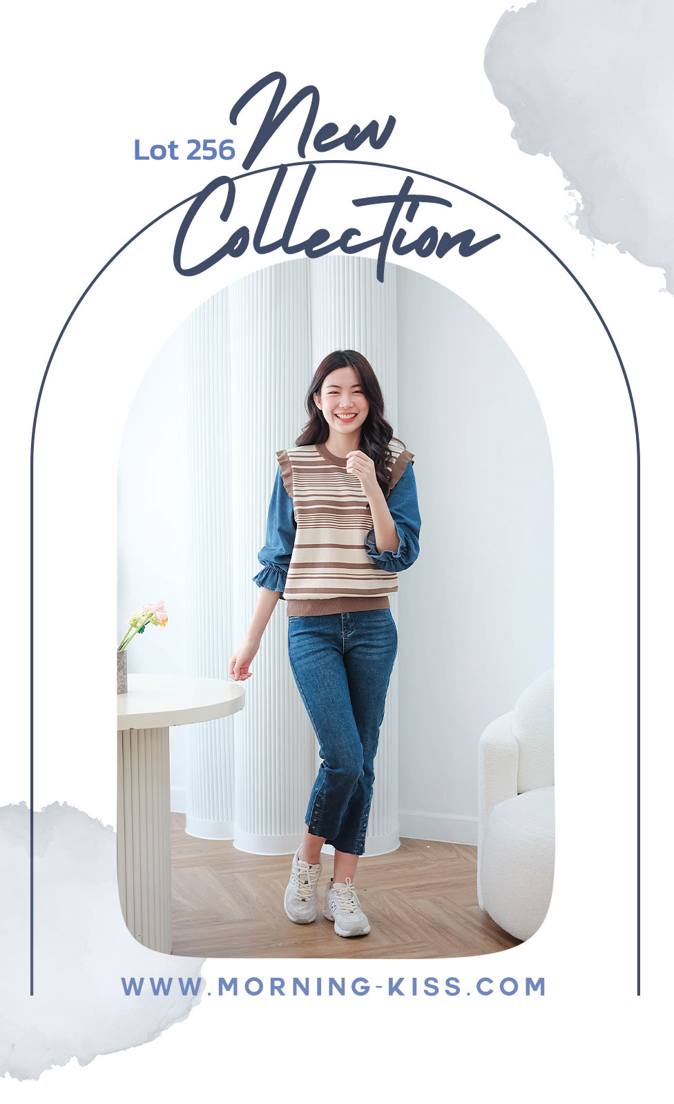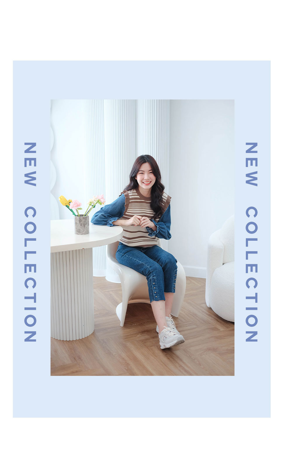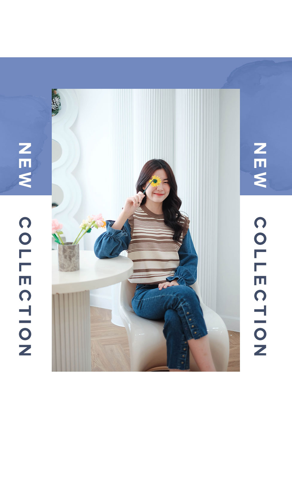 ลุคชิคๆ เท่ๆ กับตัวเสื้อเป็นผ้า knitting เนื้อบางเบาใส่สบาย เนื้อนิ่มๆ ลายริ้วครีมสลับน้ำตาลต้นแขนทำระบายเล็กๆ ช่วงแขนต่อผ้ายีนส์ แบบเรียบๆใส่ได้ตลอด