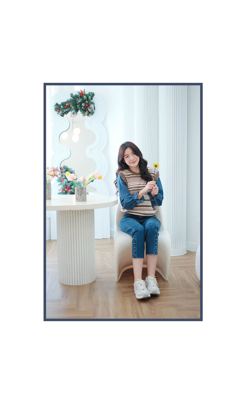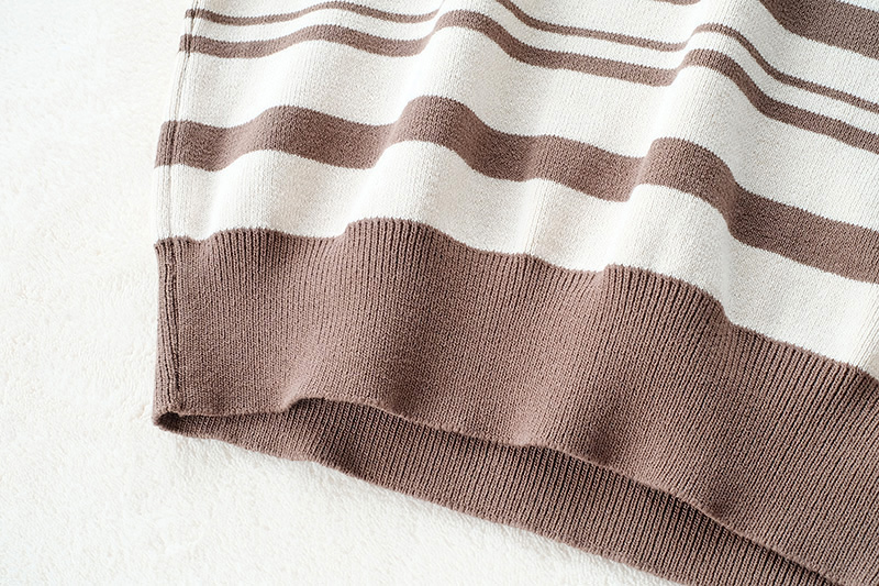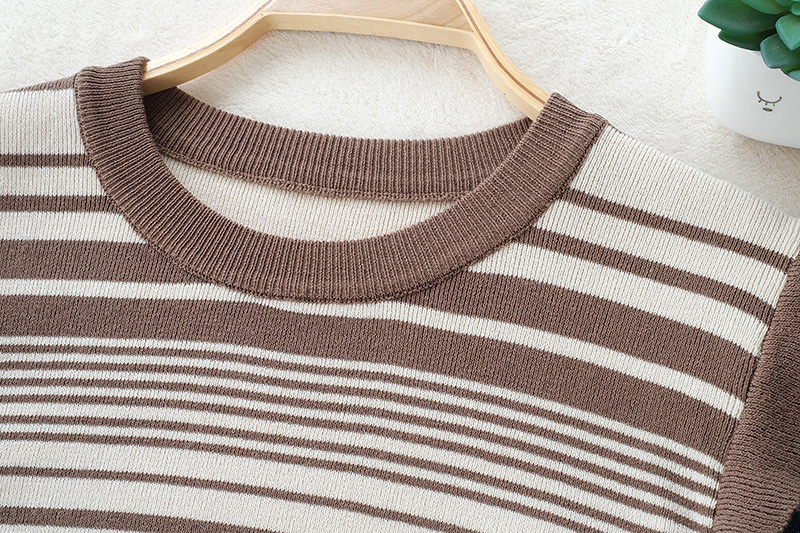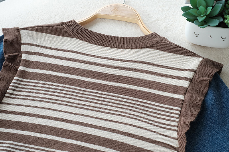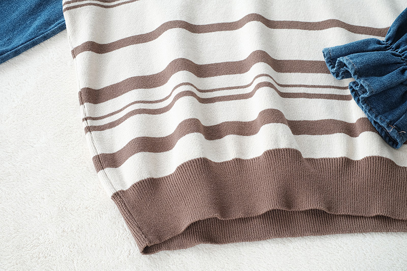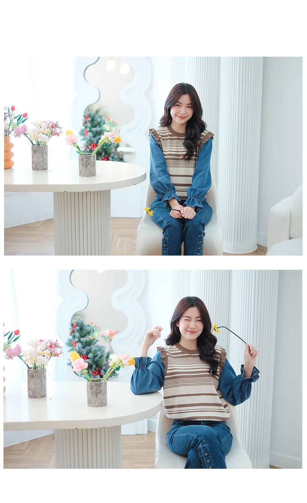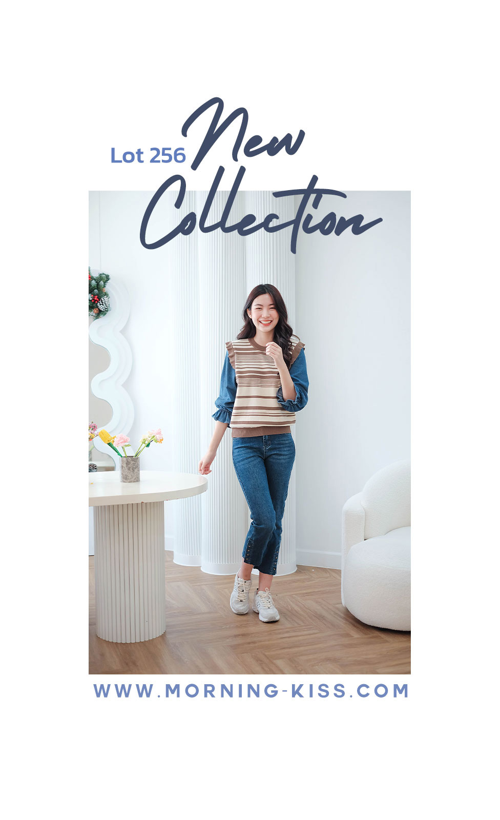 ลุคชิคๆ เท่ๆ กับตัวเสื้อเป็นผ้า knitting เนื้อบางเบาใส่สบาย เนื้อนิ่มๆ ลายริ้วครีมสลับน้ำตาลต้นแขนทำระบายเล็กๆ ช่วงแขนต่อผ้ายีนส์ แบบเรียบๆใส่ได้ตลอด