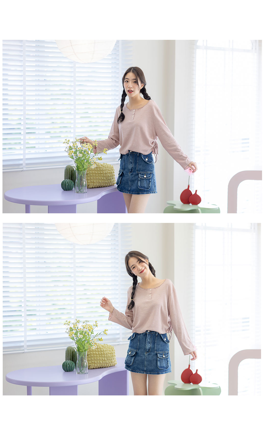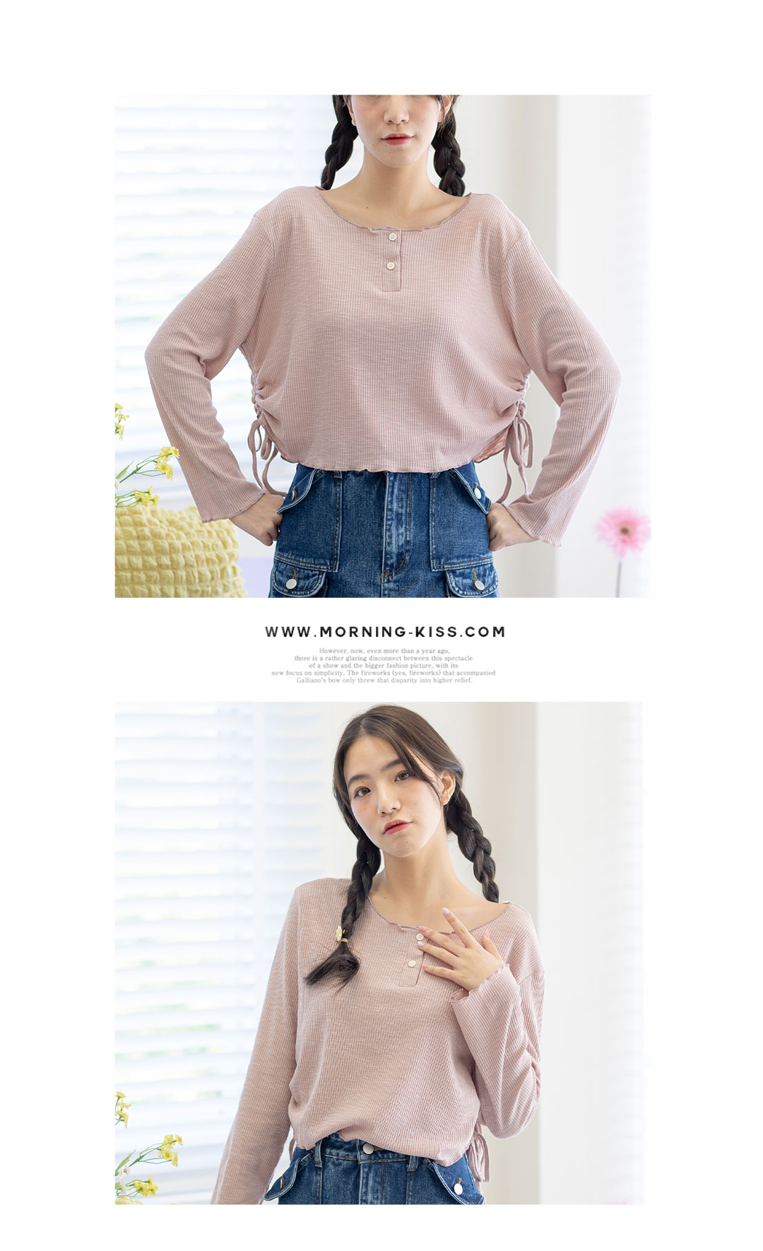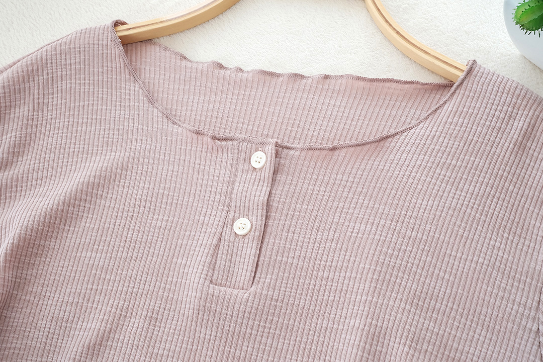 เสื้อแบบเรียบๆ สไตส์ Y2K แขนยาวโทนสีชมพูหม่น เนื้อผ้าล่อนเนื้อนิ่มใส่สบาย กระดุมคอด้านหน้า เก๋ๆด้วยด้านข้างเป็นแบบรูดดึงขึ้นมาตามสไตส์ชิคๆ แบบเรียบๆไม่เน้นดีเทลเยอะ แมทกับยีนส์ืรับประกันได้ลุควัยรุ่นแน่นอน