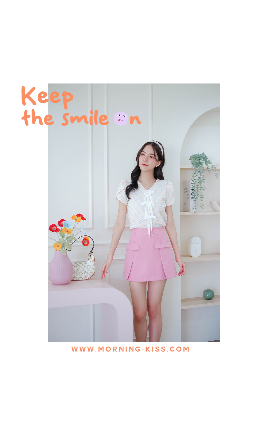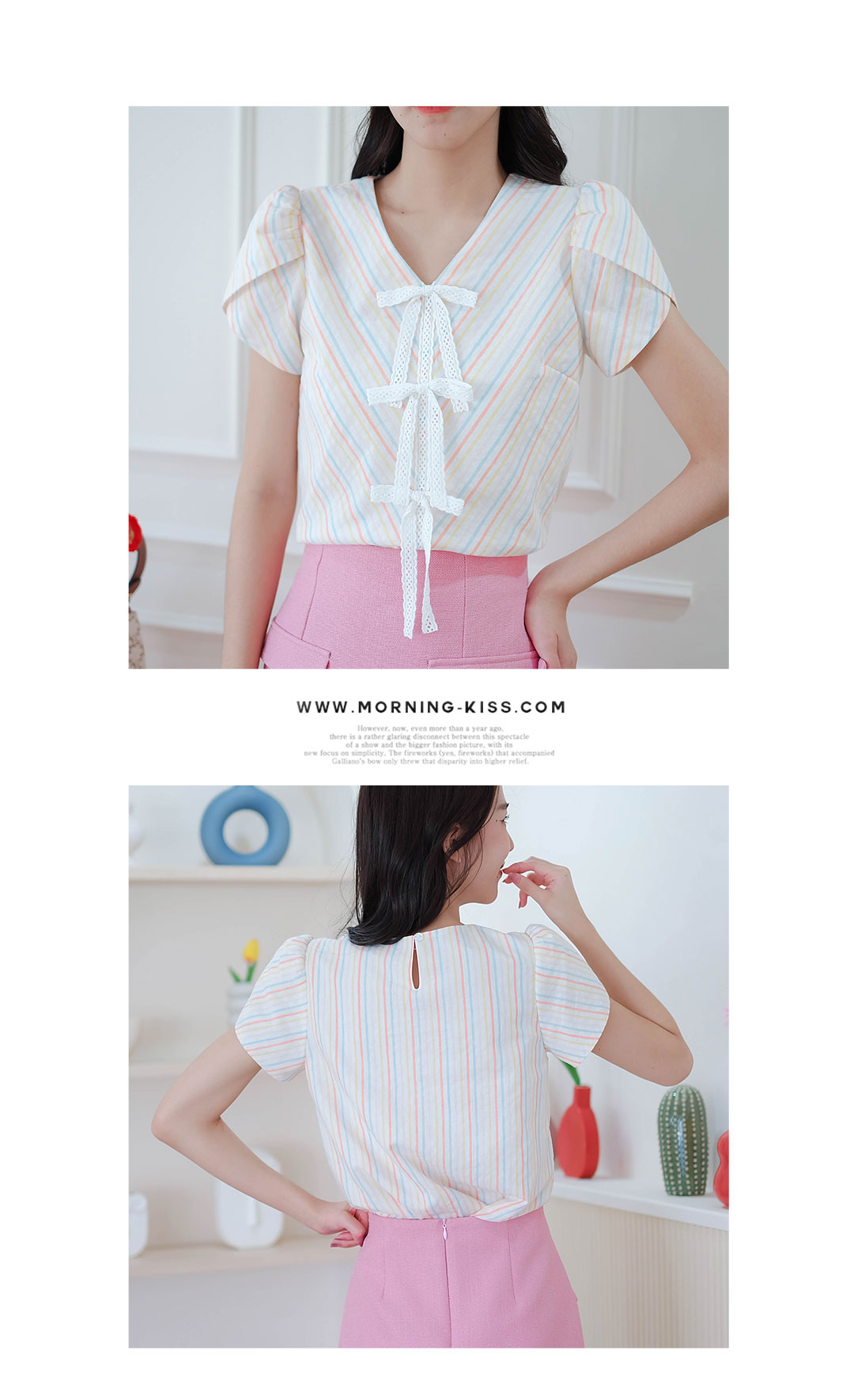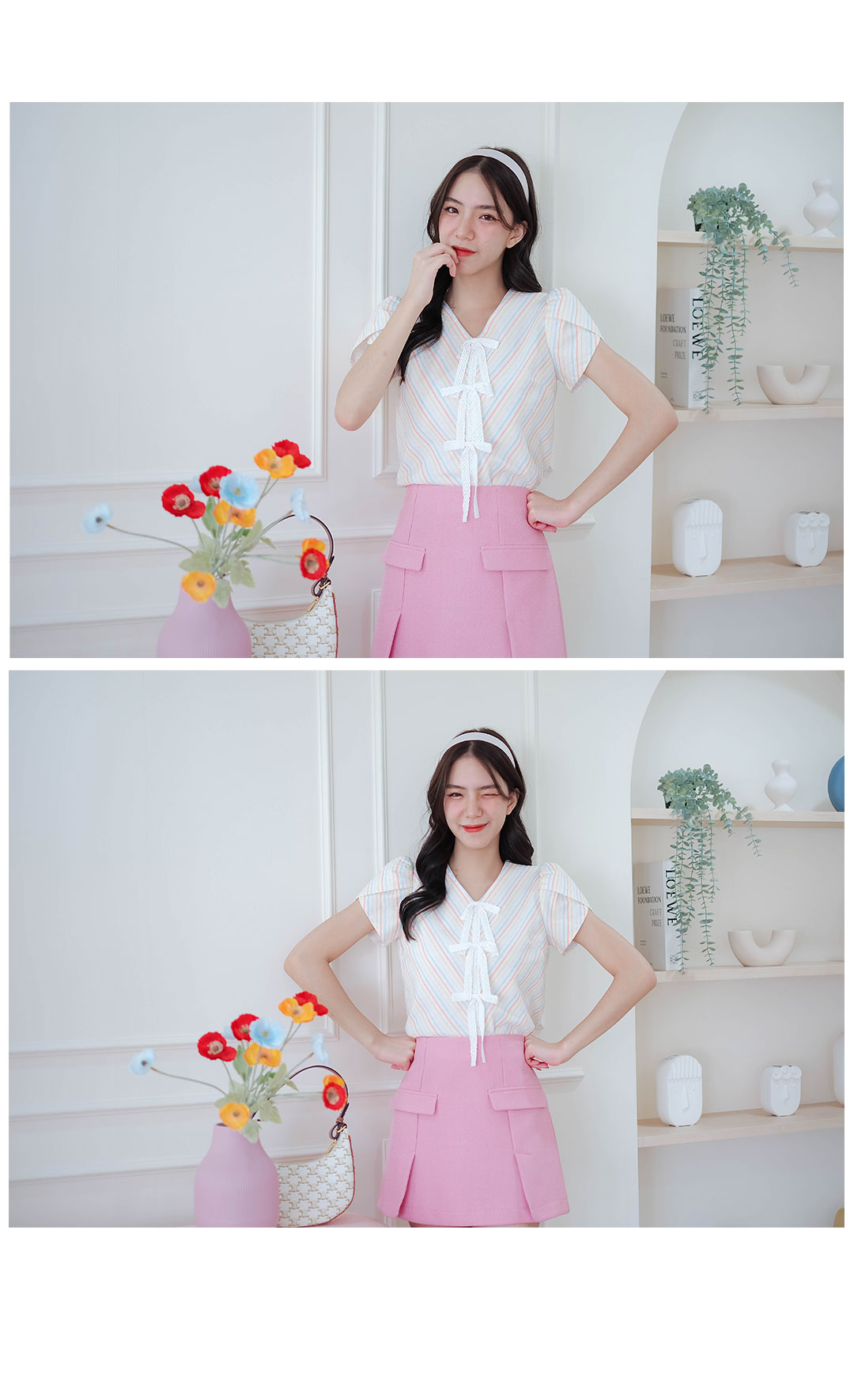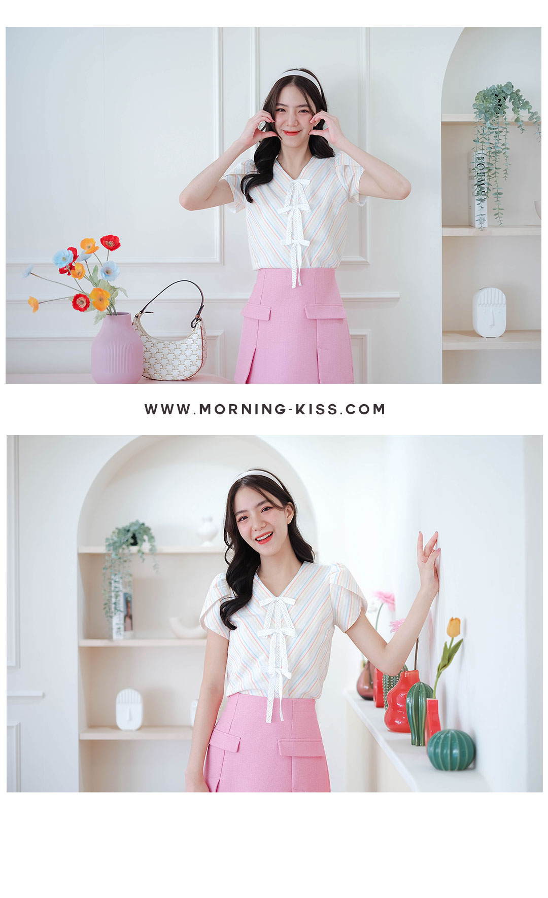 ไอเท็มแนะนำ สวยตะโกน กับเสื้อแขนสั้นตัดเย็บแบบวางลายเฉลียง สลับโทนสีพาสเทลหวานๆ แขนกลีบบัว แต่งโบว์ผ้าลูกไม้เรียงด้านหน้า สวยหวานละมุนซับในทั้งตัว แมทกับกระโปรงหรือกางเกงก็น่ารัก ใส่ทำงานก็ได้ใส่เที่ยวก็น่ารัก รุ่นนี้จัดไปไม่ผิดหวังแน่นอน