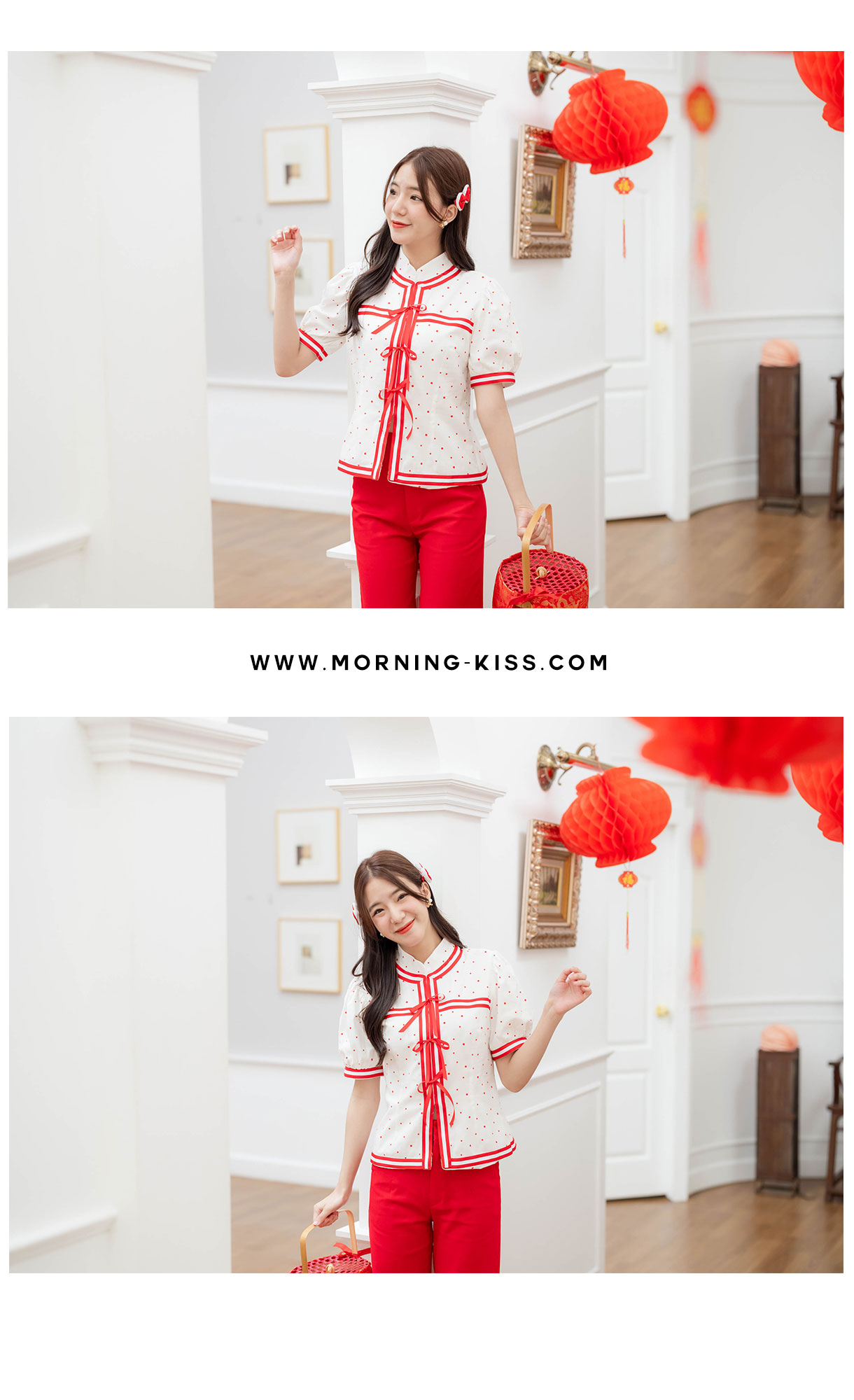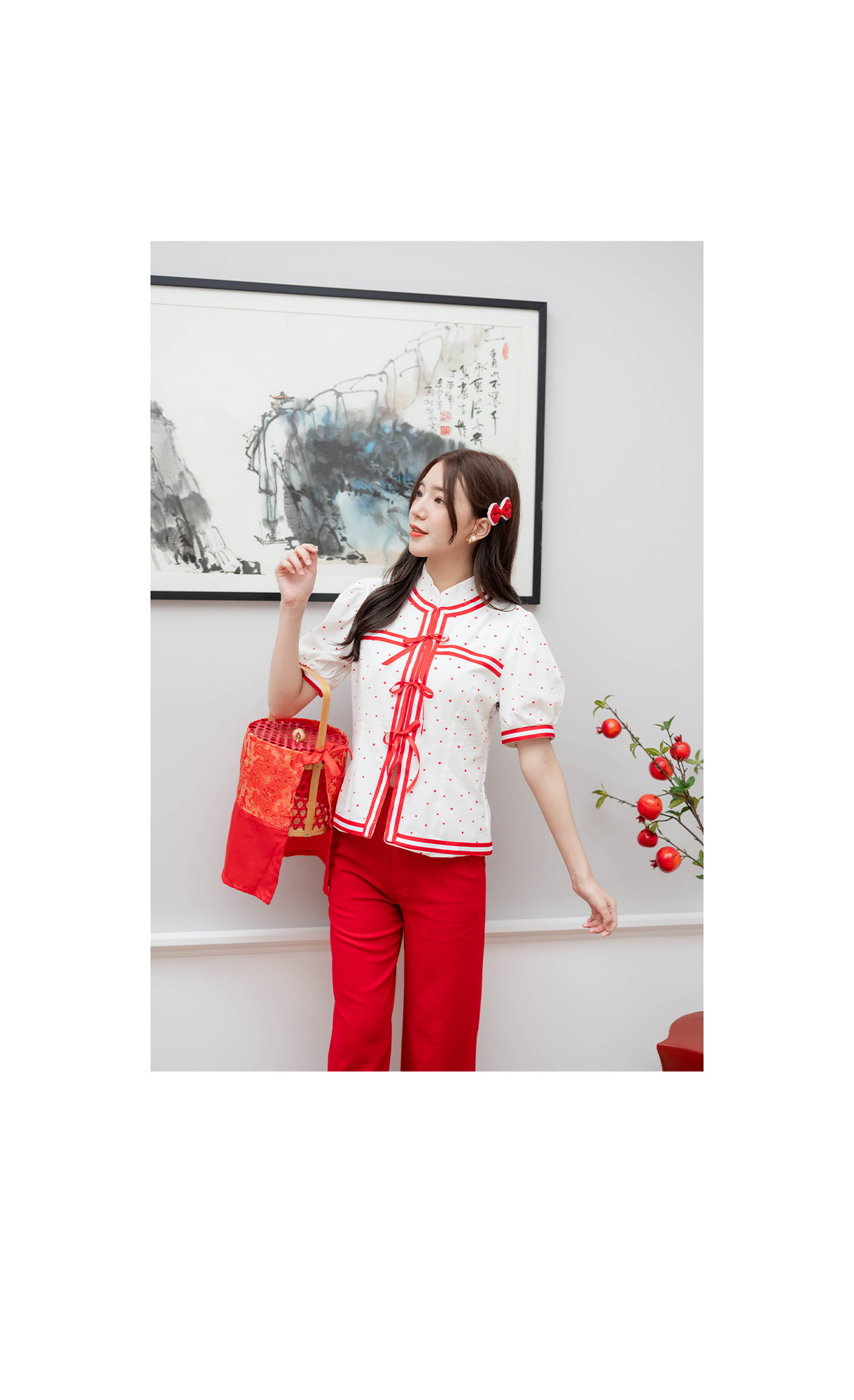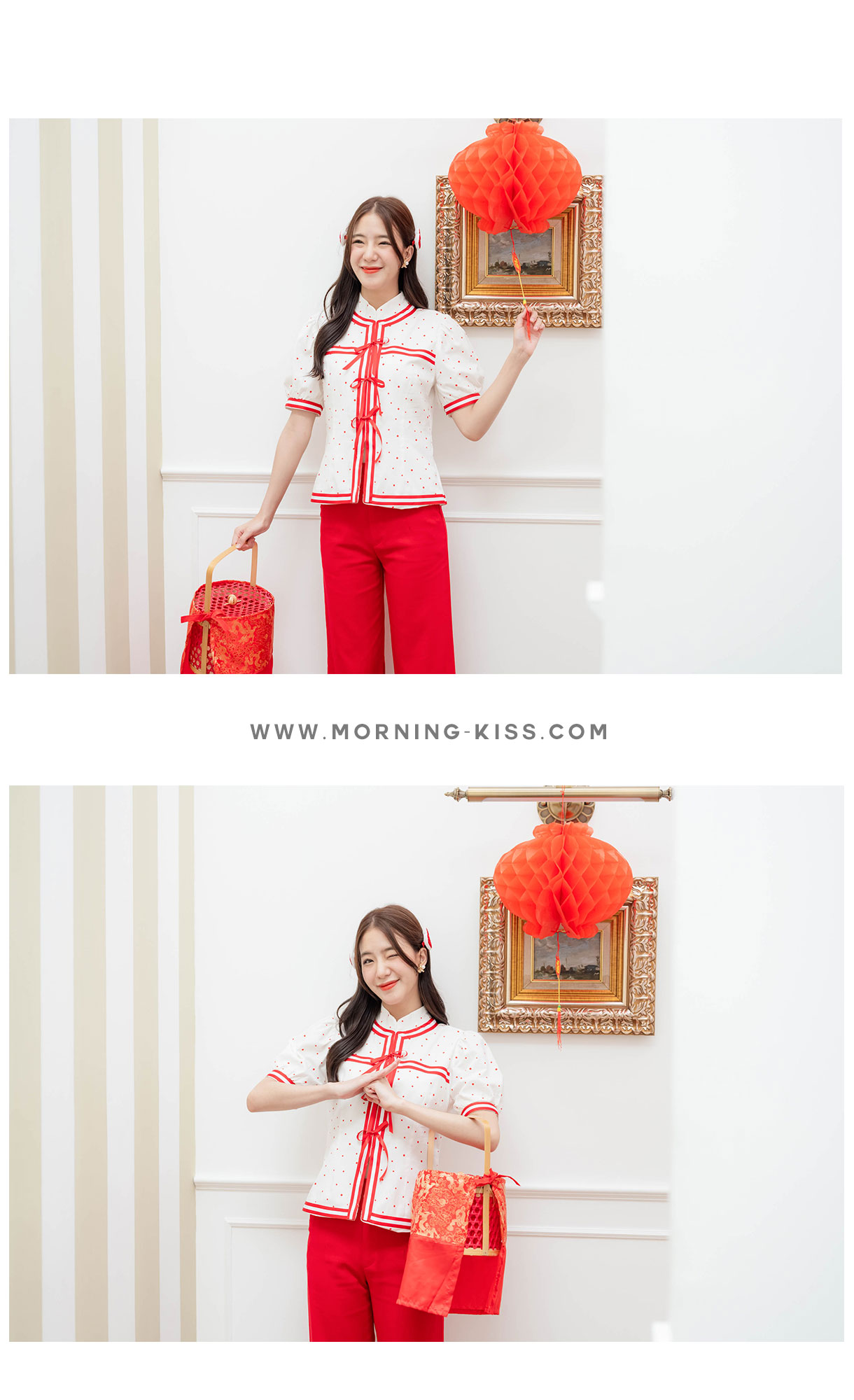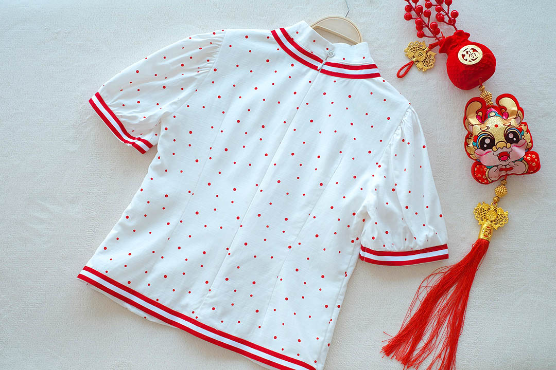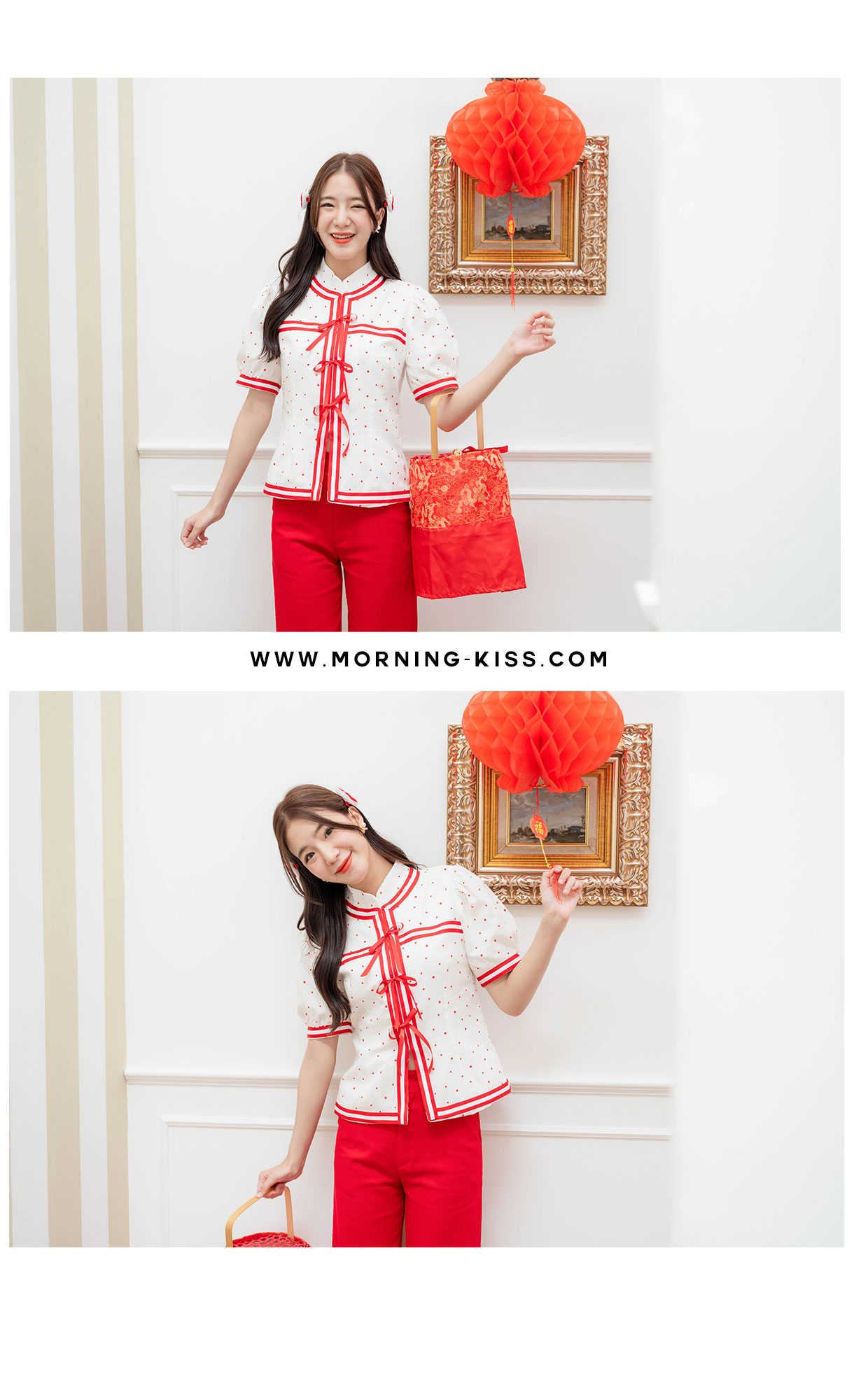 ไอเท็มนี้ ห้ามพลาดเลย เสื้อแขยสั้นโทนสีขาวจุดแดงเล็กๆรอบตัว แต่งขอบตัวเสื้อด้วยริ้วแดงสลับขาว รุ่นนี้ให้อารมณ์จีนๆแบบใส่ลำรอง แต่งโบว์แดงเรียงหน้า มีซับใน เนื้อผ้าดี เป็นโทนใส่ง่ายๆใส่เที่ยวใส่ตรุษจีนนี้หรือเก็บไว้ใส่ทำงานก็ได้ มีติดตู้ไว้ไม่ผิดหวังแน่นอน