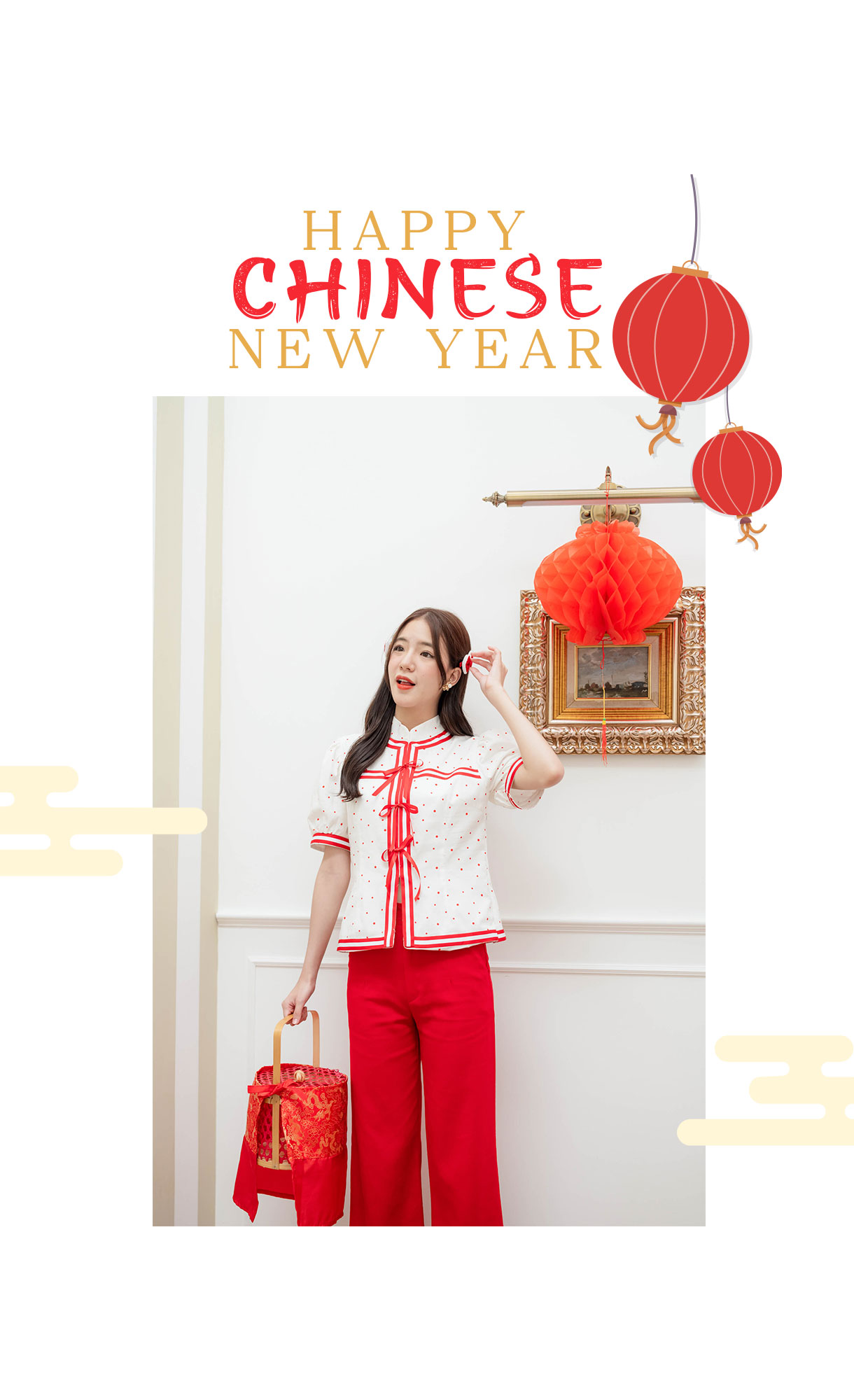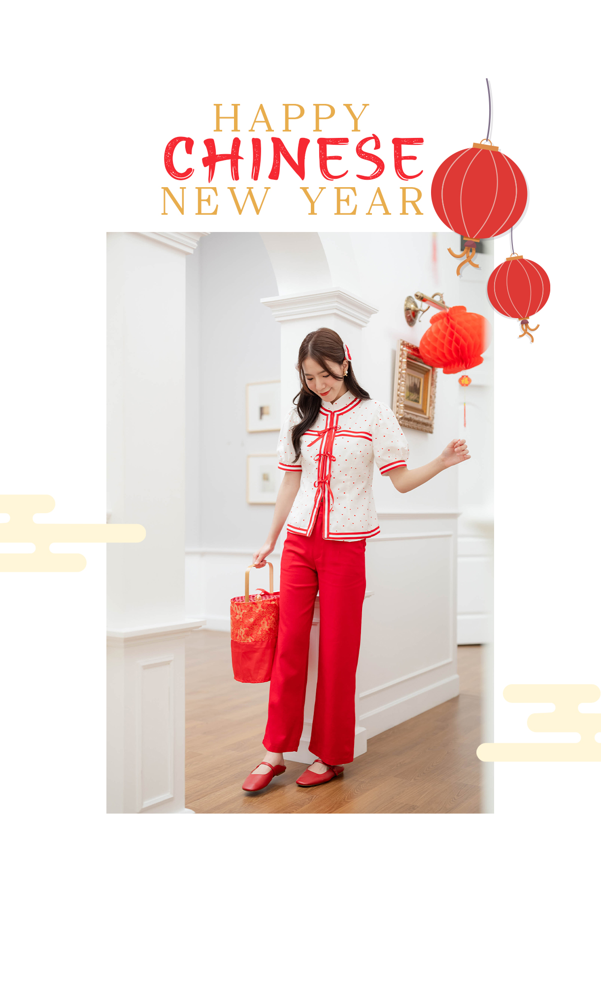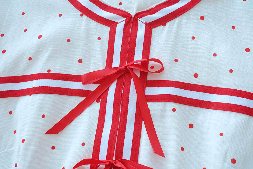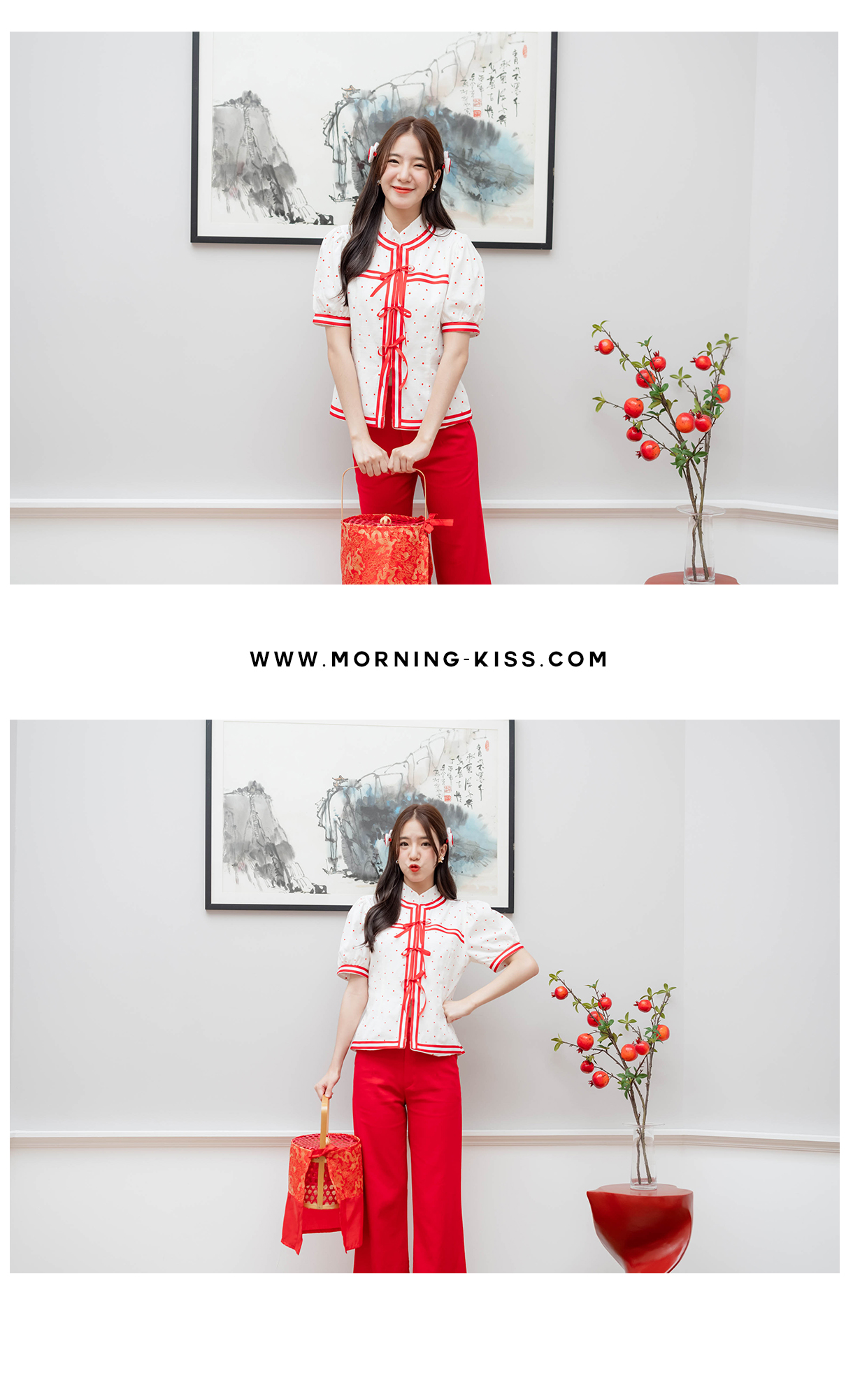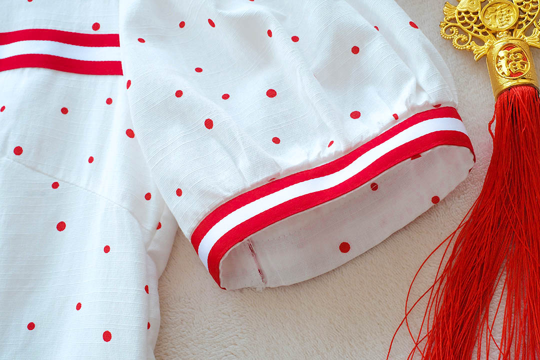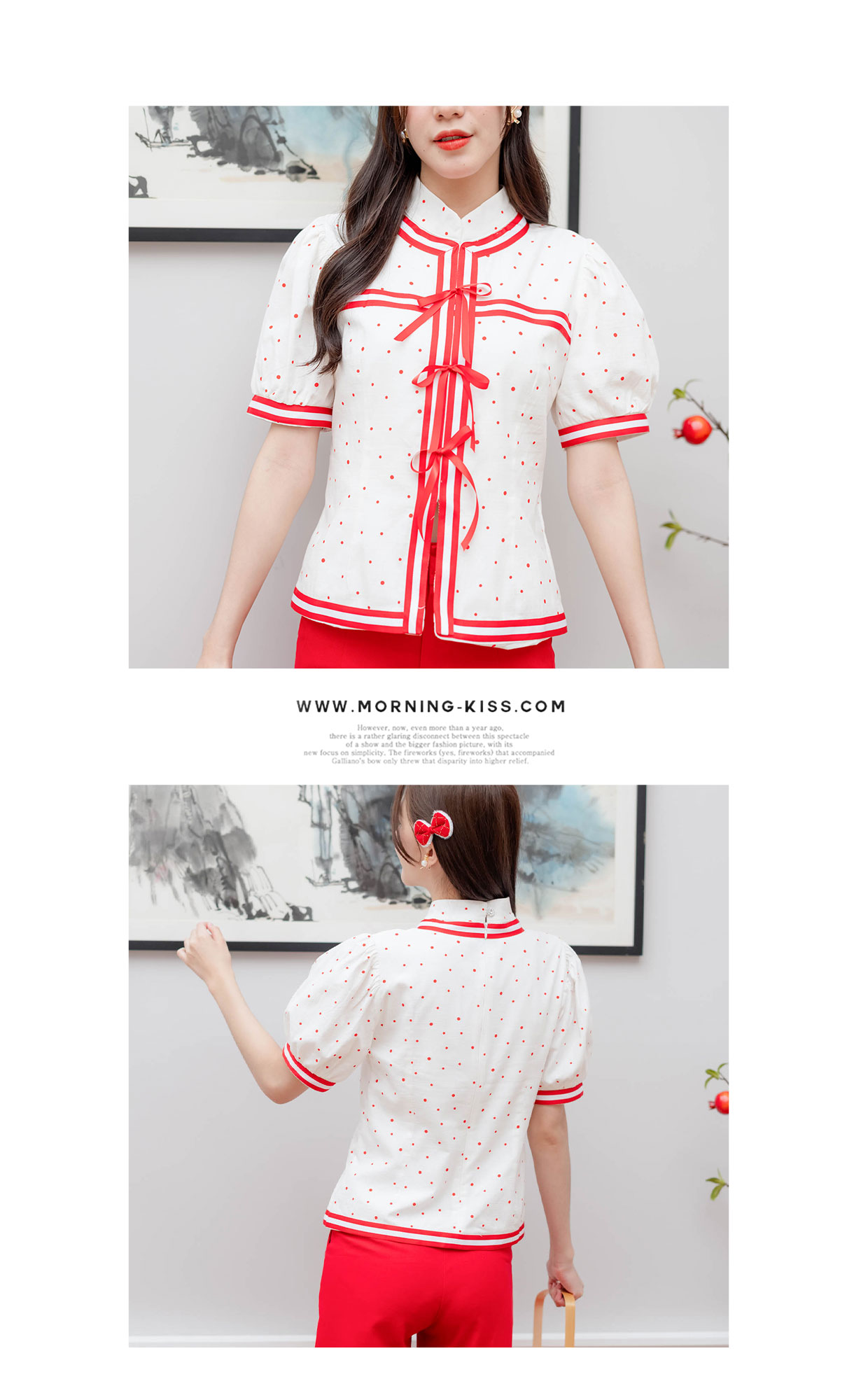ไอเท็มนี้ ห้ามพลาดเลย เสื้อแขยสั้นโทนสีขาวจุดแดงเล็กๆรอบตัว แต่งขอบตัวเสื้อด้วยริ้วแดงสลับขาว รุ่นนี้ให้อารมณ์จีนๆแบบใส่ลำรอง แต่งโบว์แดงเรียงหน้า มีซับใน เนื้อผ้าดี เป็นโทนใส่ง่ายๆใส่เที่ยวใส่ตรุษจีนนี้หรือเก็บไว้ใส่ทำงานก็ได้ มีติดตู้ไว้ไม่ผิดหวังแน่นอน