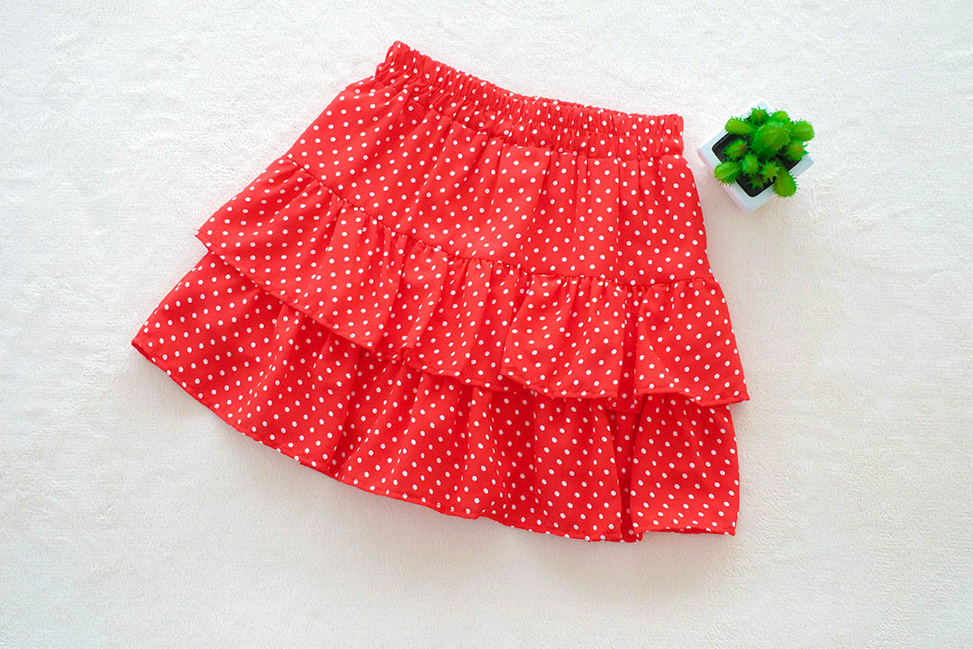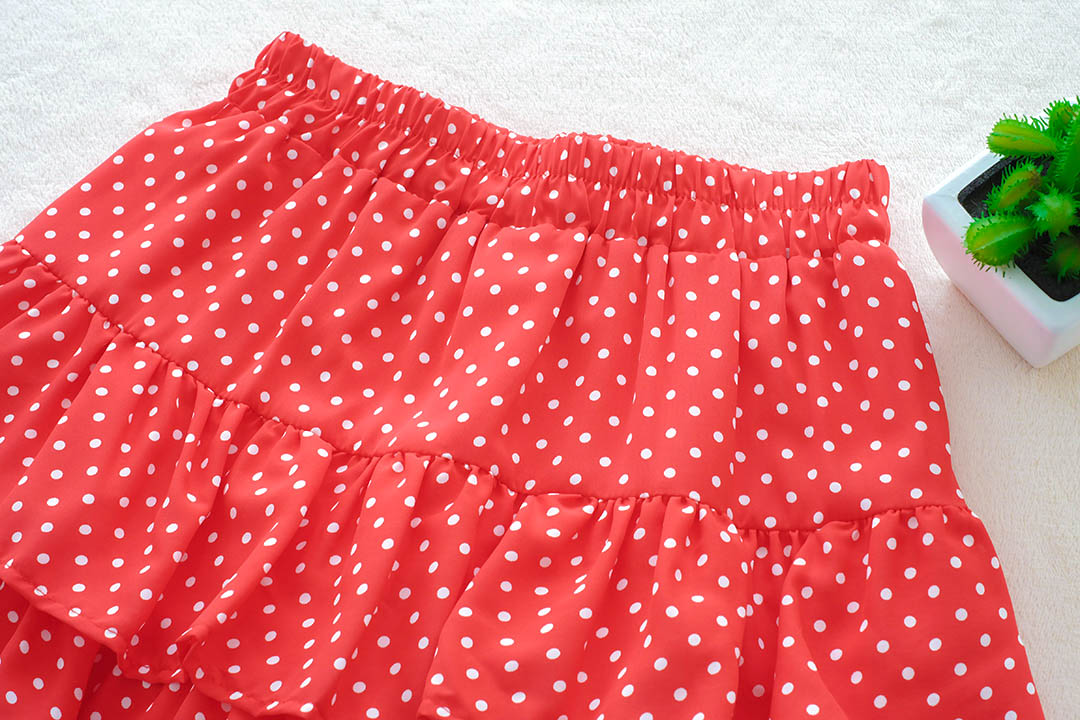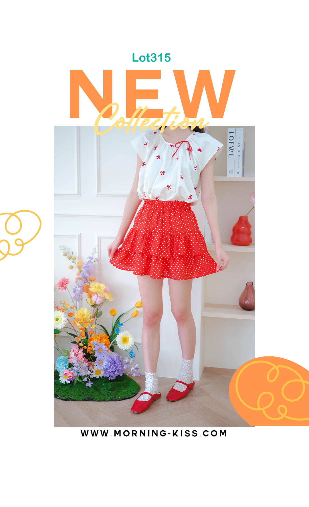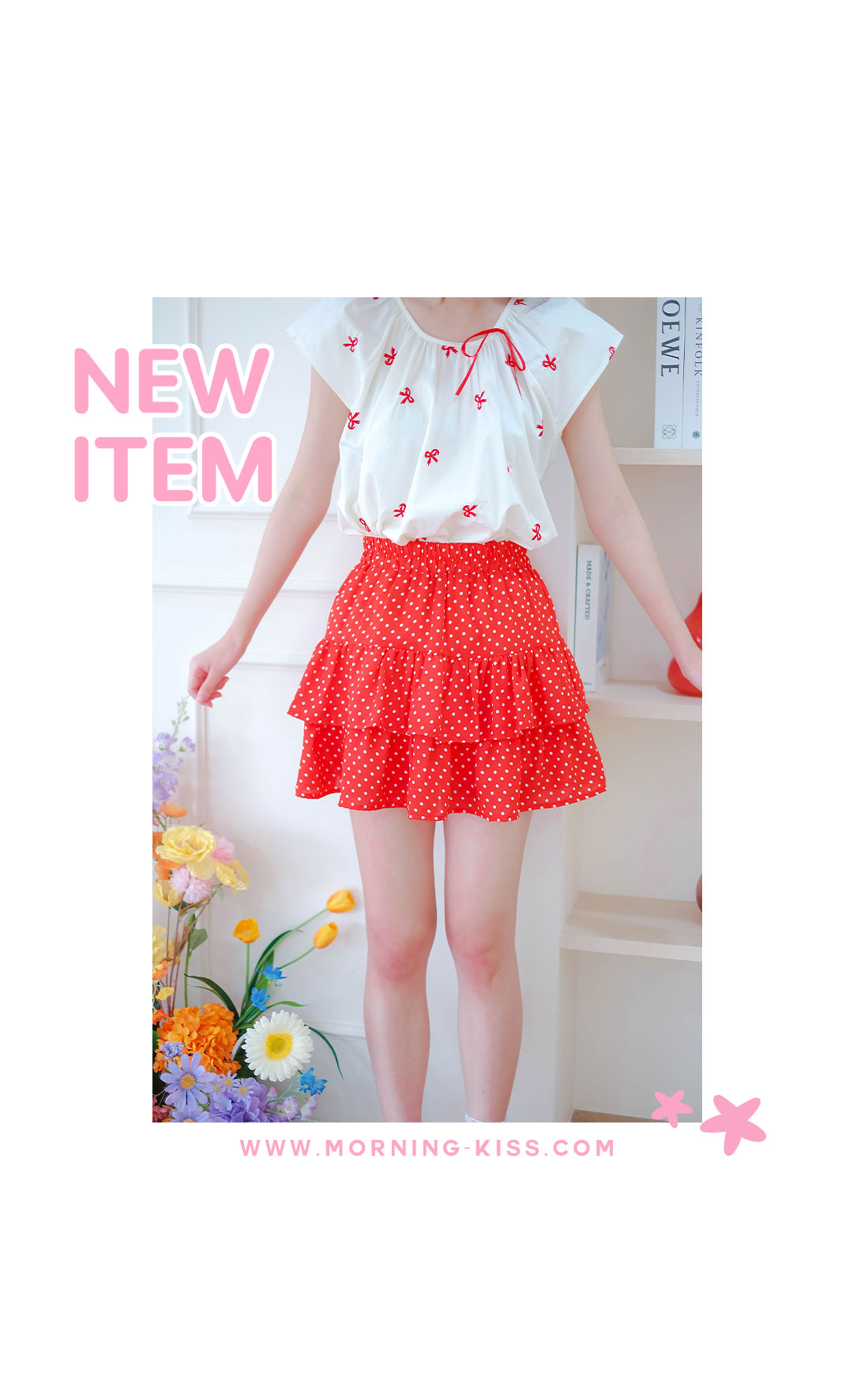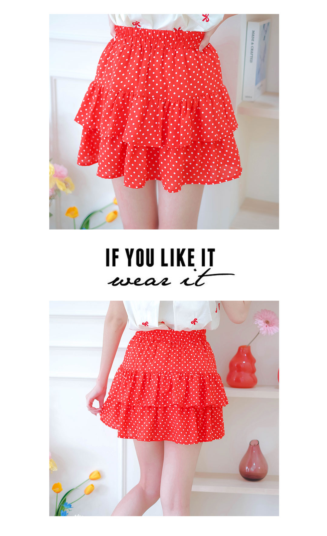 กระโปรงสีแดงลายจุดขาว ช่วงเอวเป็นยางยืด ทำระบาย 2 ชั้น เนื้อผ้าพริ้วๆทอ้งตัวสวย มีซับในกางเกงไม่ต้องกลัวโป๊เลย ความยาวกำลังดี ไม่สั้นเกินไปด้วย รายการนี้แนะนำเลย แบบน่ารักมาก