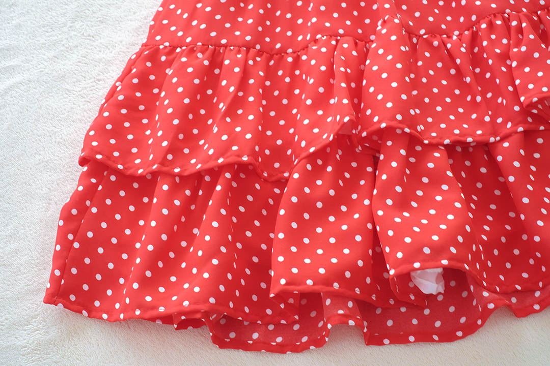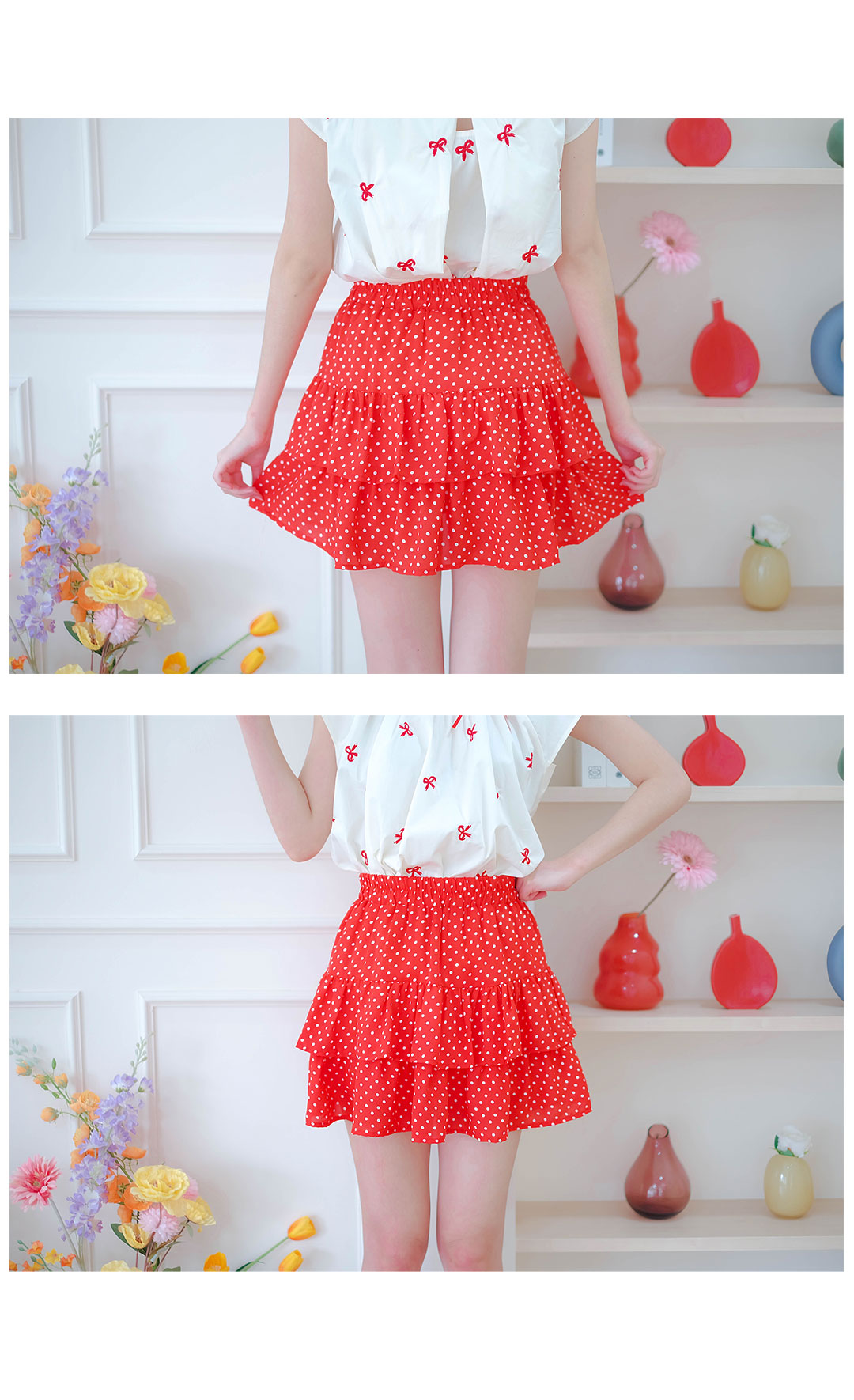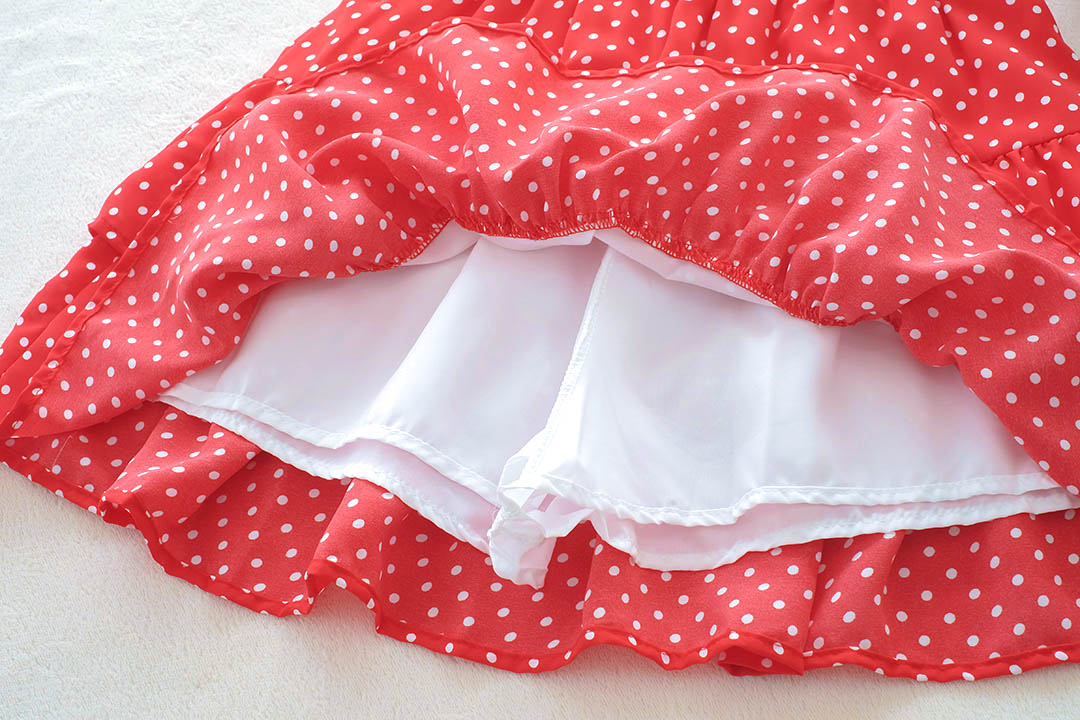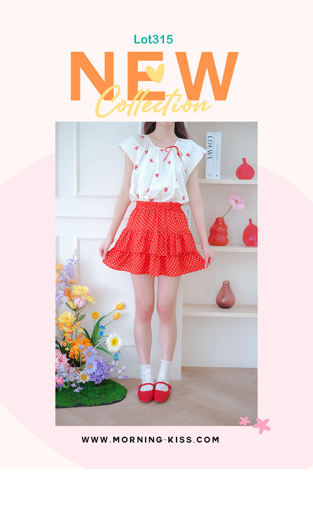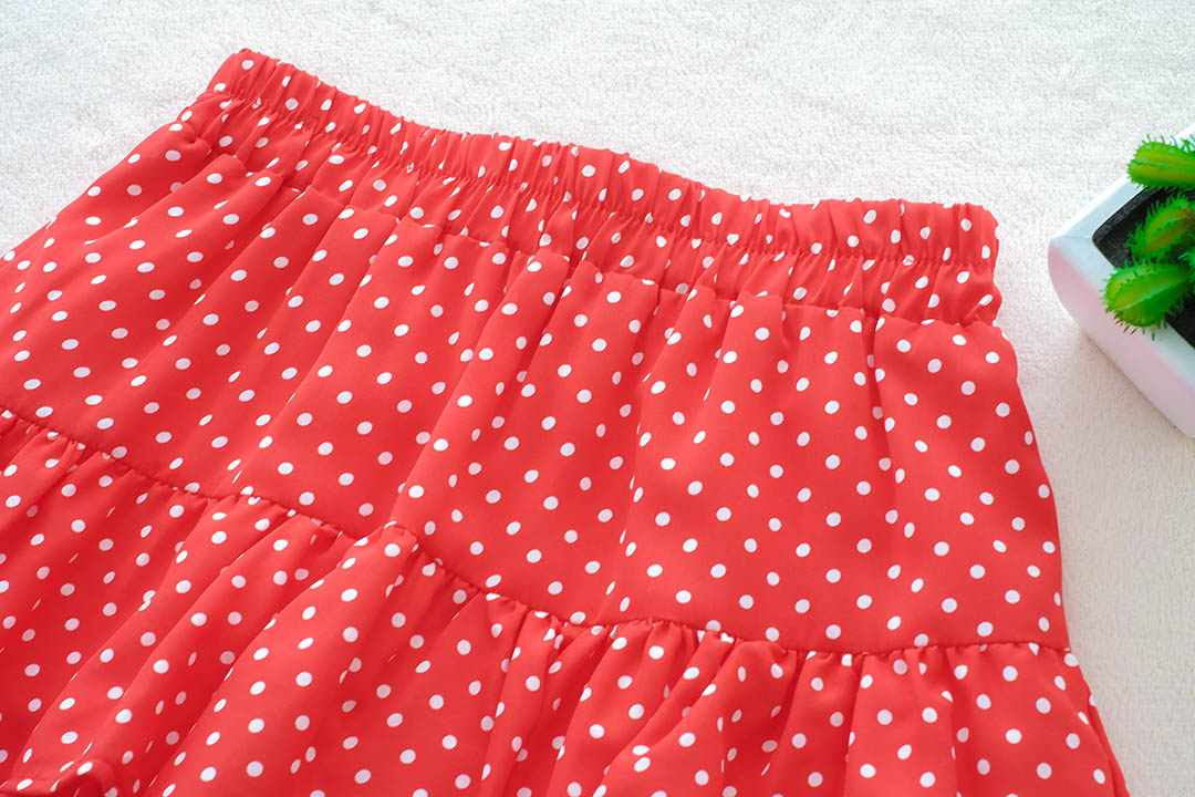 กระโปรงสีแดงลายจุดขาว ช่วงเอวเป็นยางยืด ทำระบาย 2 ชั้น เนื้อผ้าพริ้วๆทอ้งตัวสวย มีซับในกางเกงไม่ต้องกลัวโป๊เลย ความยาวกำลังดี ไม่สั้นเกินไปด้วย รายการนี้แนะนำเลย แบบน่ารักมาก