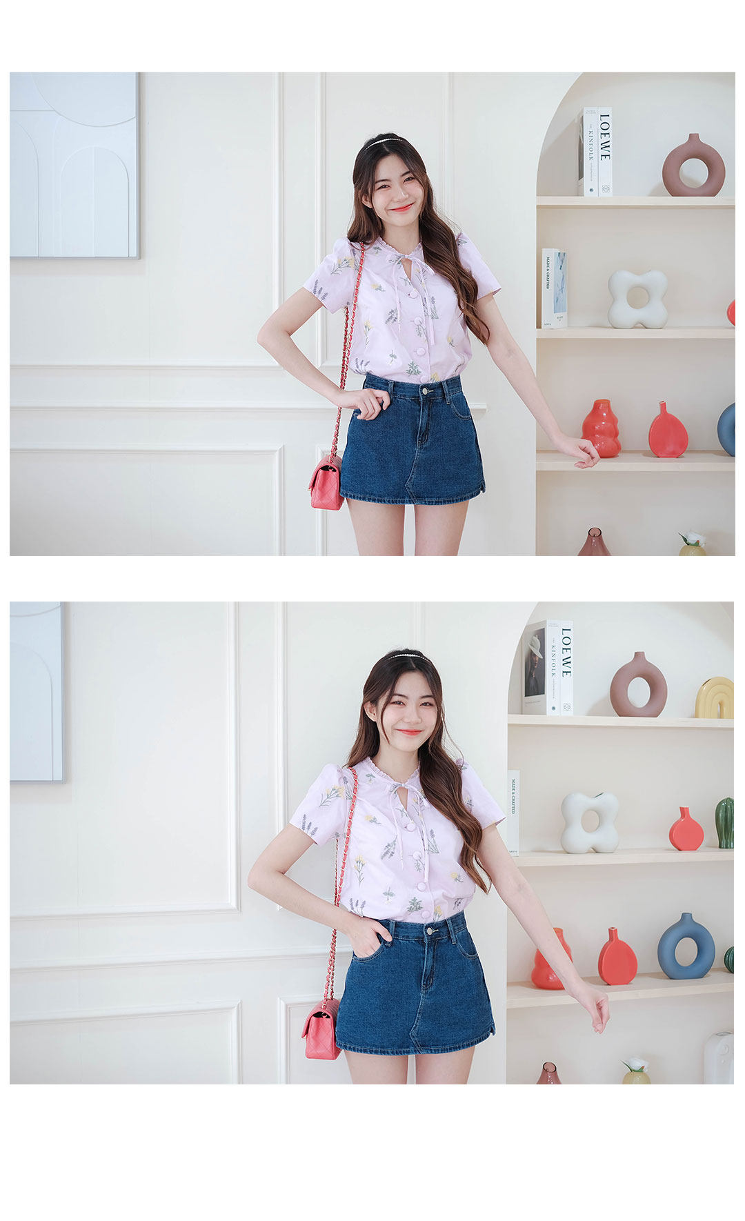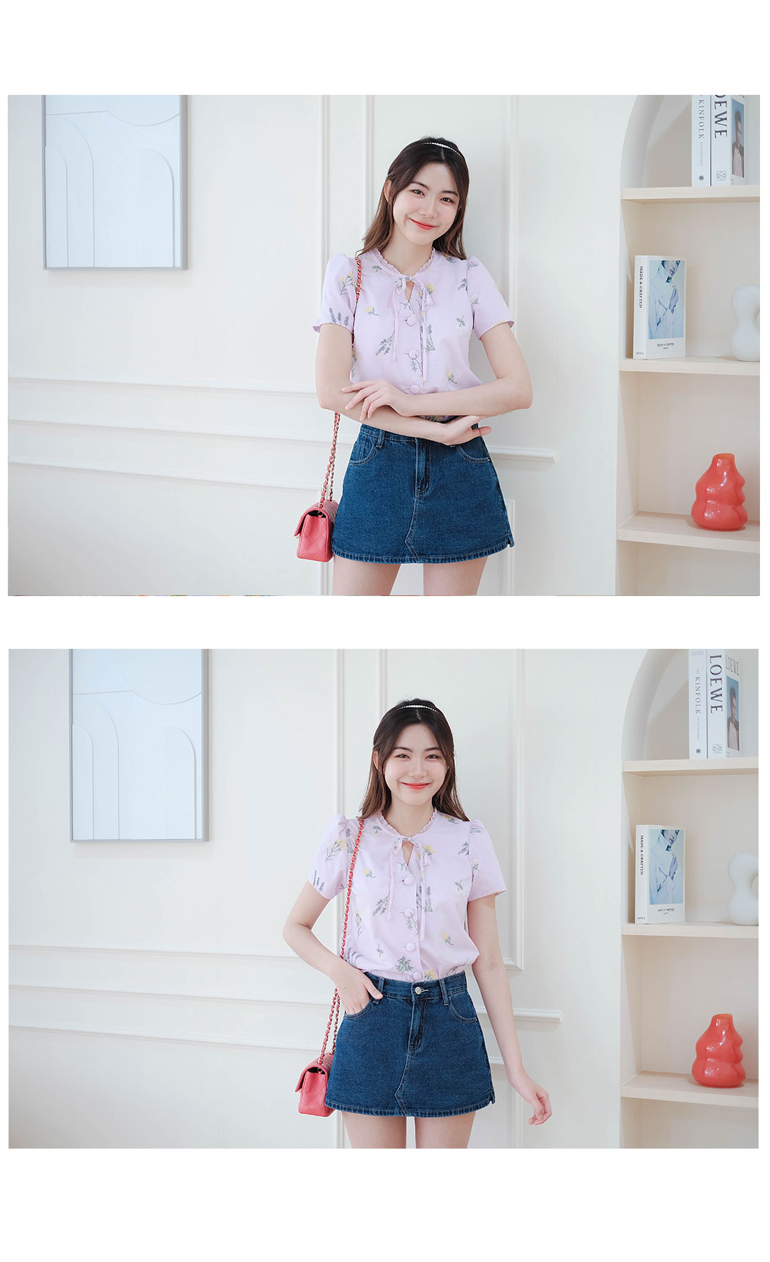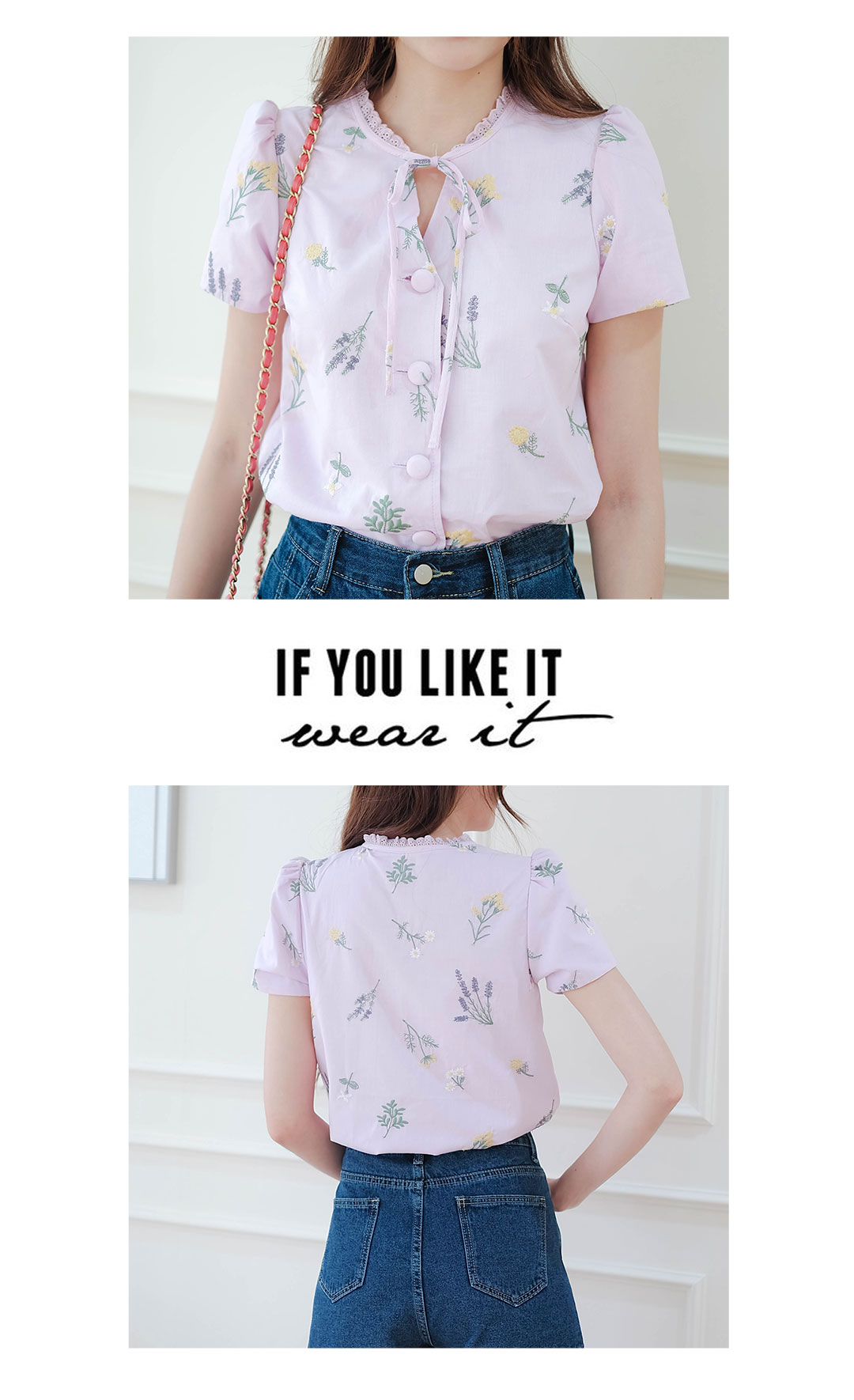 รุ่นนี้จัดไปไม่ผิดหวังแน่นอน สไตส์สวยหวานน่ารัก เสื้อแขนสั้นคอวีกุ๊นขอบคอด้วยผ้าลูกไม้ + มีสายผูกเป็นโบว์น่ารักๆ โทนสีม่วงเนื้อผ้าคอตตอน งานปักดอกไม้รอบตัว กระดุมเรียงหน้า แมทกับกระโปรงหรือกางเกงก็น่ารัก ซับในทั้งตัว ไอเท็มนี้แนะนำเลย ไอเท็มนี้แนะนำเลย รุ่นนี้สไตส์นี้ใส่ได้ตลอดๆนะคะ