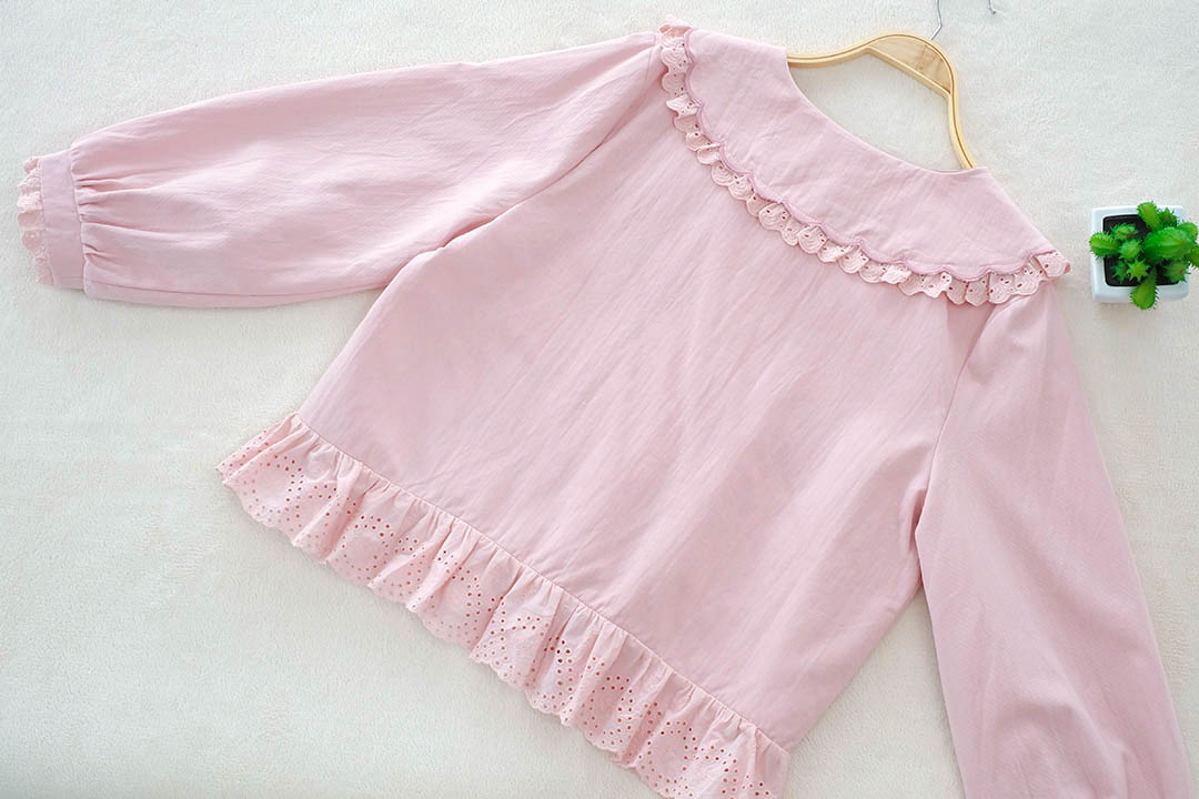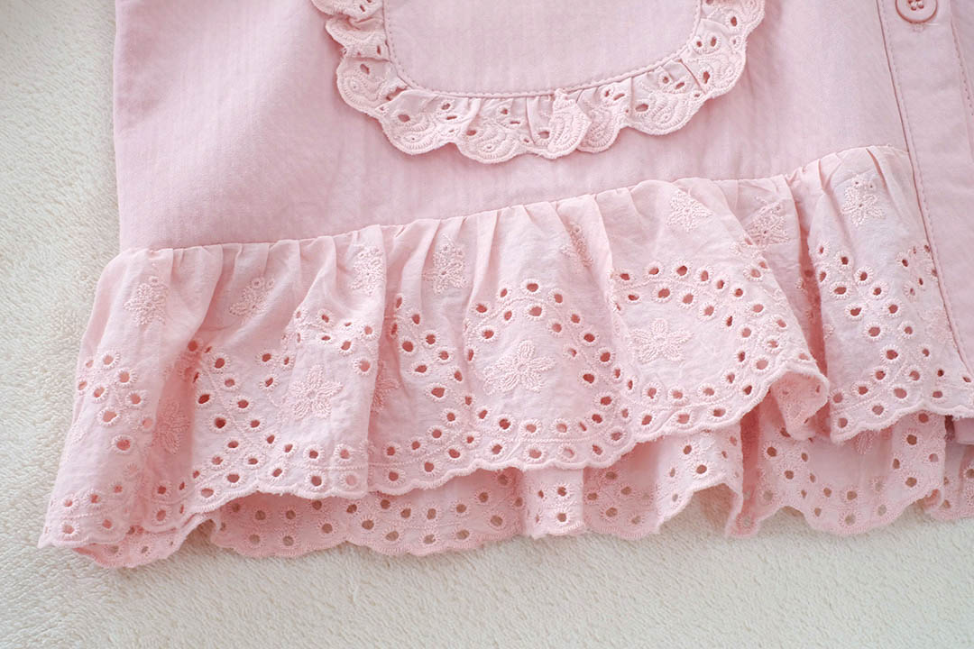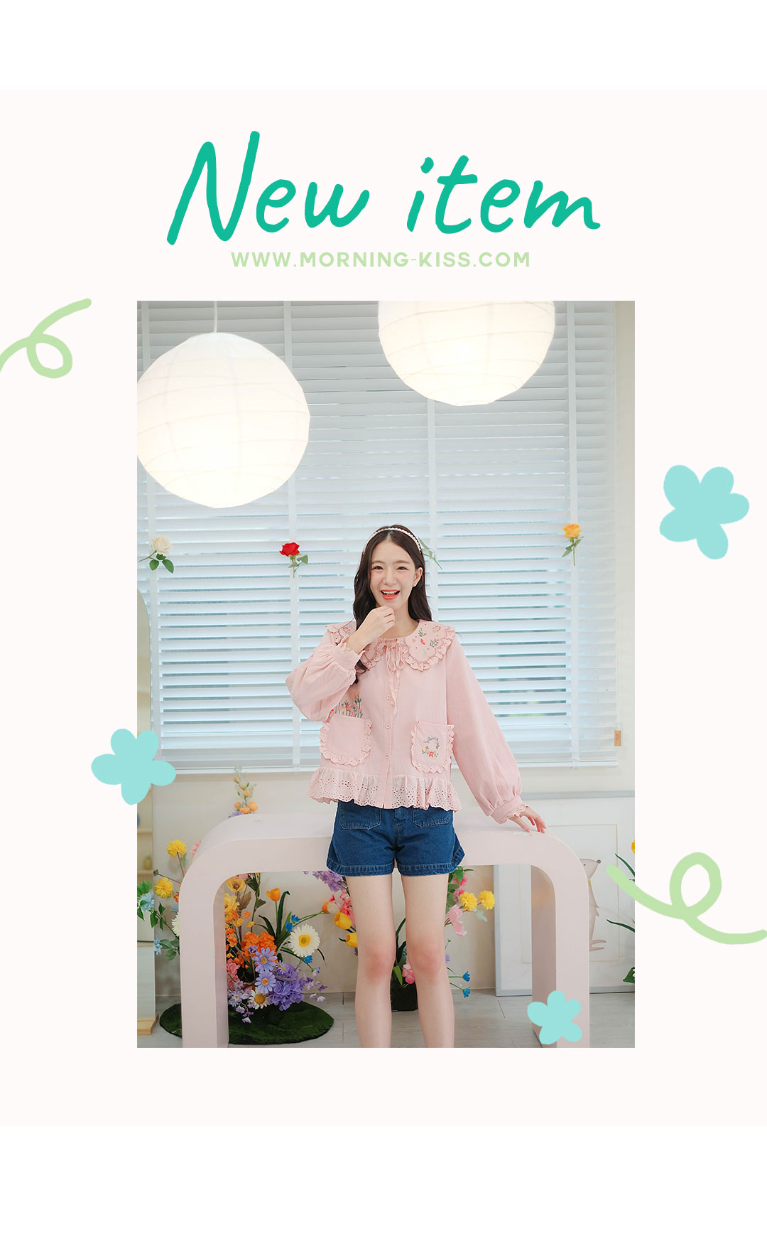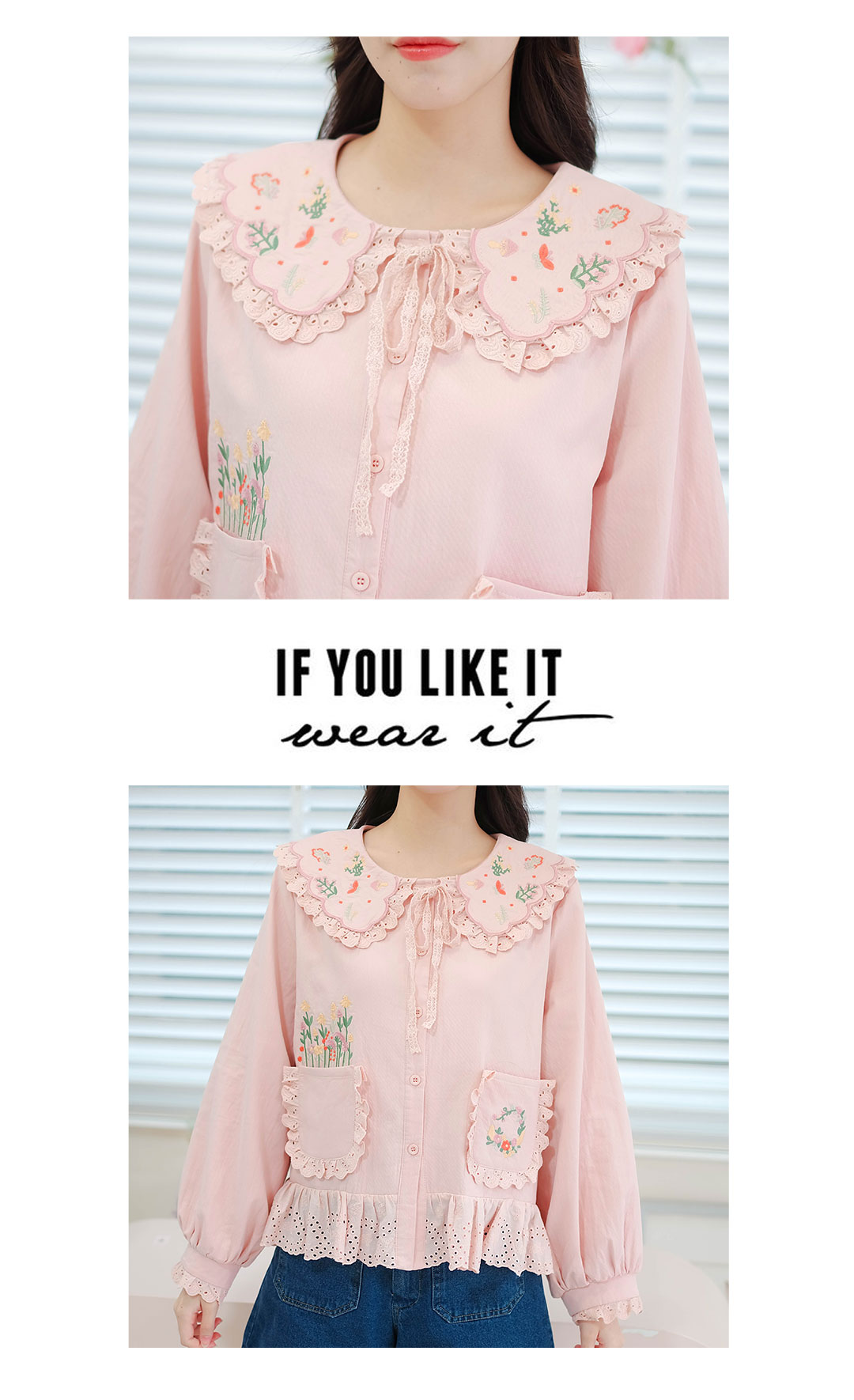 Japan Quality งานญี่ปุ่น น่ารักๆไอเท็มนี้ห้ามพลาดเลย เสื้อแขนยาวโทนสีชมพู ช่วงคอปกแต่งงานปักน่ารักๆ + ทำระบายหยักๆ ช่วงคอมีสายผูกเป็นโบว์ แต่งกระดุมเรียงหน้า แต่งกระเป๋าจริง 2 ข้าง ซ้าย/ขวา ทรงตัวปล่อยๆ ชายระบายต่อด้วยผ้าลูกไม้ ใส่ทำงานก็ได้ใส่เที่ยวก็น่ารัก รุ่นนี้จัดไปไม่ผิดหวังจริงๆ