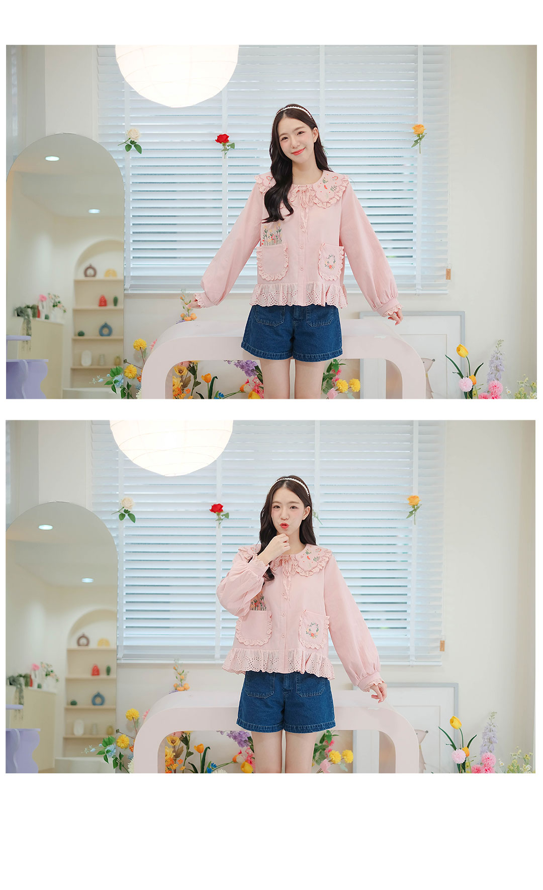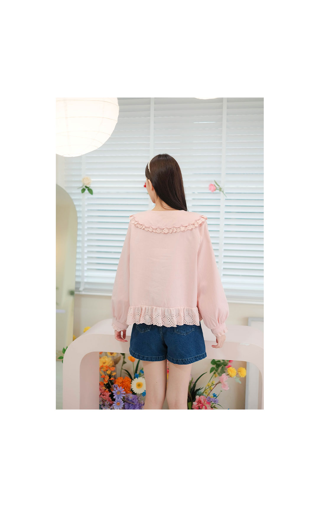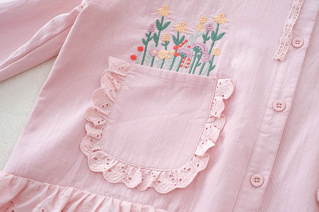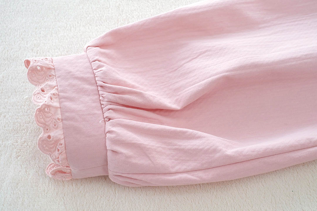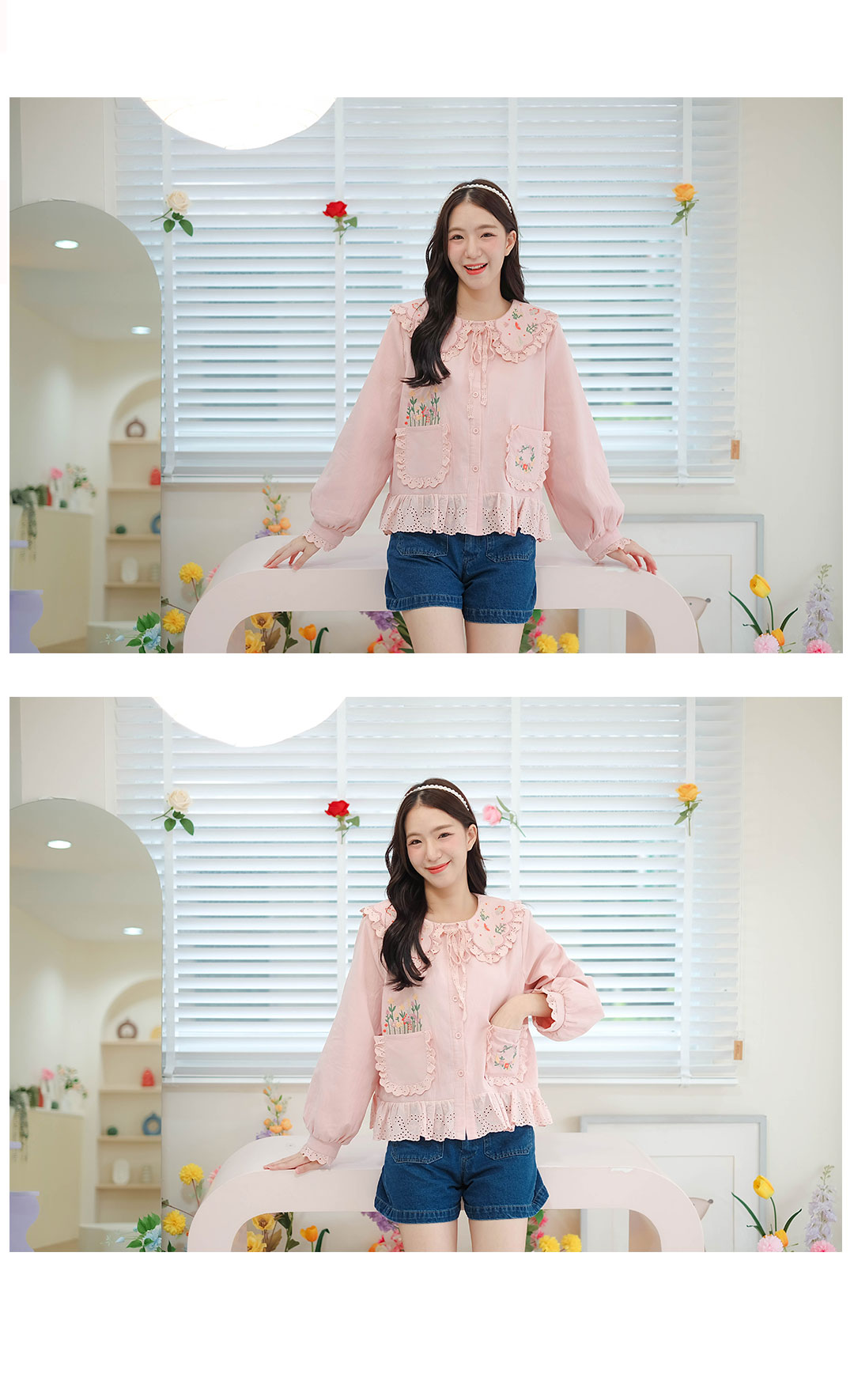 Japan Quality งานญี่ปุ่น น่ารักๆไอเท็มนี้ห้ามพลาดเลย เสื้อแขนยาวโทนสีชมพู ช่วงคอปกแต่งงานปักน่ารักๆ + ทำระบายหยักๆ ช่วงคอมีสายผูกเป็นโบว์ แต่งกระดุมเรียงหน้า แต่งกระเป๋าจริง 2 ข้าง ซ้าย/ขวา ทรงตัวปล่อยๆ ชายระบายต่อด้วยผ้าลูกไม้ ใส่ทำงานก็ได้ใส่เที่ยวก็น่ารัก รุ่นนี้จัดไปไม่ผิดหวังจริงๆ