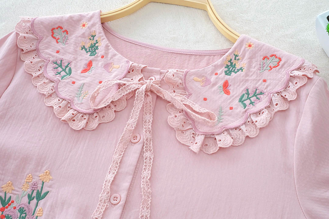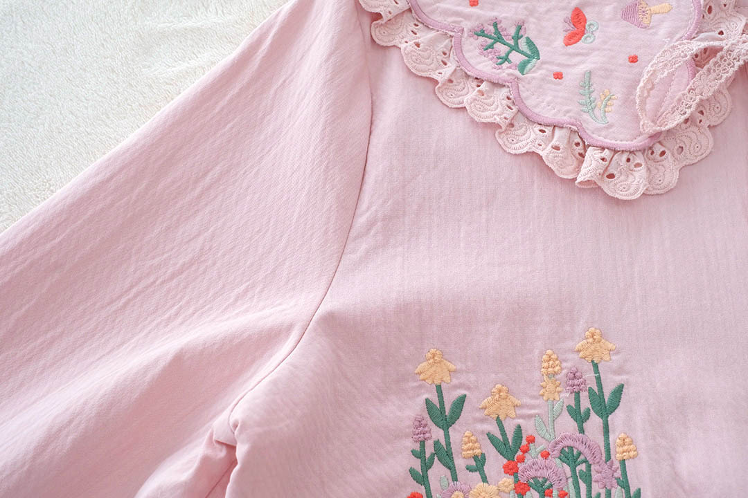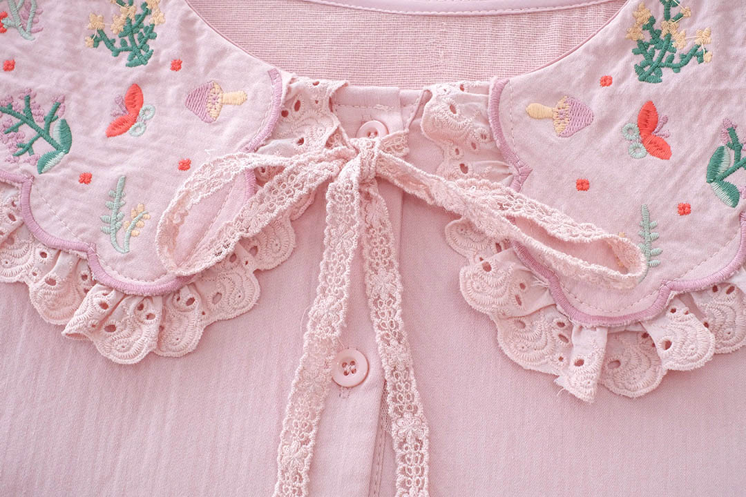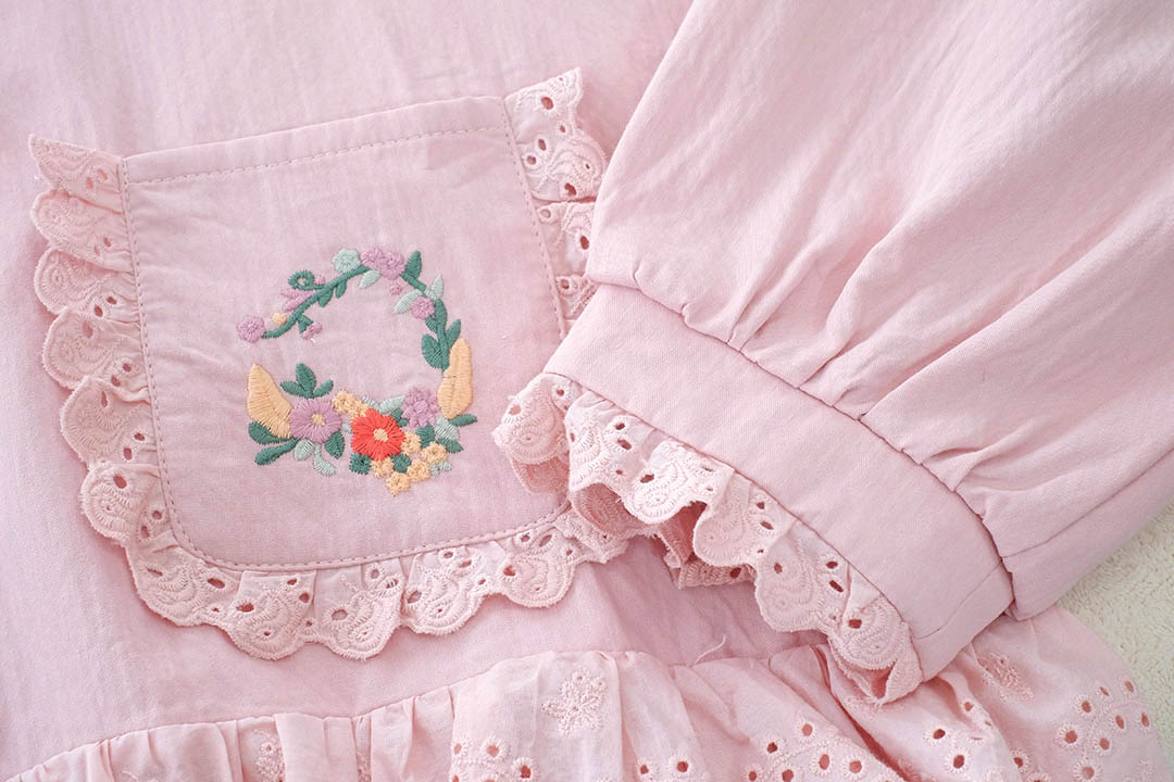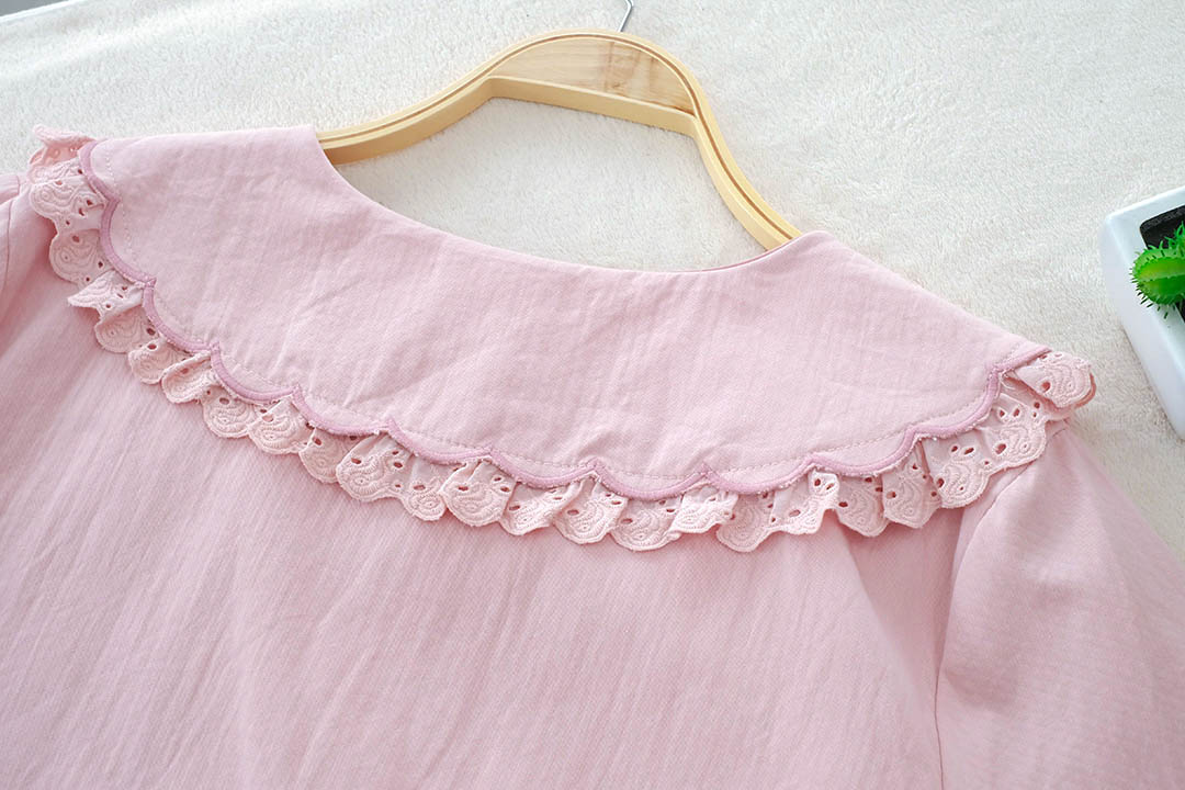 Japan Quality งานญี่ปุ่น น่ารักๆไอเท็มนี้ห้ามพลาดเลย เสื้อแขนยาวโทนสีชมพู ช่วงคอปกแต่งงานปักน่ารักๆ + ทำระบายหยักๆ ช่วงคอมีสายผูกเป็นโบว์ แต่งกระดุมเรียงหน้า แต่งกระเป๋าจริง 2 ข้าง ซ้าย/ขวา ทรงตัวปล่อยๆ ชายระบายต่อด้วยผ้าลูกไม้ ใส่ทำงานก็ได้ใส่เที่ยวก็น่ารัก รุ่นนี้จัดไปไม่ผิดหวังจริงๆ