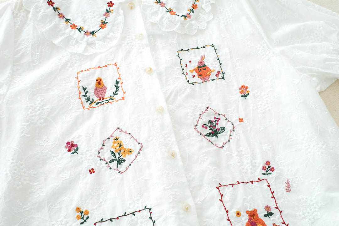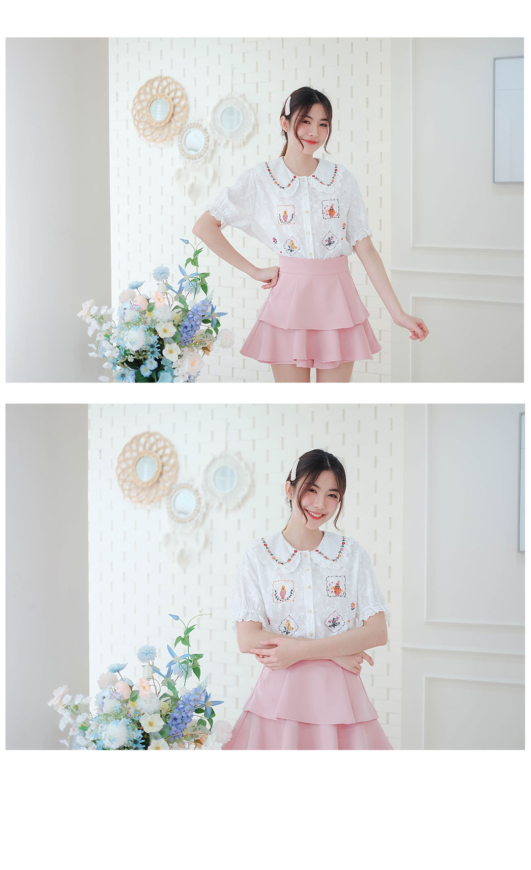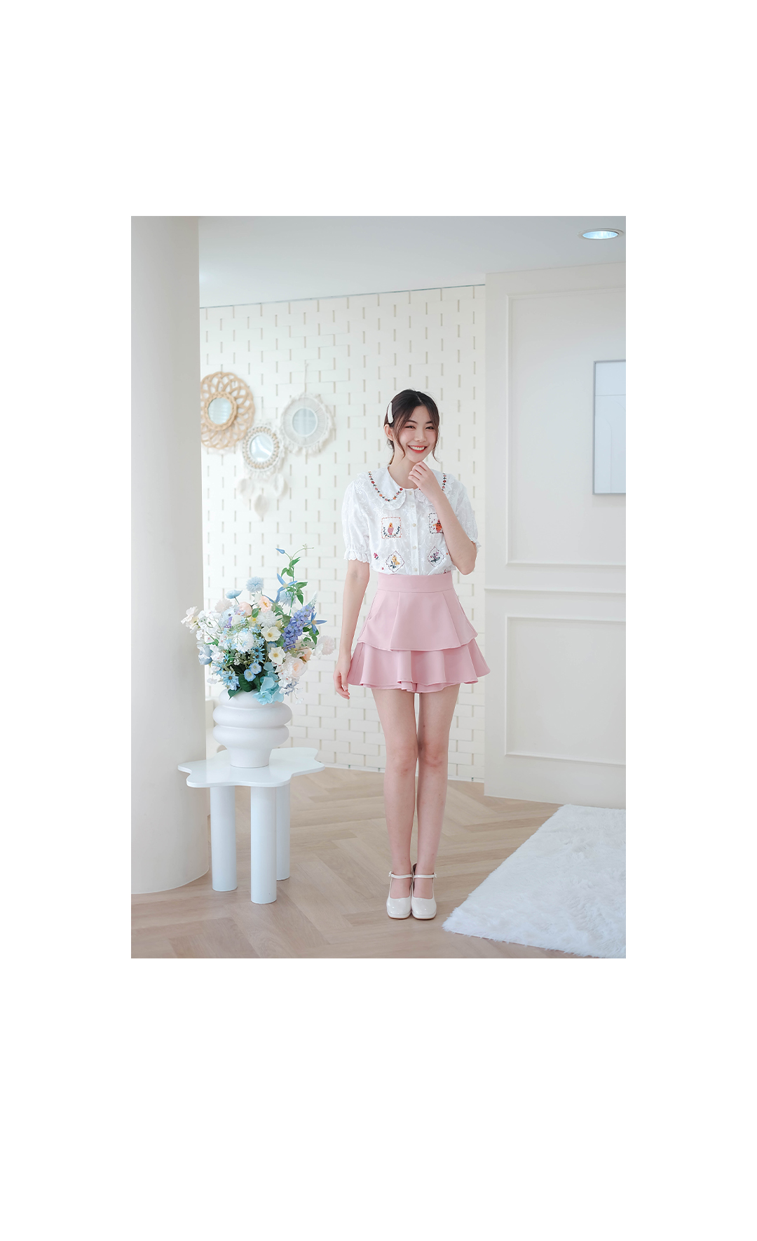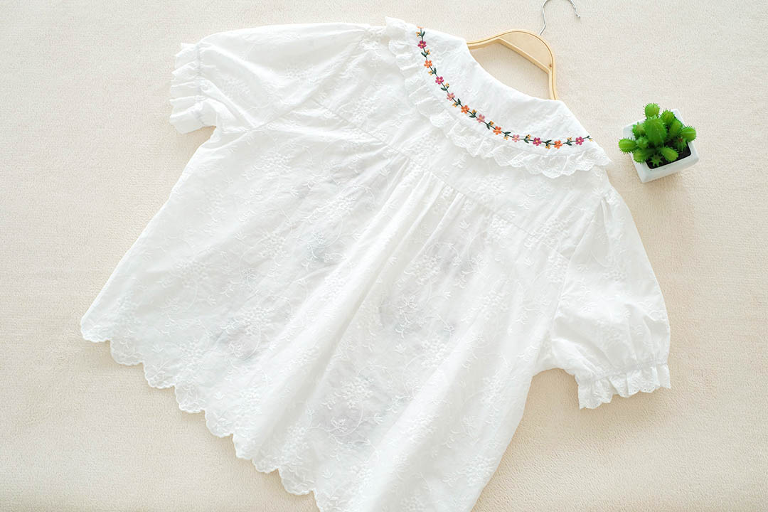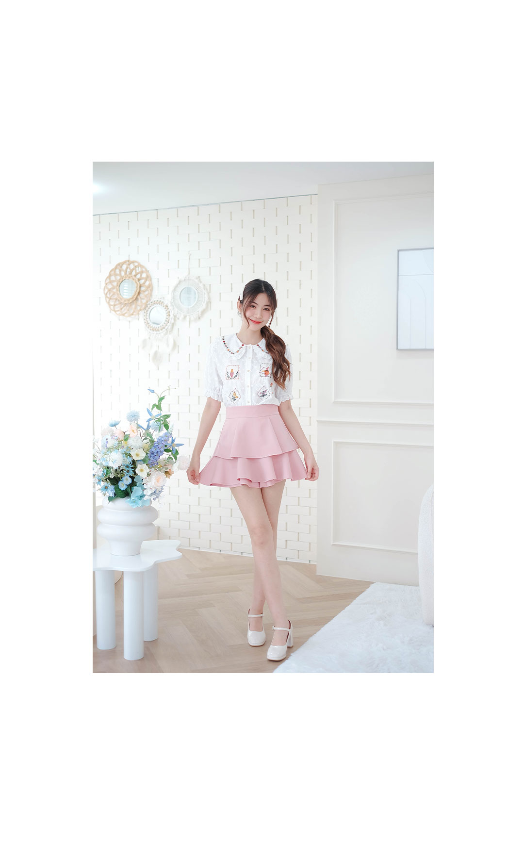 ลุคหวานๆน่ารักๆกับเสื้อแขนสั้นคอปกแต่งงานปักดอกไม้เล็กๆสีสดใสทำระบายเล็กๆ เนื้อผ้า Cotton ฉลุลายดอกไม้รอบตัว + แต่งงานปักด้านหน้าน่ารักๆ มีซับในทั้งตัว กระดุมเรียงหน้า ชายเสื้อทำหยักๆ ใส่ทำงานก็ได้ใส่เที่ยวก็น่ารัก รายการนี้แนะนำเลย