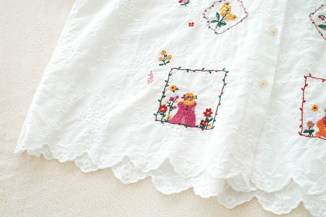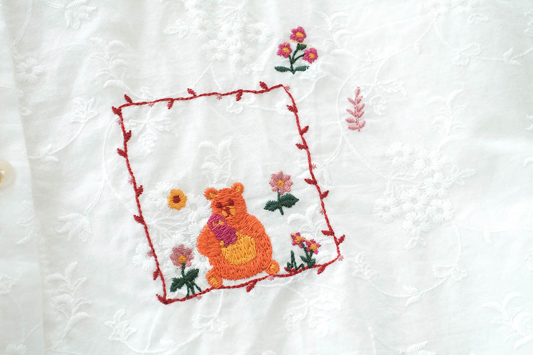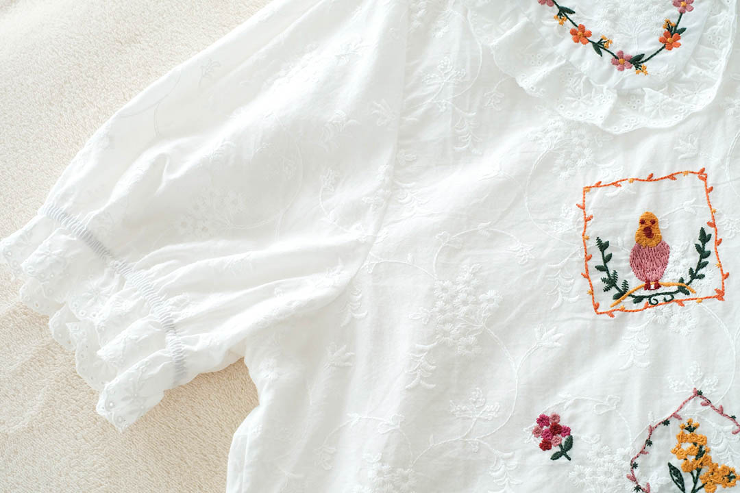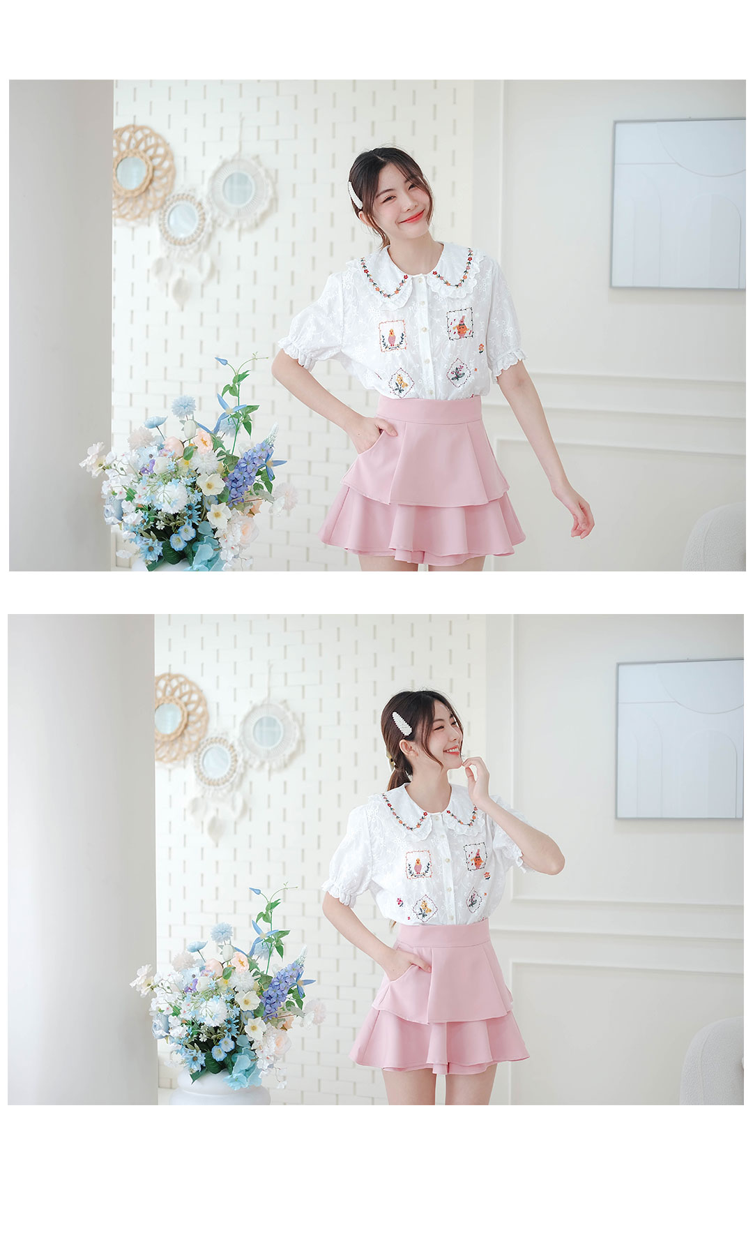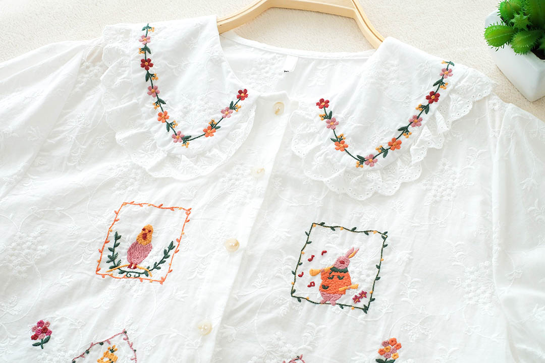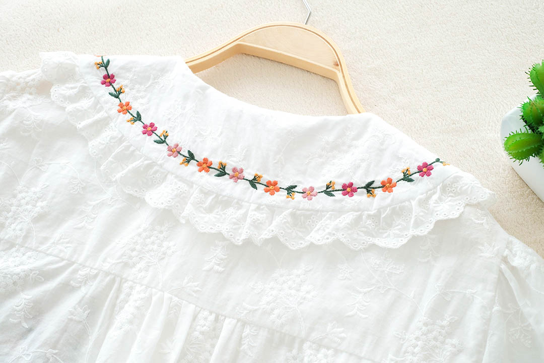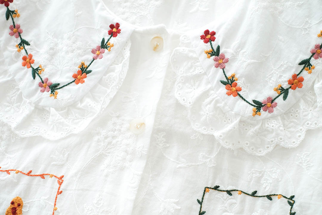 ลุคหวานๆน่ารักๆกับเสื้อแขนสั้นคอปกแต่งงานปักดอกไม้เล็กๆสีสดใสทำระบายเล็กๆ เนื้อผ้า Cotton ฉลุลายดอกไม้รอบตัว + แต่งงานปักด้านหน้าน่ารักๆ มีซับในทั้งตัว กระดุมเรียงหน้า ชายเสื้อทำหยักๆ ใส่ทำงานก็ได้ใส่เที่ยวก็น่ารัก รายการนี้แนะนำเลย
