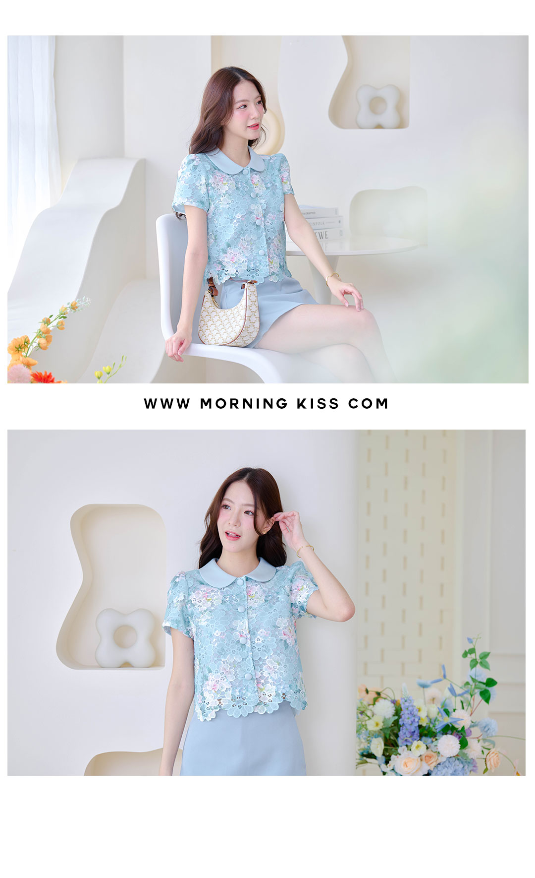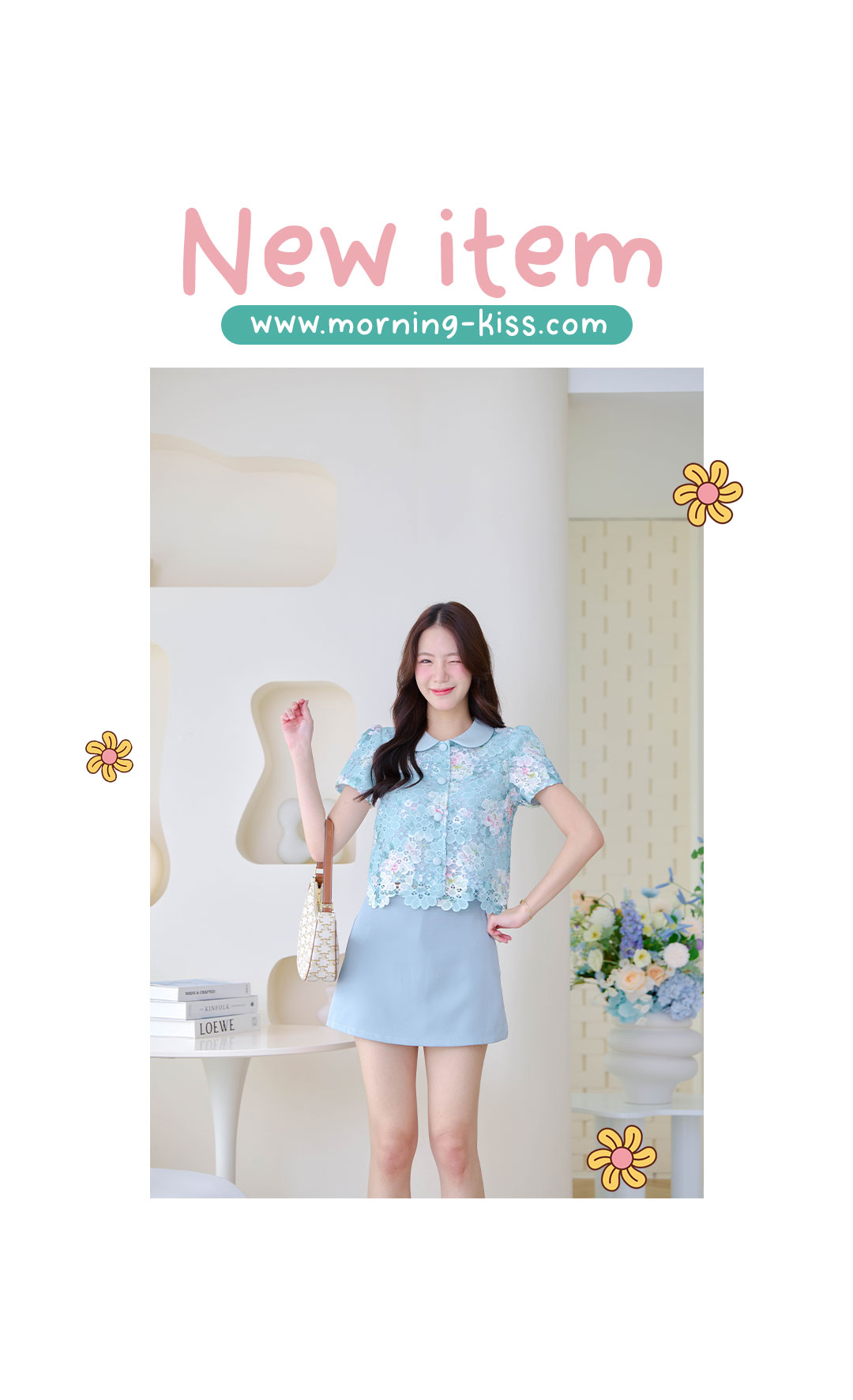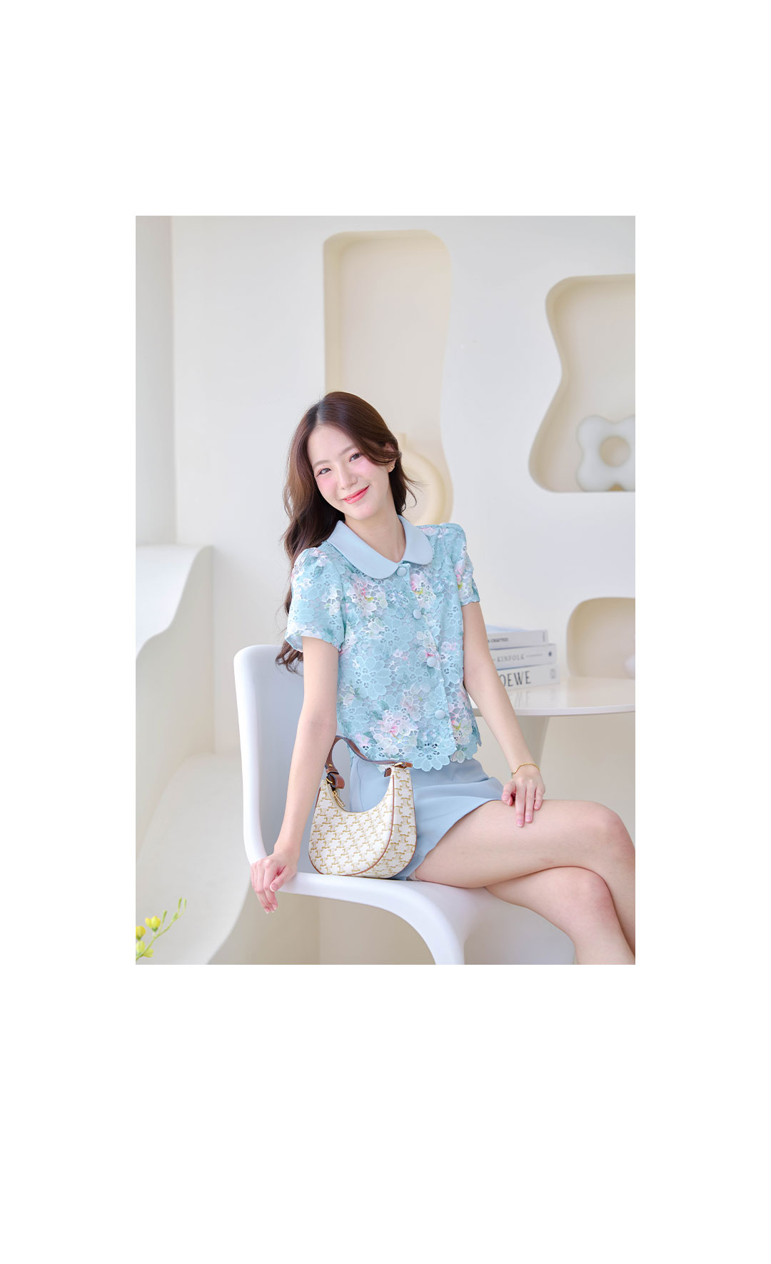 ไอเท็มนี้ห้ามพลาดเลย เสื้อแขนสั้นคอปกลายสวย โทนสีฟ้าคราม ใส่แล้วขับผิวผ่องออร่าสุดๆ งานผ้าลูกไม้งานตัดตามลายลูกไม้อย่างปราณีตเลย มีซับในทั้งตัว ชายเชิงตัดตามลูกไม้สวยหวานสุดๆ กระดุมเรียงหน้า ลุคคุณหนูหวานๆ แมทกับขาสั้นหรือขายาว ดูสวยแพง ใส่ทำงานก็ได้ใส่เที่ยวก็น่ารัก รุ่นนี้จัดไปไม่ผิดหวังจริงๆ