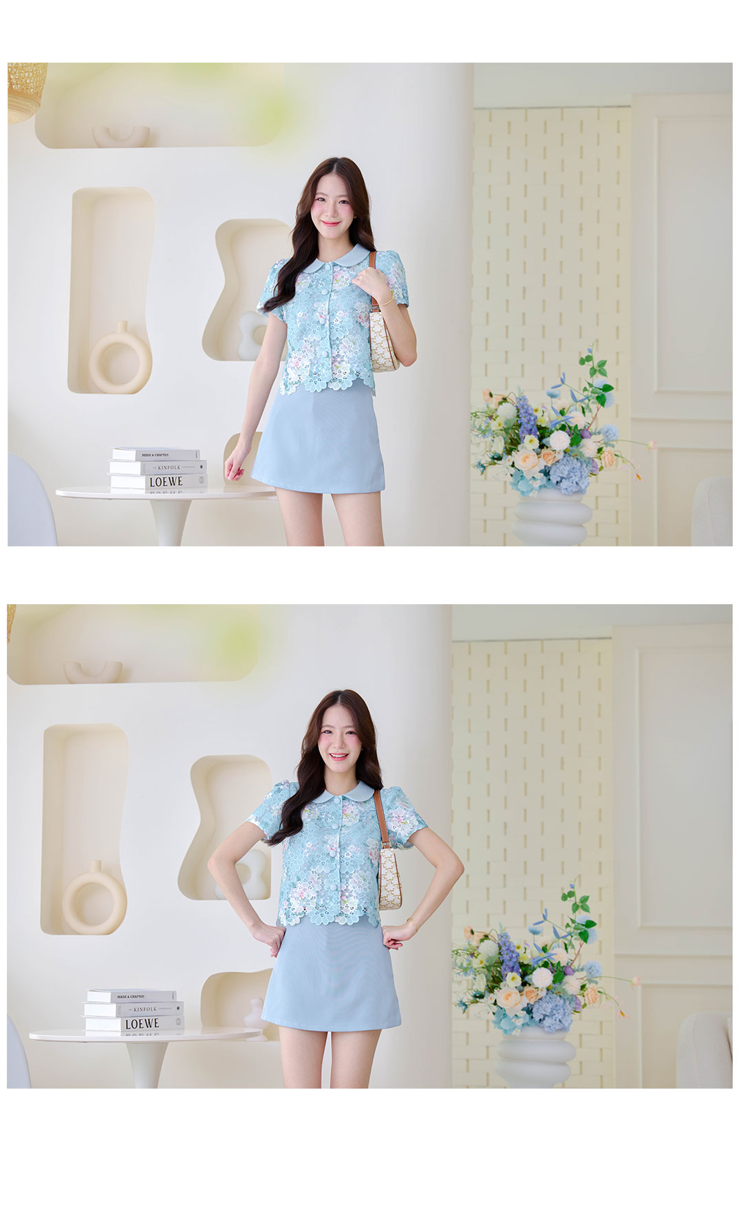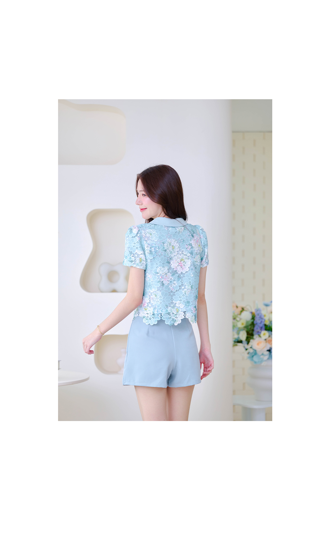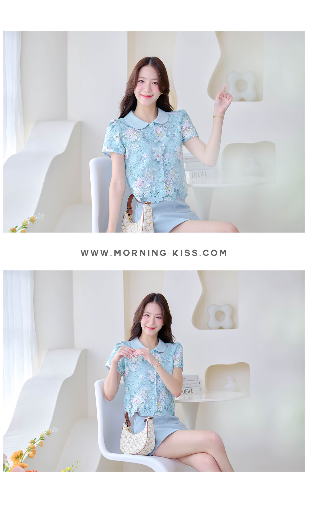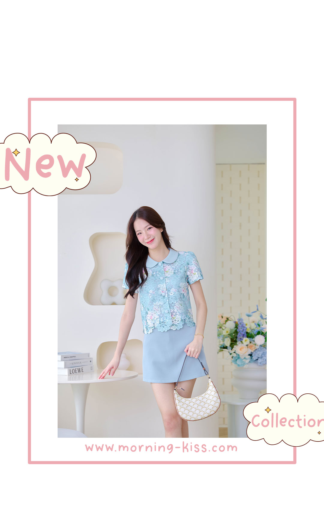 ไอเท็มนี้ห้ามพลาดเลย เสื้อแขนสั้นคอปกลายสวย โทนสีฟ้าคราม ใส่แล้วขับผิวผ่องออร่าสุดๆ งานผ้าลูกไม้งานตัดตามลายลูกไม้อย่างปราณีตเลย มีซับในทั้งตัว ชายเชิงตัดตามลูกไม้สวยหวานสุดๆ กระดุมเรียงหน้า ลุคคุณหนูหวานๆ แมทกับขาสั้นหรือขายาว ดูสวยแพง ใส่ทำงานก็ได้ใส่เที่ยวก็น่ารัก รุ่นนี้จัดไปไม่ผิดหวังจริงๆ