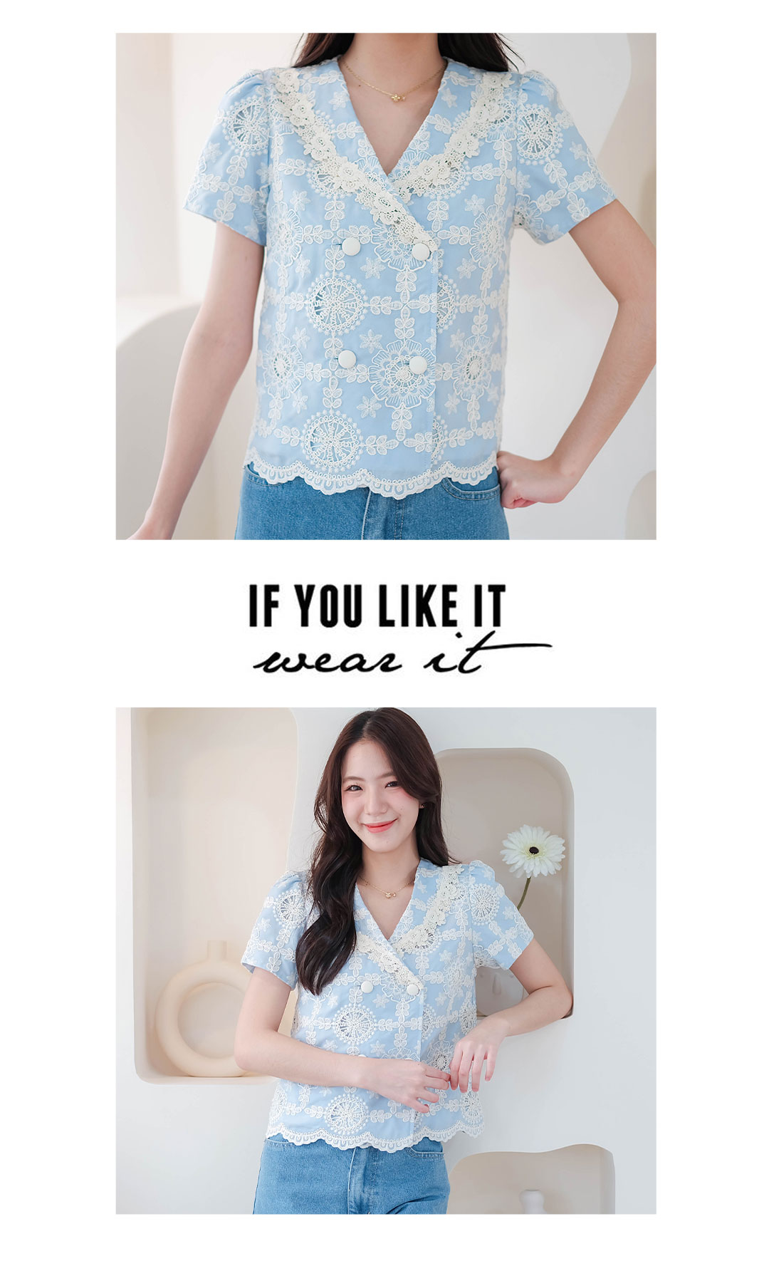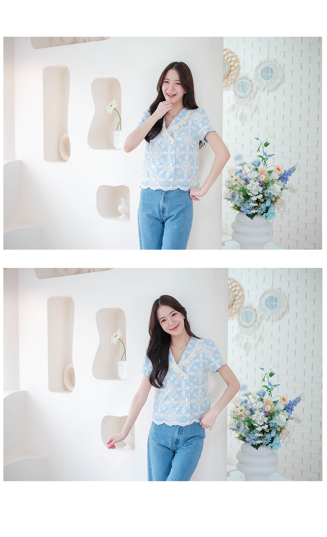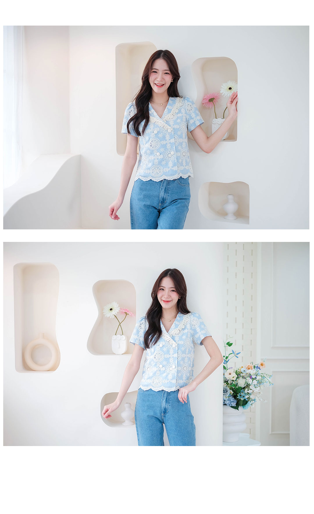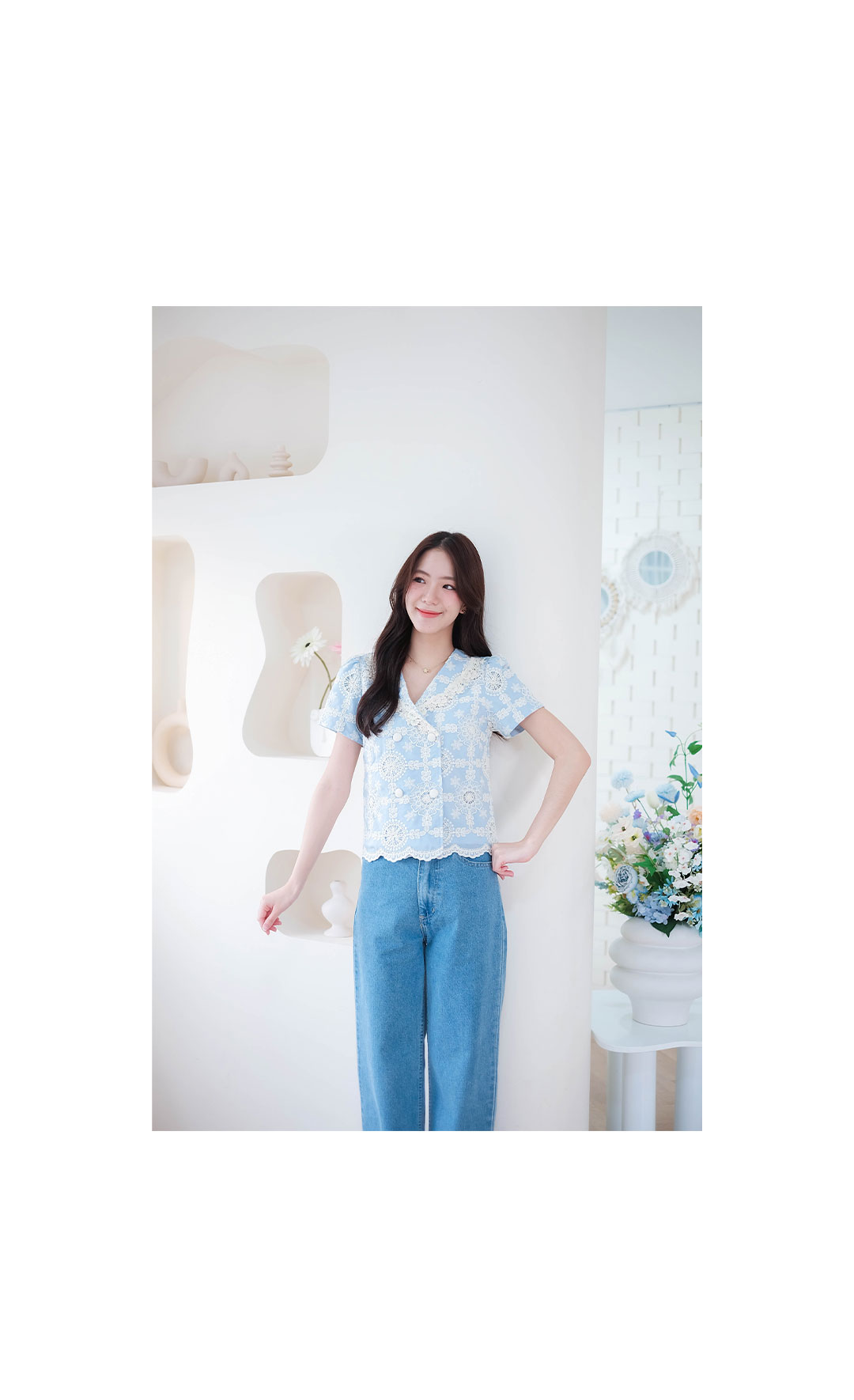 บอกเลยว่ารุ่นนี้คืดที่สุดของความปัง ดีเทลเน้นๆ สาวหวานต้องไม่พลาดไอเท็มนี้ น่ารักมาก ดีเทลงานปักอลังการกับเสื้อแขนสั้นโทนสีฟ้า งานฉลุลายลูกไม้สีครีมอย่างสวยเลย ช่วงคอวี ตัดทรงป้าย แต่งกระดุมคู่เรียงหน้า แมทกับกระโปรงหรือกางเกงก็น่ารัก ไอเท็มนี้แนะนำเลย งานพรีเมียมสวยมากๆ คุ้มเกินราคา