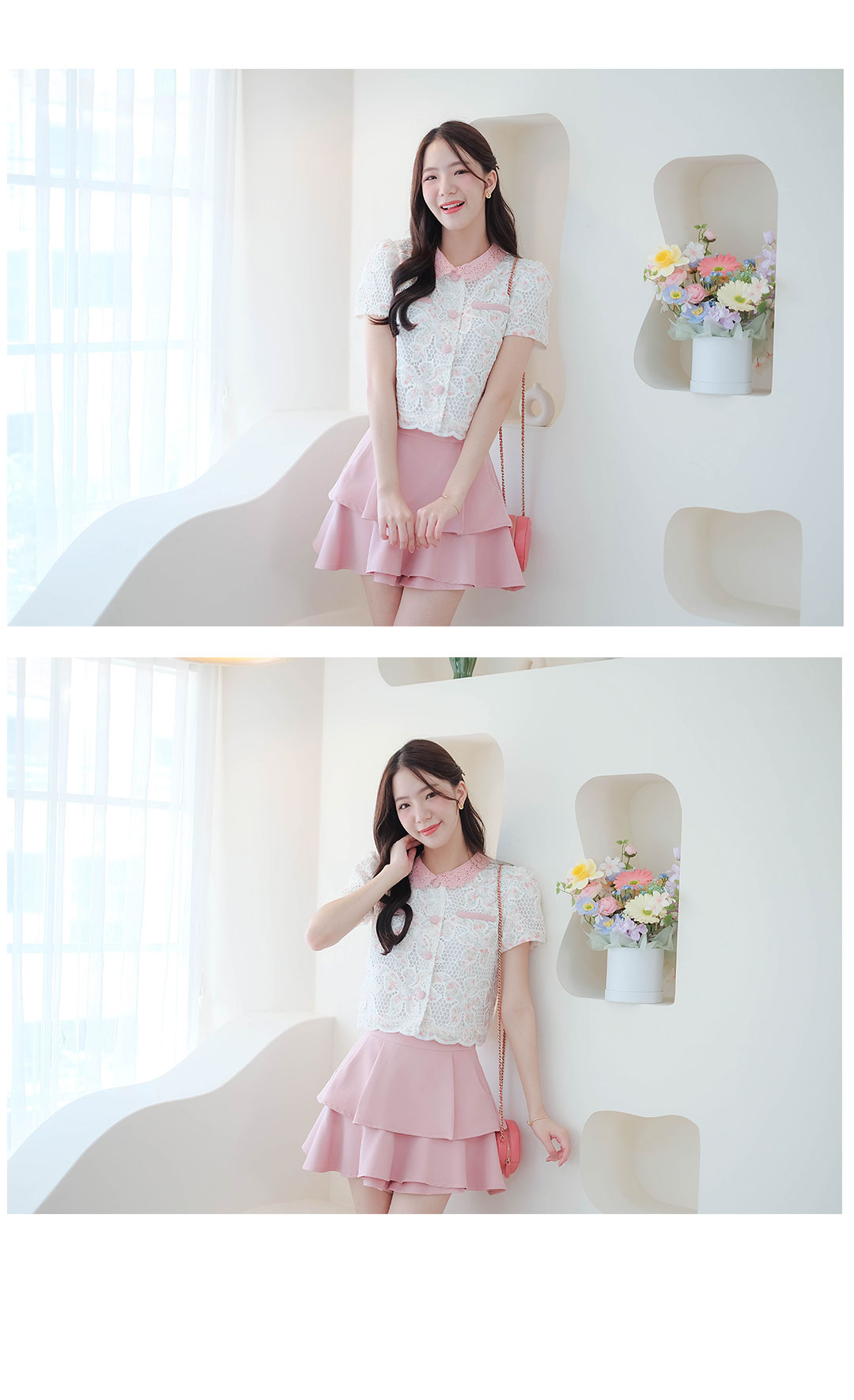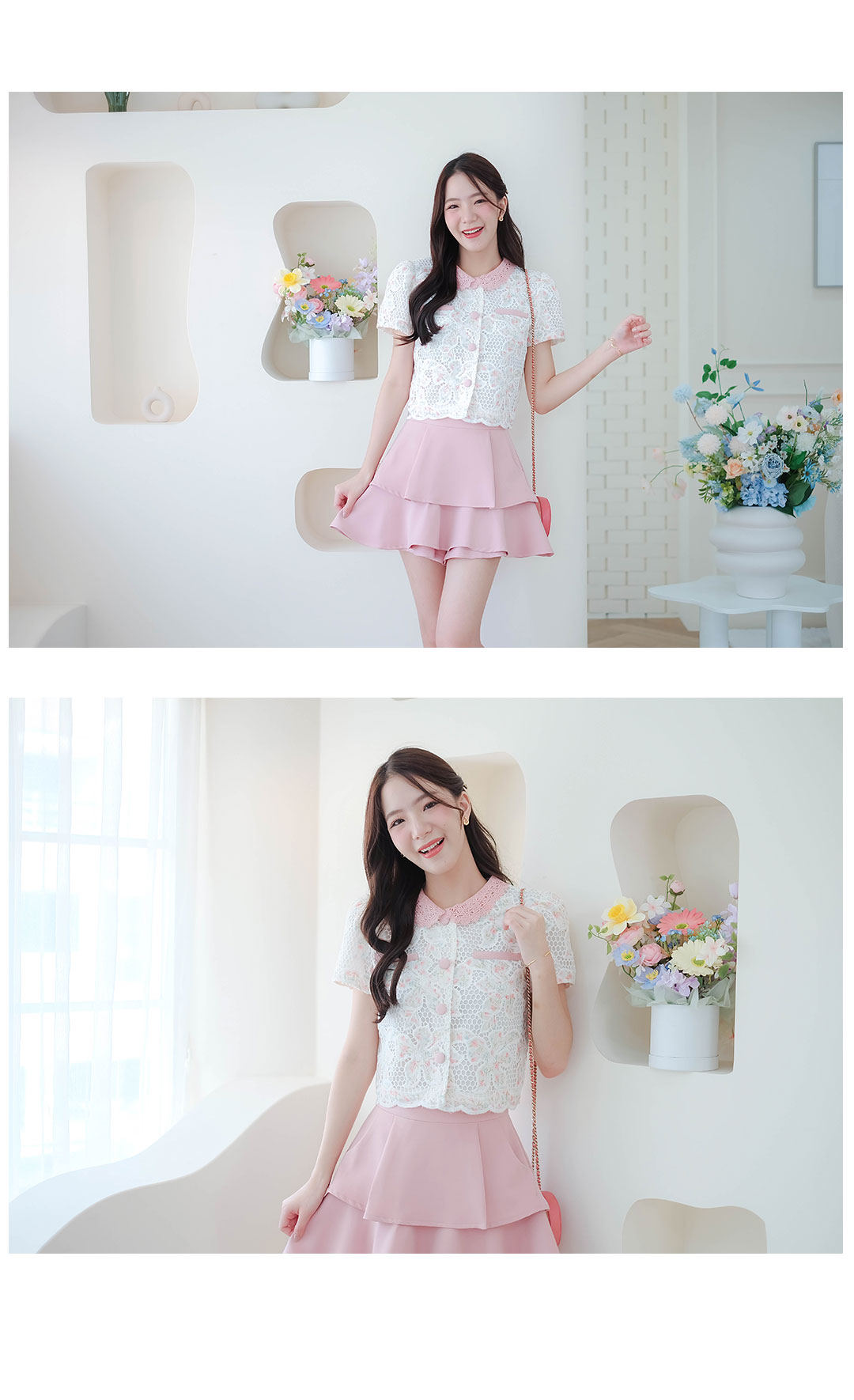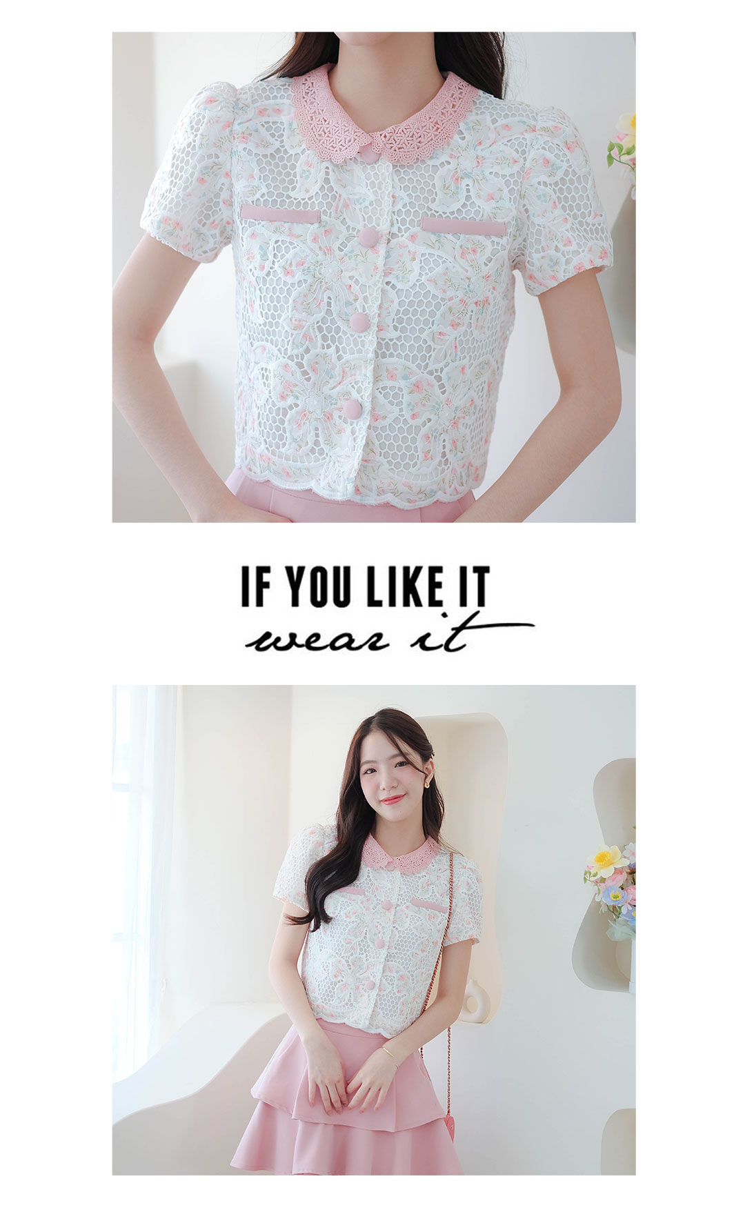 สาวหวานห้ามพลาดเลย รุ่นนี้สวยหวานละมุนมากๆ กับเสื้อผ้าลูกไม้โทนสีขาวลายดอกไม้เล็กสีชมพู คอปกผ้าถักสีชมพู ดีไซน์แต่งกระเป๋าหลอก ซ้าย/ขวา มีซับในทั้งตัว กระดุมสีชมพูเรียงหน้า ลุคคุณหนูหวานๆ แมทกับขาสั้นหรือขายาว ดูสวยแพง ใส่ทำงานก็ได้ใส่เที่ยวก็น่ารัก รายการนี้แนะนำเลย