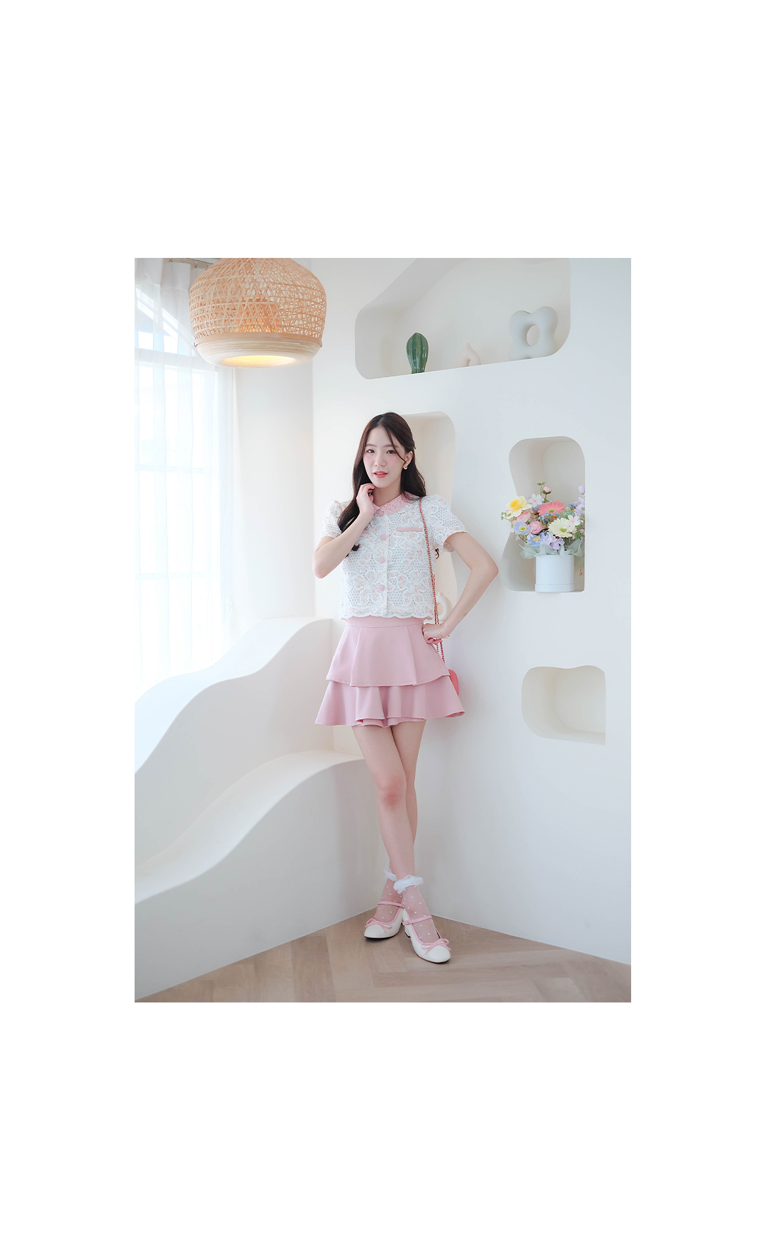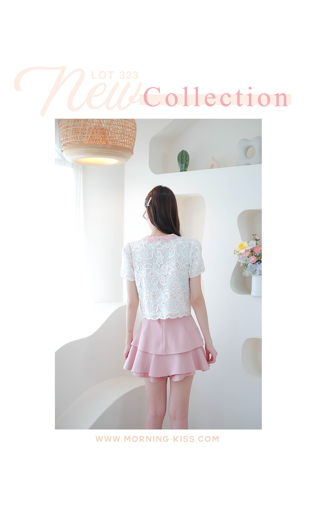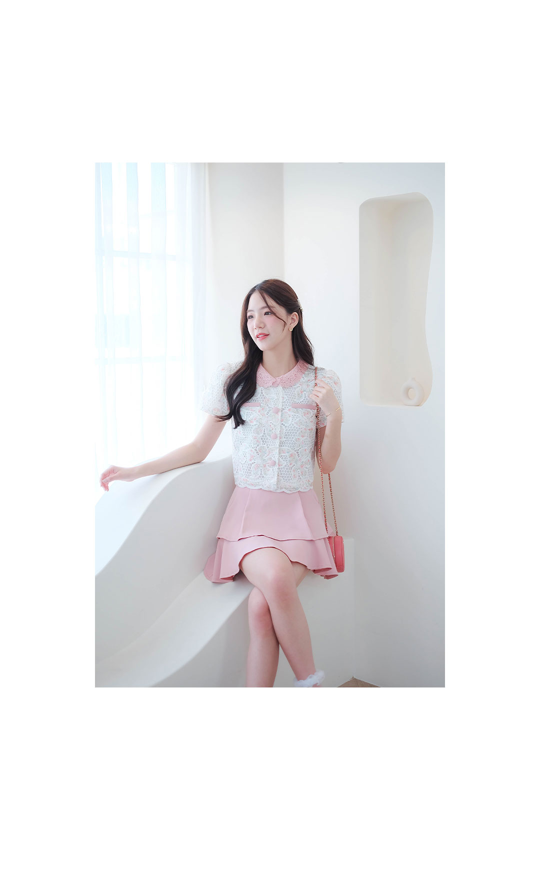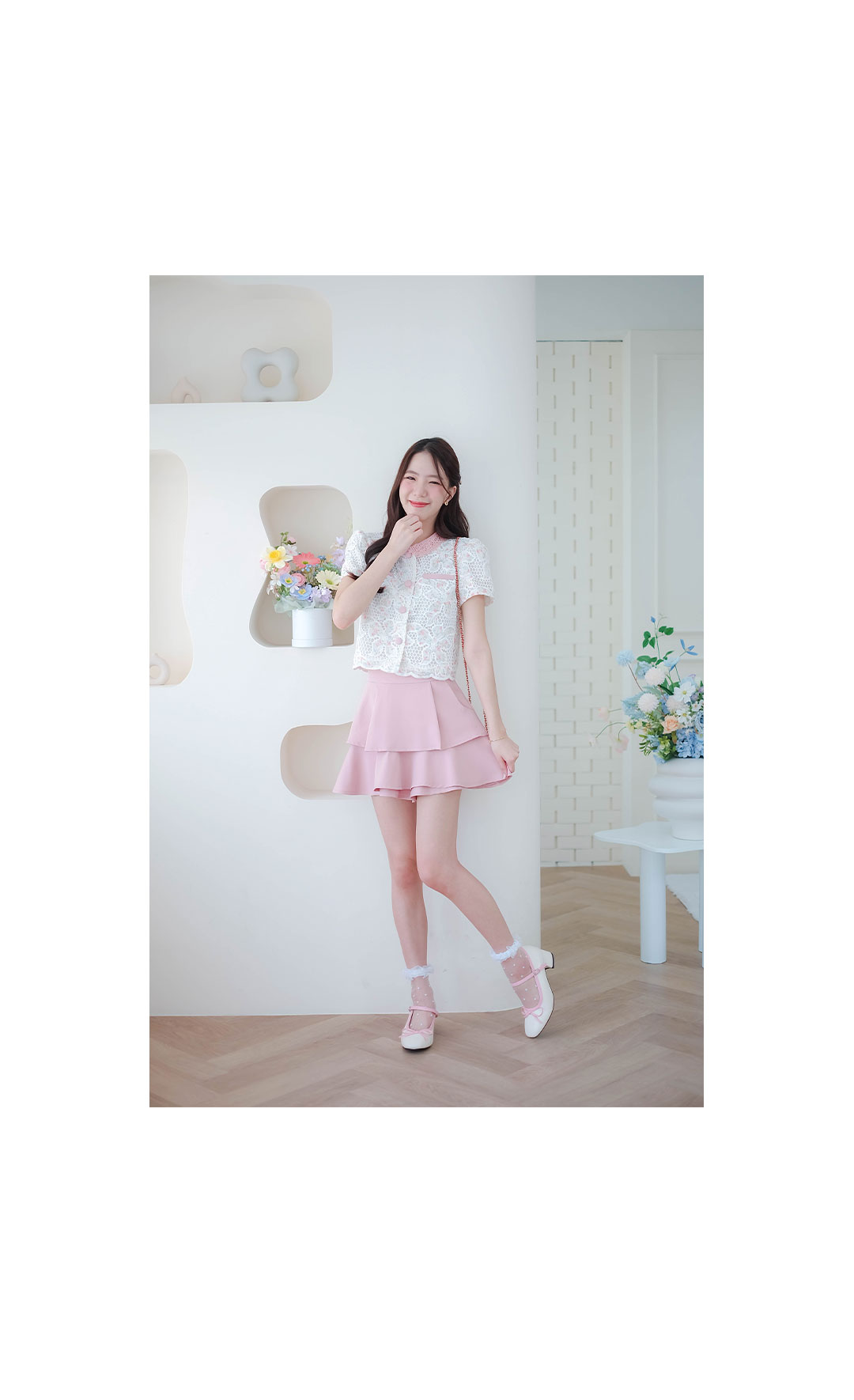 สาวหวานห้ามพลาดเลย รุ่นนี้สวยหวานละมุนมากๆ กับเสื้อผ้าลูกไม้โทนสีขาวลายดอกไม้เล็กสีชมพู คอปกผ้าถักสีชมพู ดีไซน์แต่งกระเป๋าหลอก ซ้าย/ขวา มีซับในทั้งตัว กระดุมสีชมพูเรียงหน้า ลุคคุณหนูหวานๆ แมทกับขาสั้นหรือขายาว ดูสวยแพง ใส่ทำงานก็ได้ใส่เที่ยวก็น่ารัก รายการนี้แนะนำเลย