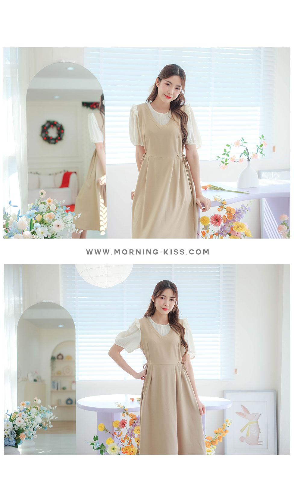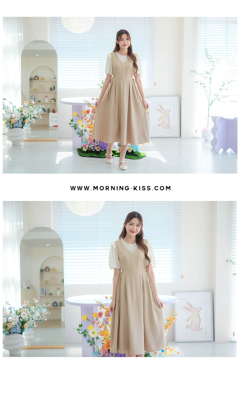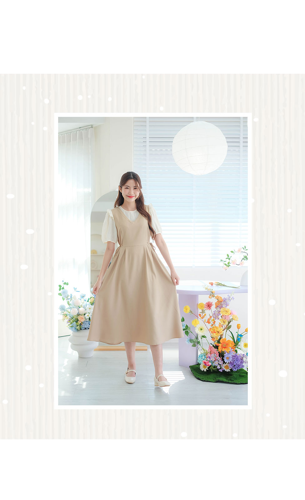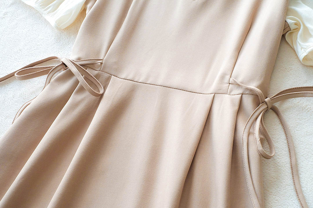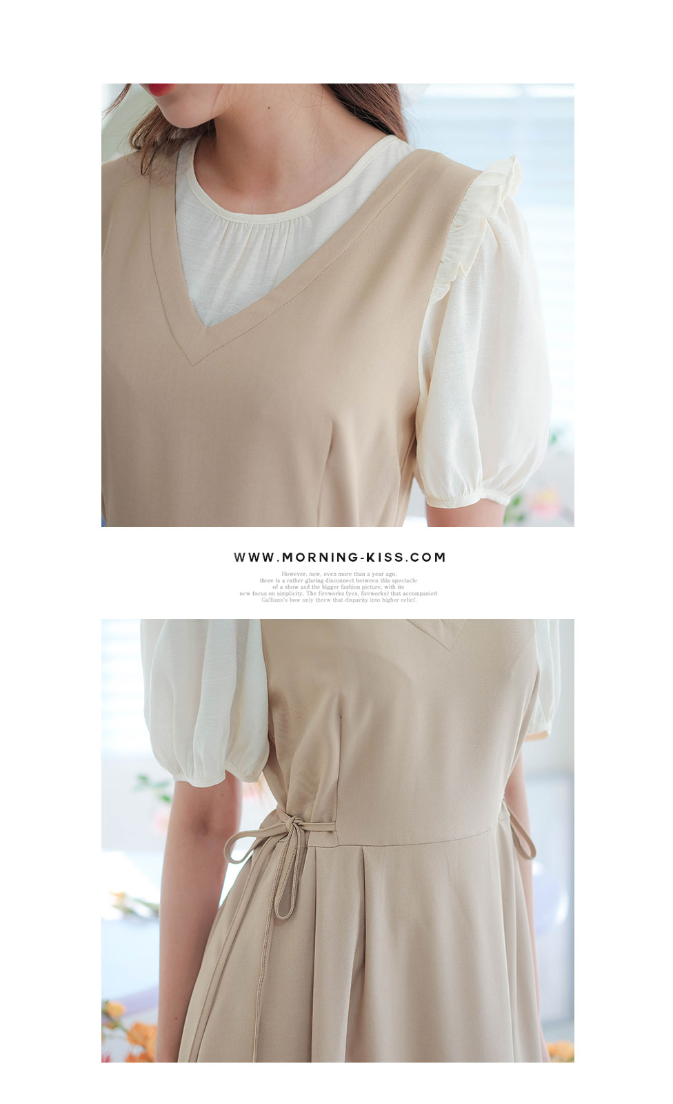 เกาหลีเกาใจ สไตส์น่ารัก ไม่อยากให้พลาดเลยค่า กับชุดเดรสแขนสั้นแบบทูโทน ดีไซน์เป็นเอี้ยมเย็บติดกับตัวเสื้อสีครีม ต้นแขนทำระบายเล็กๆ ช่วงเอวด้านข้างมีสายผูกเป็นโบว์น่ารักๆ มีซิปซ่อนด้านข้าง ชายกระโปรงปล่อยๆ ใส่ได้แบบตัวเดียวจบ ความยาวกำลังดี ทรงสวยใส่ง่าย แบบตัวเดียวอยู่จริงๆ จัดไปไม่ผิกหวัง