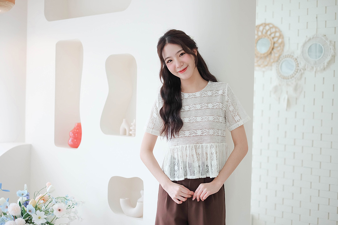 ไอเท็มแนะนำ ลุคน่ารักใสๆกับเสื้อผ้าลุกไม้เนื้อนิ่มสีครีมเป็นทรง crop แบบใส่พอดีเอว แต่งด้วยซับในสีเบจ โทนสีผสมกันได้ สวยโดดเด่น ให้อารมณ์หรูหรา ชายระบาย ใส่ทำงานก็ได้ใส่เที่ยวก็น่ารัก รายการนี้แนะนำเลย งานสวยมากจริงๆไม่อยากให้พลาดเลย