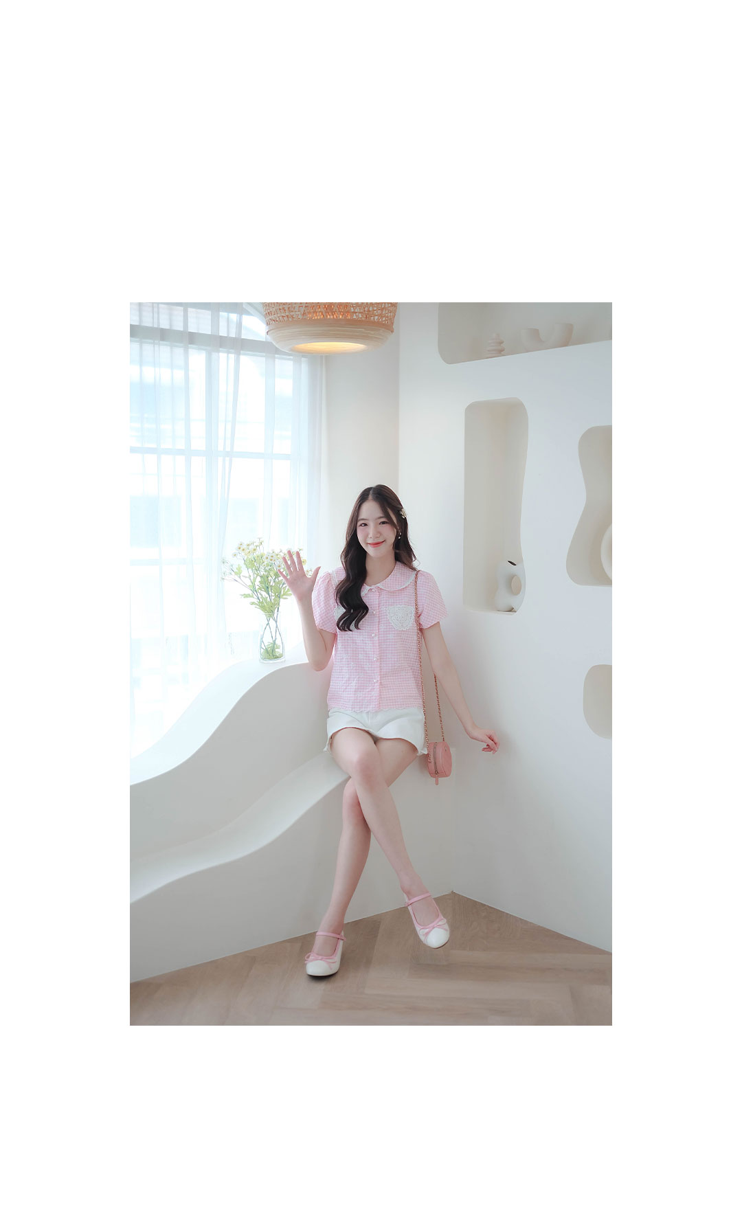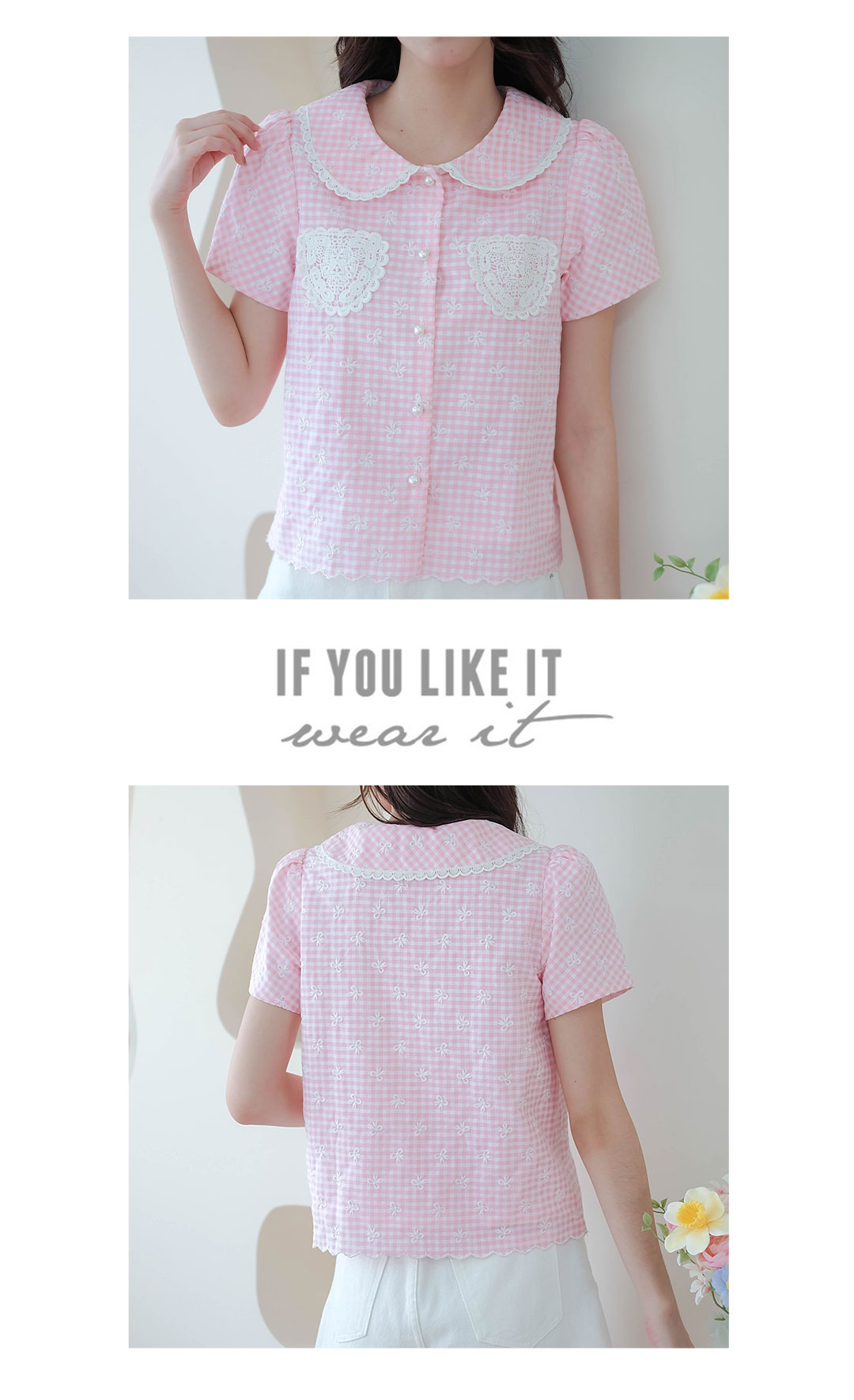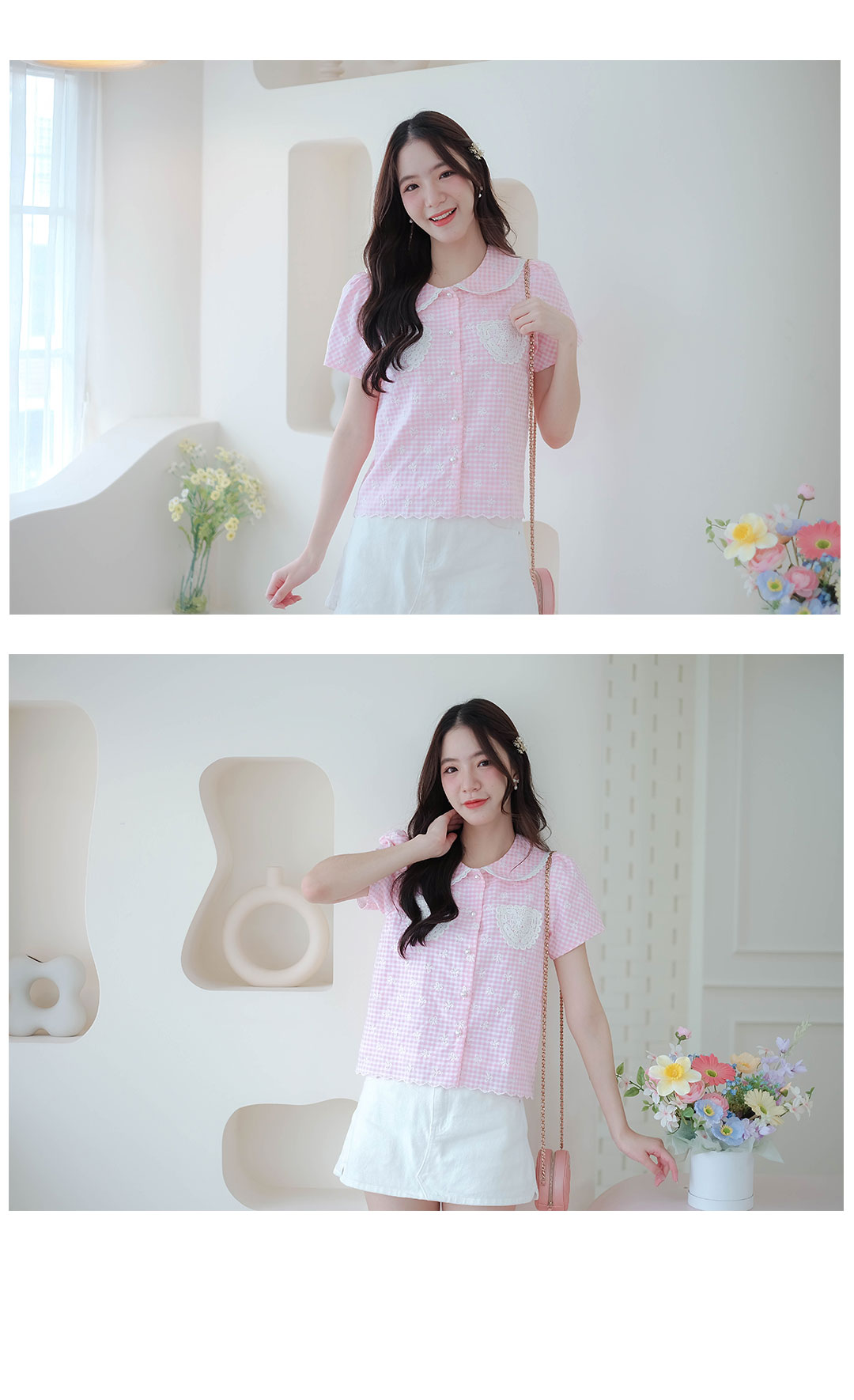 รุ่นนี้จัดไปไม่ผิดหวังแน่นอน สไตส์สวยหวานน่ารักๆเลย เสื้อแขนสั้นลาตารางเล็กๆสีชมพูสลับขาวปักลายโบว์สีขาวเล็กๆรอบตัว แต่งปลายคอปกผ้าลูกไม้สีขาว มีกระเป๋าด้วยผ้างานถักลูกไม้ ซ้าย/ขวา กระดุมมุกเรียงหน้า มีซับในทั้งตัวใช้ผ้าไหมอิตาลีอย่างดี ไม่ระคายผิว ลายผ้าน่ารักมากๆ ใส่ทำงานก็ได้ใส่เที่ยวก็น่ารัก รุ่นนี้ผ้าเป็นงานปักทั้งตัว ผ้าราคาสูงมาก จัดไปไม่ผิดหวังแน่นอน