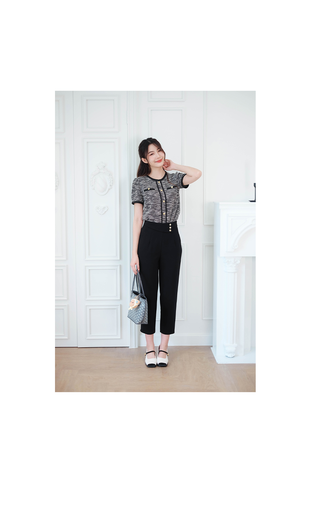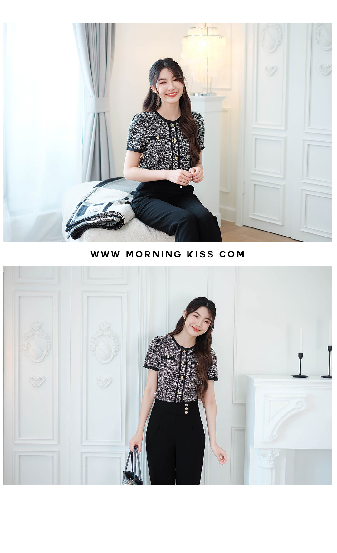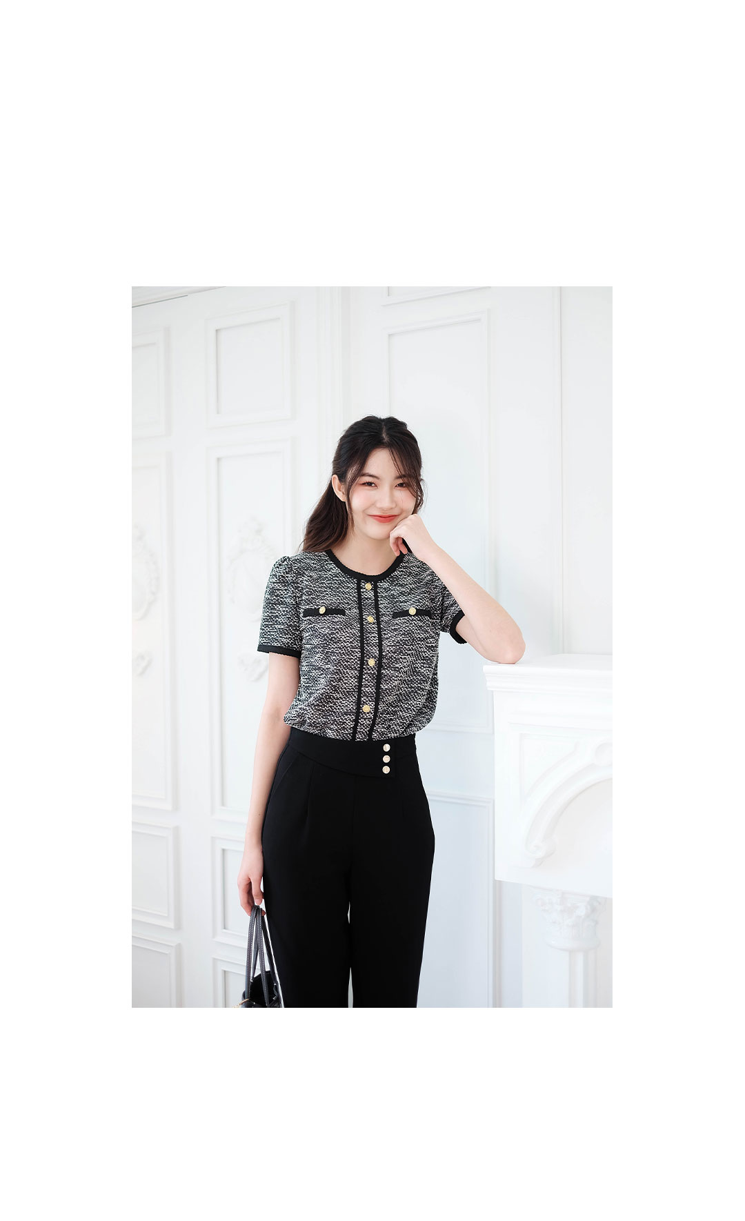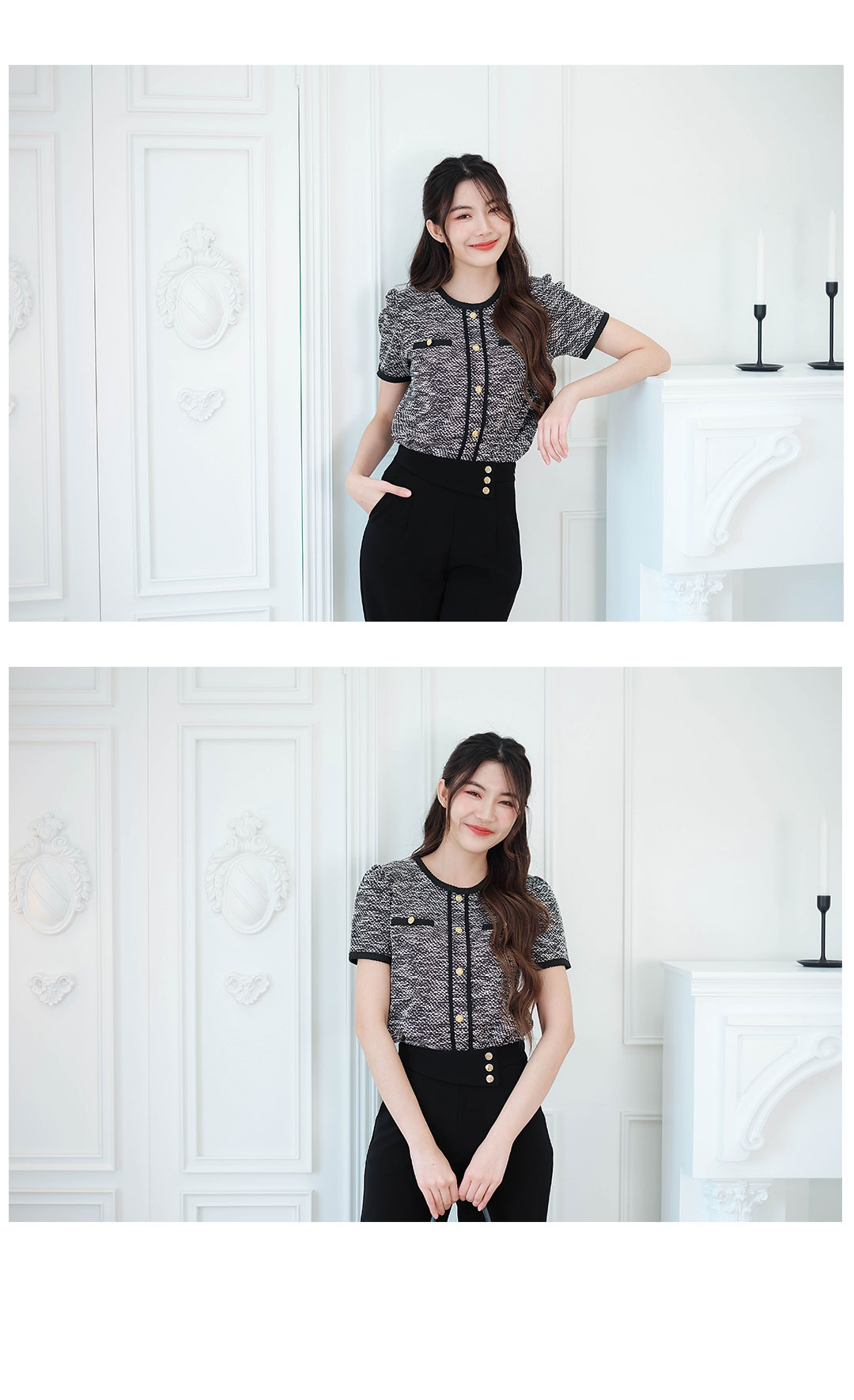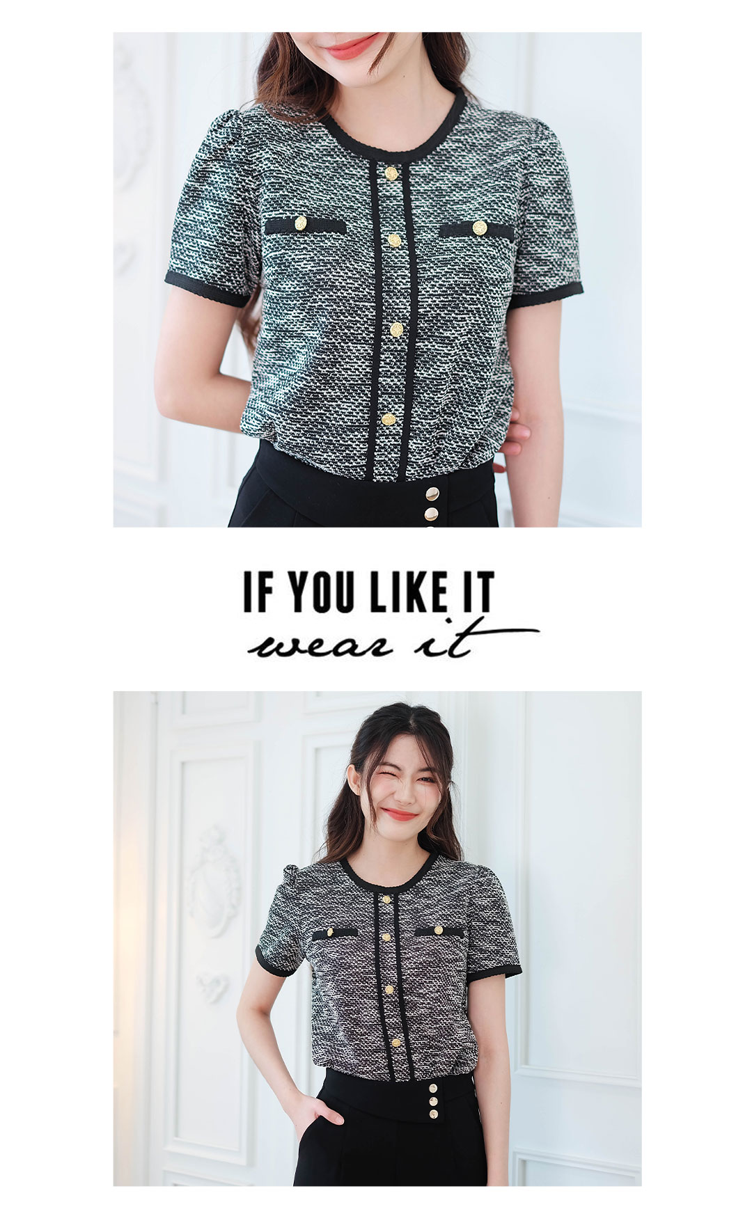 เรียบหรูคลาสิคที่สุดกับเสื้อแขนสั้นผ้า Tweed แบบยืด เนื้อผ้าแบบมี texture ในตัว กุ๊นขอบตัวเสื้อ และ สาปเสื้อด้วยสีดำ แต่งกระเป๋าหลอก 2 ข้าง ซ้าย/ขวา ติดกระดุมสีทองหลอกเรียงหน้าสวยโดดเด่น แมทกับกระโปรงหรือกางเกงก็น่ารัก ดูสวยแพง ใส่ทำงานก็ได้ใส่เที่ยวก็น่ารัก รุ่นนี้จัดไปไม่ผิดหวังจริงๆ