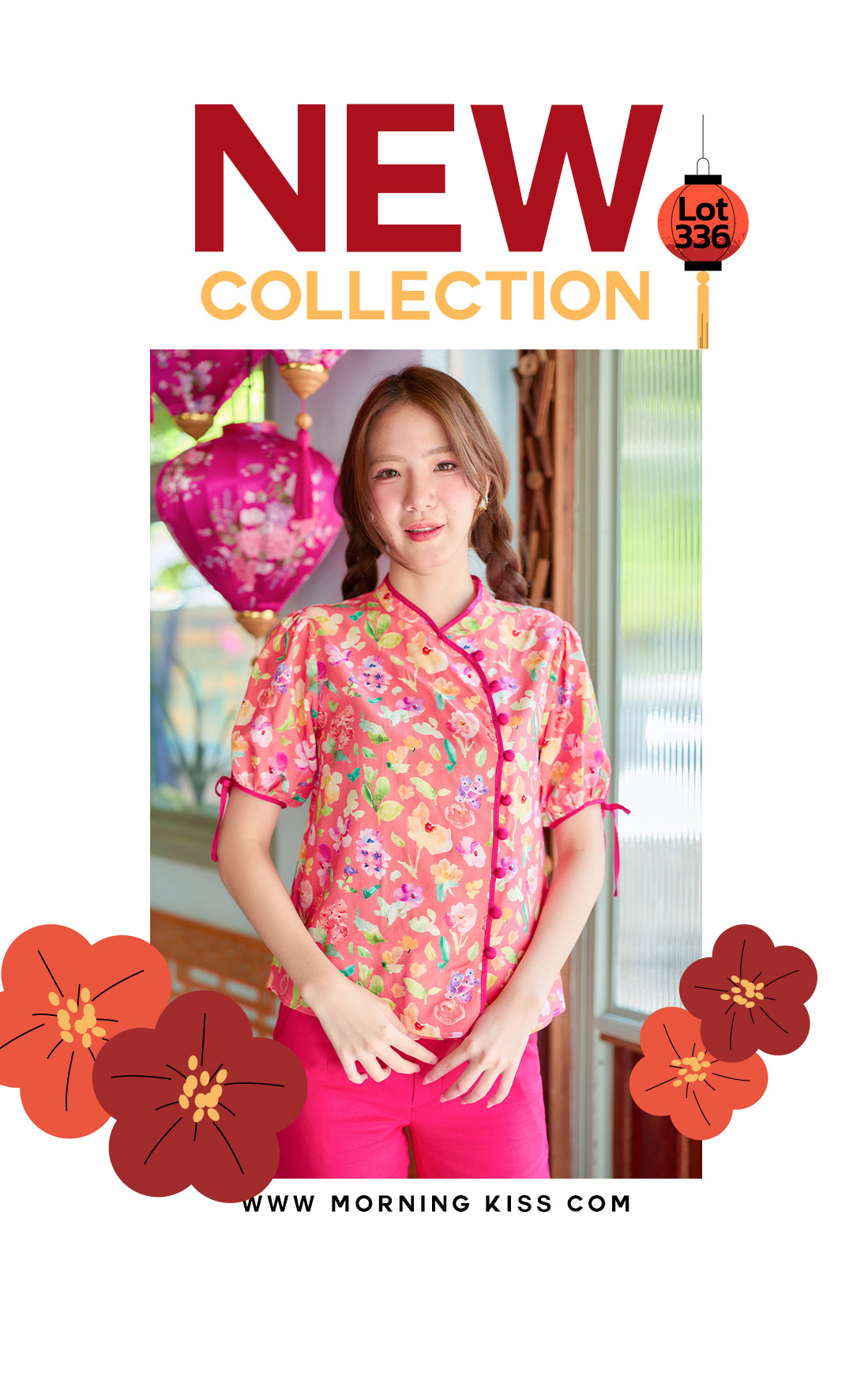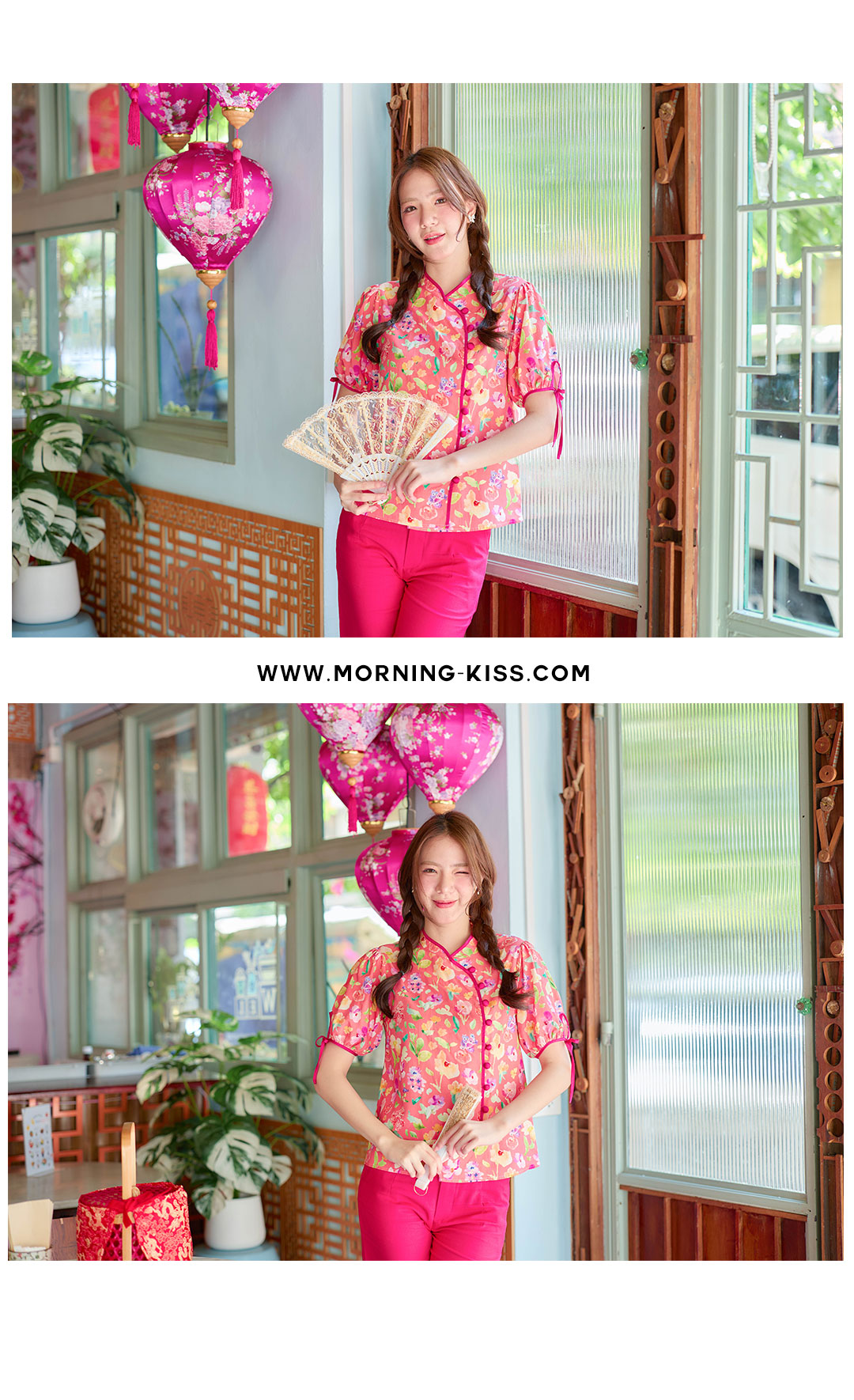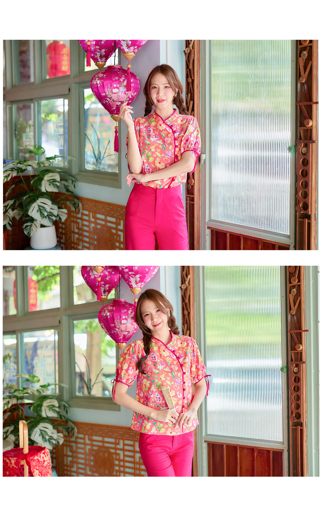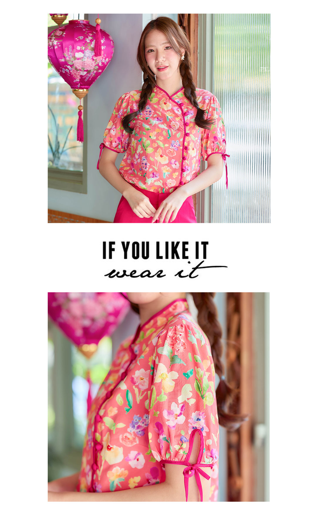แบบน่ารักๆ กับเสื้อคอจีนใส่รับอั่งเปาปีนี้ โทนโอรส งานปริ้นลายดอกน่ารักๆสีสดใส กุ๊นตัวเสื้อด้วยสีชมพูบานเย็น ตัดกับตัวเสื้อได้อย่างลงตัวช่วงแขนทำพองๆนิดปลายแขนมีสายผูกเป้นโบว์น่ารักๆ มีซับในทั้งตัว แต่งกระดุมเรียงด้านหน้า จัดไปใส่ตรุษจีนนี้รับทรัพย์ เฮงๆ กันได้เลย