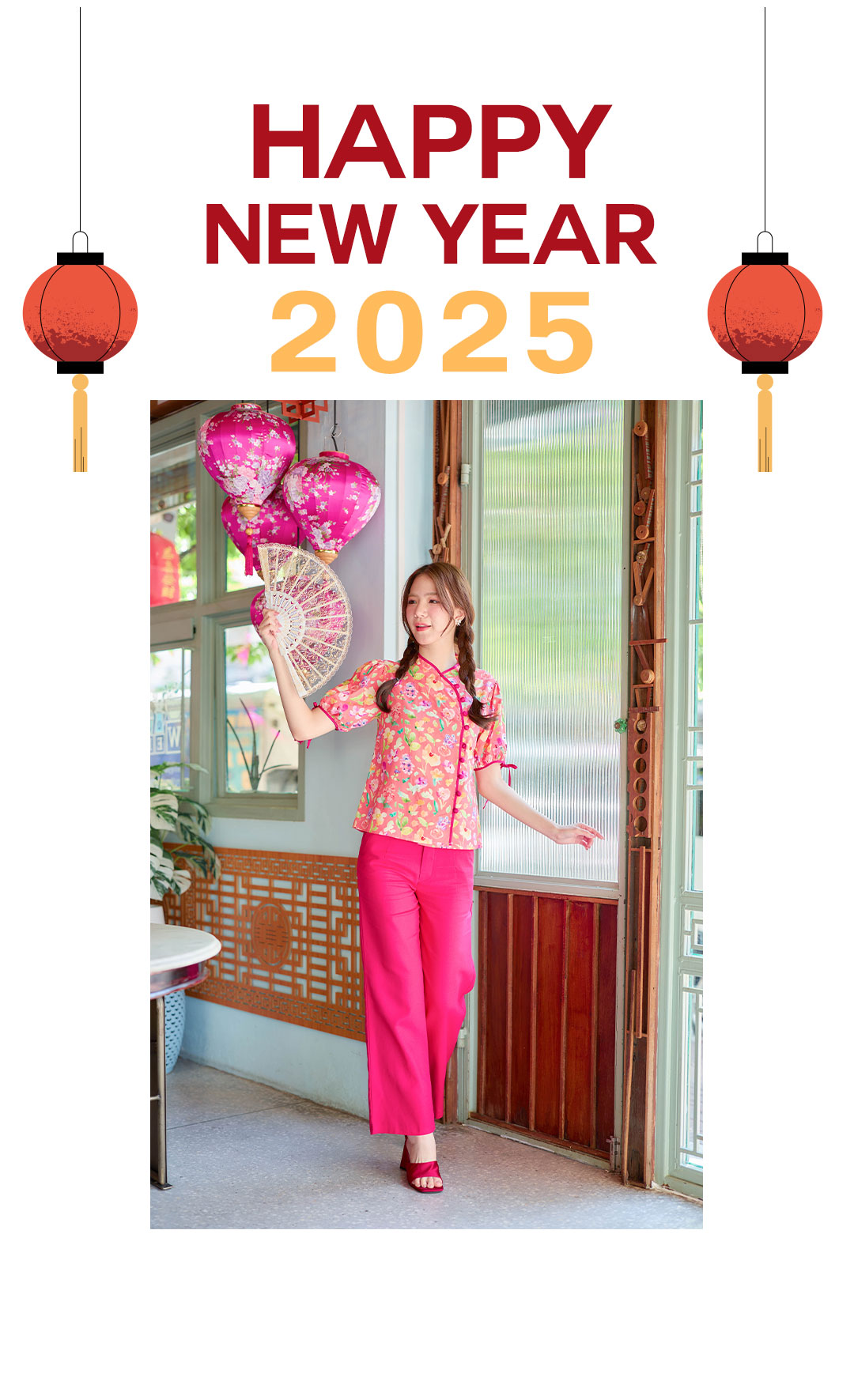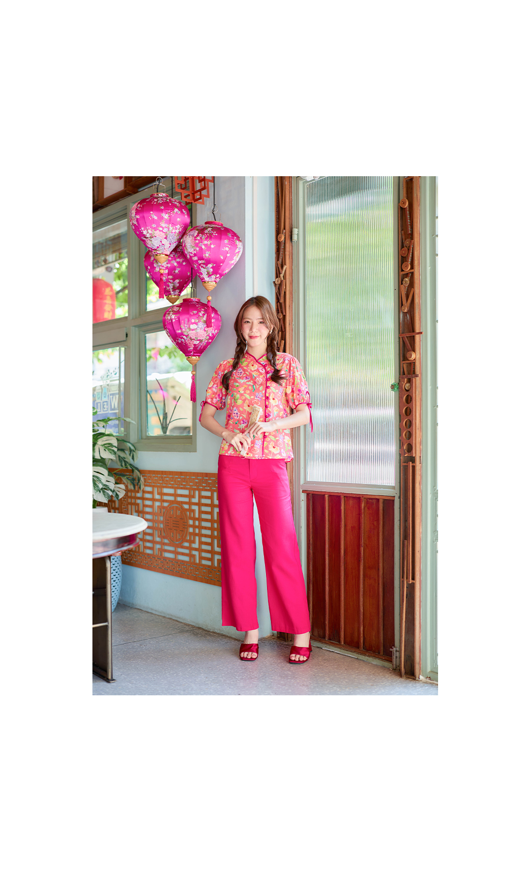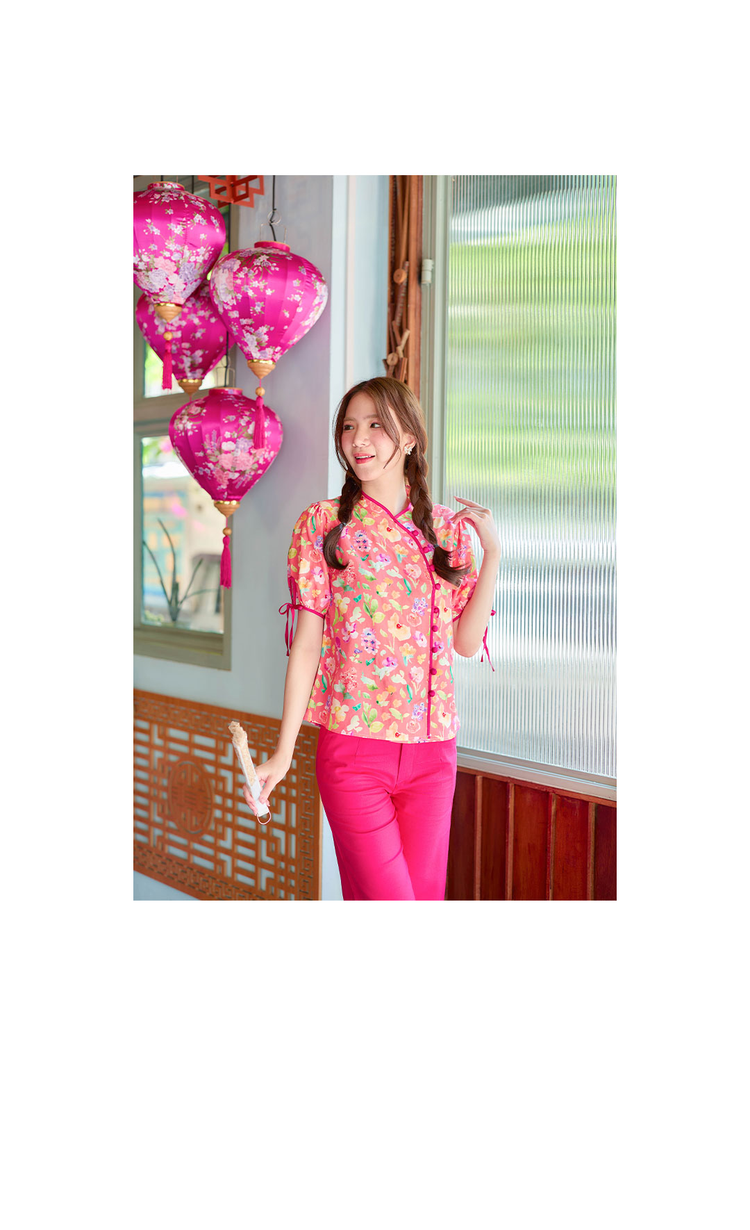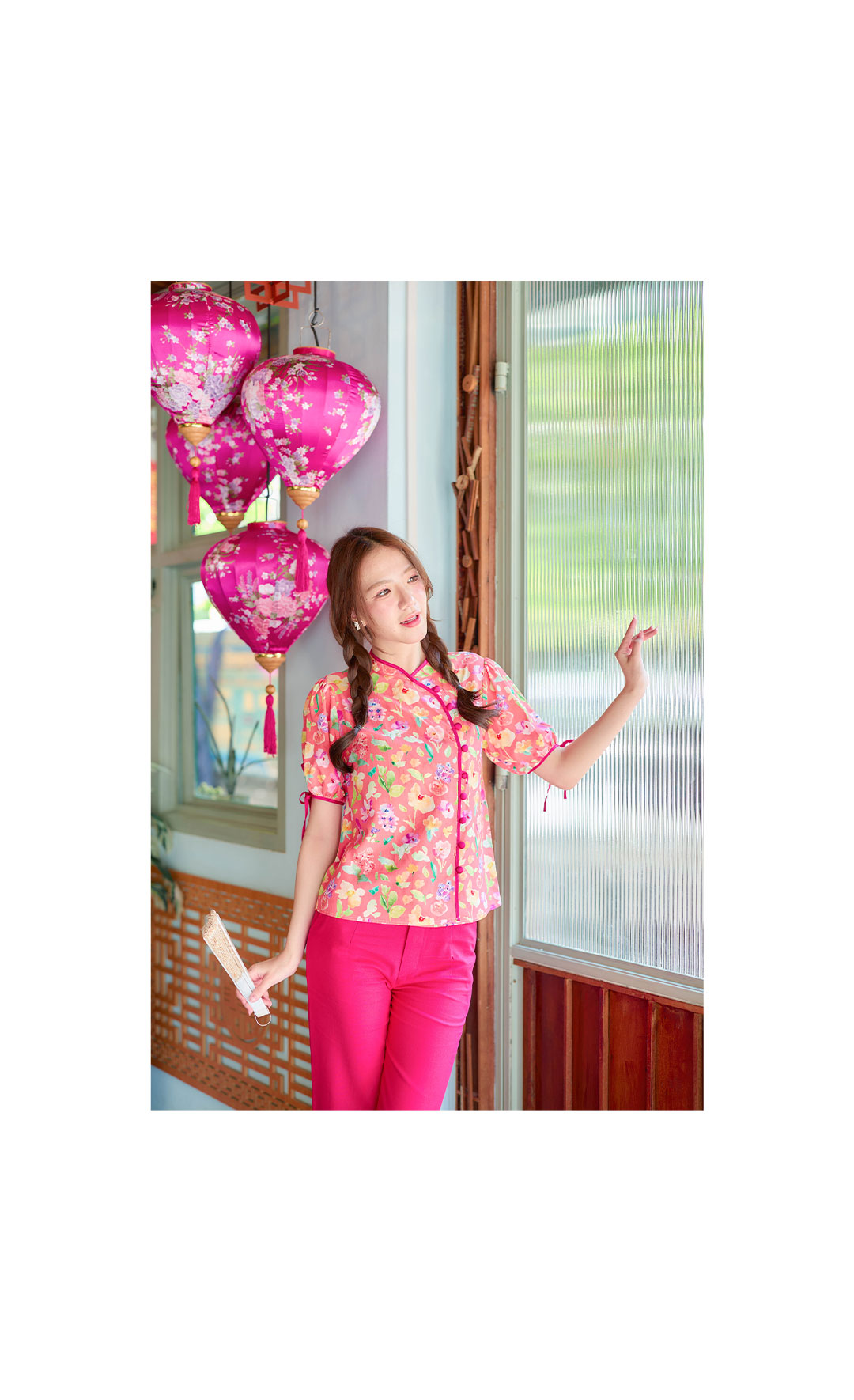 แบบน่ารักๆ กับเสื้อคอจีนใส่รับอั่งเปาปีนี้ โทนโอรส งานปริ้นลายดอกน่ารักๆสีสดใส กุ๊นตัวเสื้อด้วยสีชมพูบานเย็น ตัดกับตัวเสื้อได้อย่างลงตัวช่วงแขนทำพองๆนิดปลายแขนมีสายผูกเป้นโบว์น่ารักๆ มีซับในทั้งตัว แต่งกระดุมเรียงด้านหน้า จัดไปใส่ตรุษจีนนี้รับทรัพย์ เฮงๆ กันได้เลย