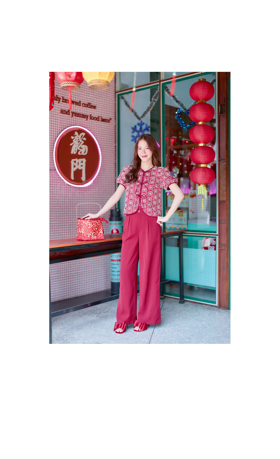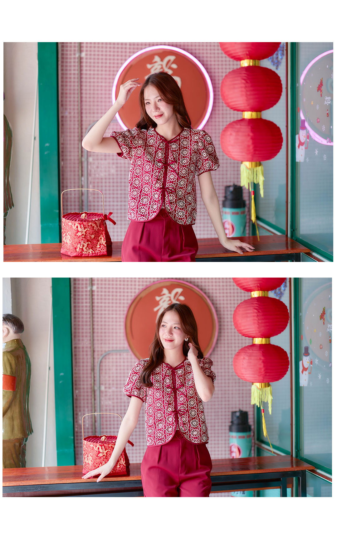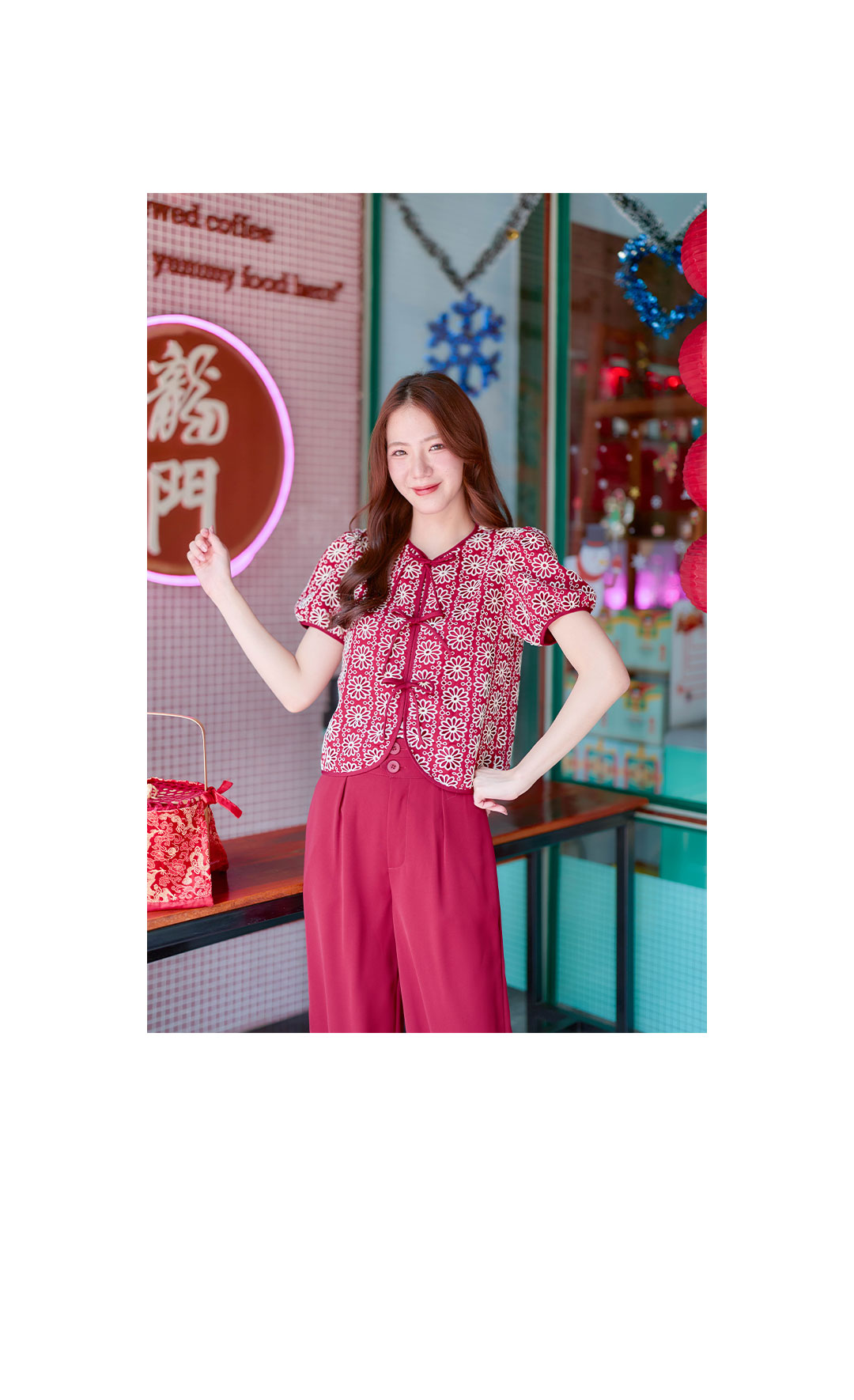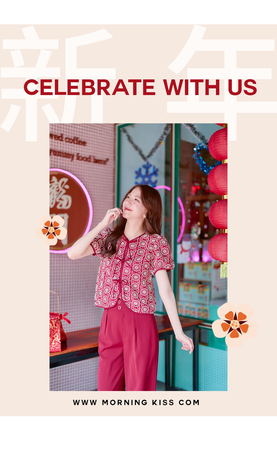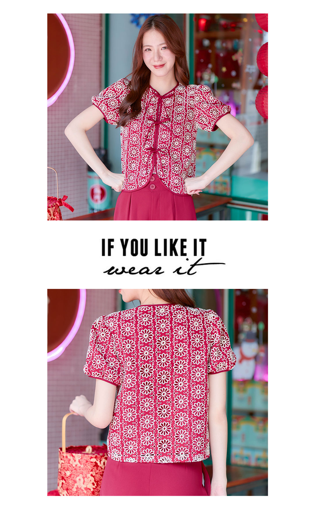 ต้อนรับเทศกาลตรุษจีนกับโทนสีแดง ลุคหรูหราสุดคลาสิค เสื้อผ้าลูกไม้ฉลุลายดอกไม้โทนสีแดงครีม ดูสวยแพง กุ๊นขอบตัวเสื้อด้วยสีแดง แต่งโบว์ผูกเรียงด้านหน้ามีกระดุมซ่อนด้านในนะคะ ช่วงแขนทำพองๆ ดีไซน์ชายโค้งๆ ซับในทั้งตัว น่ารักมากๆ รายการนี้แนะนำเลย งานคุณภาพเกินราคาแน่นอน