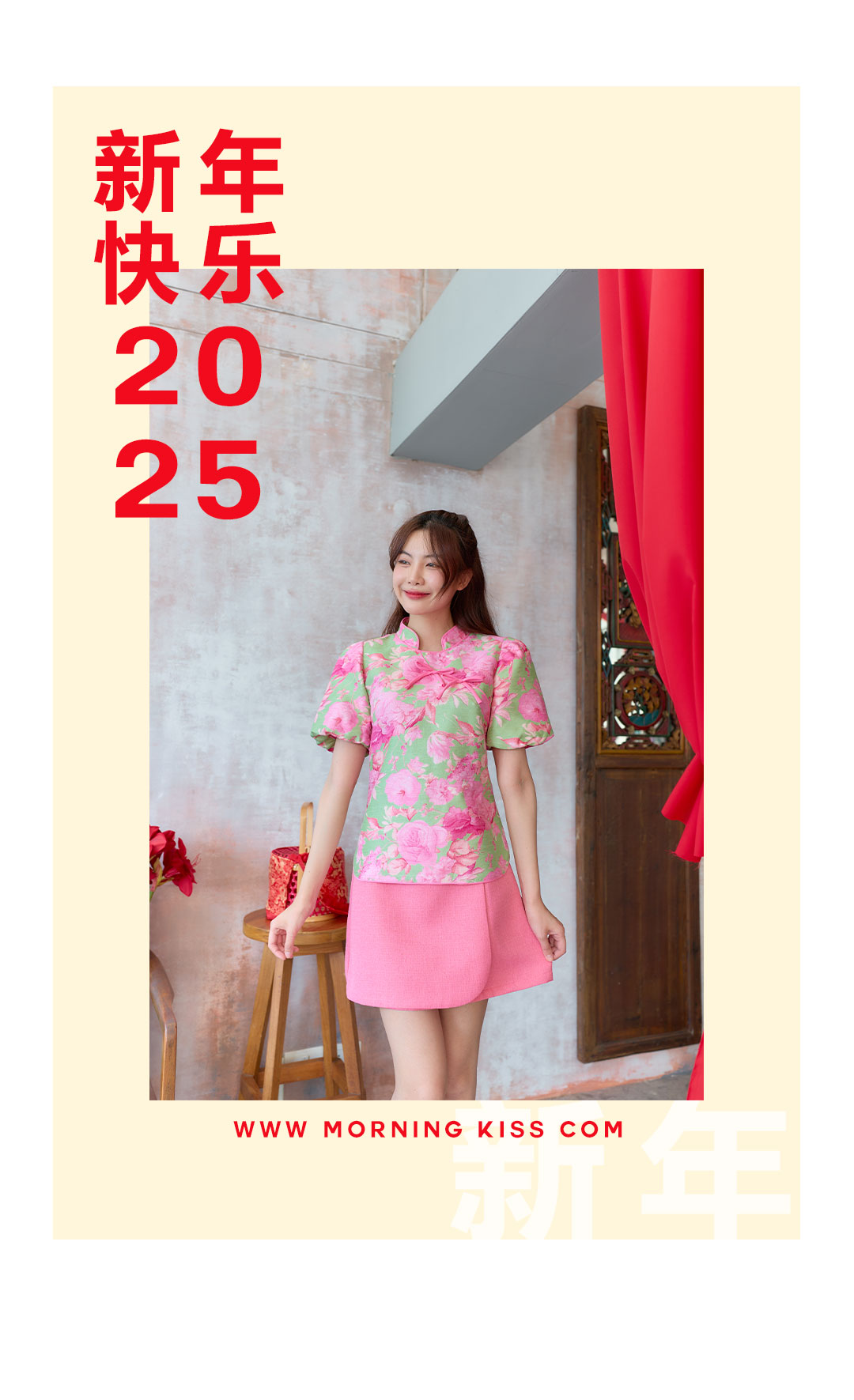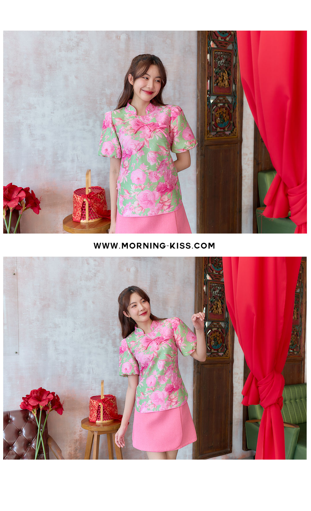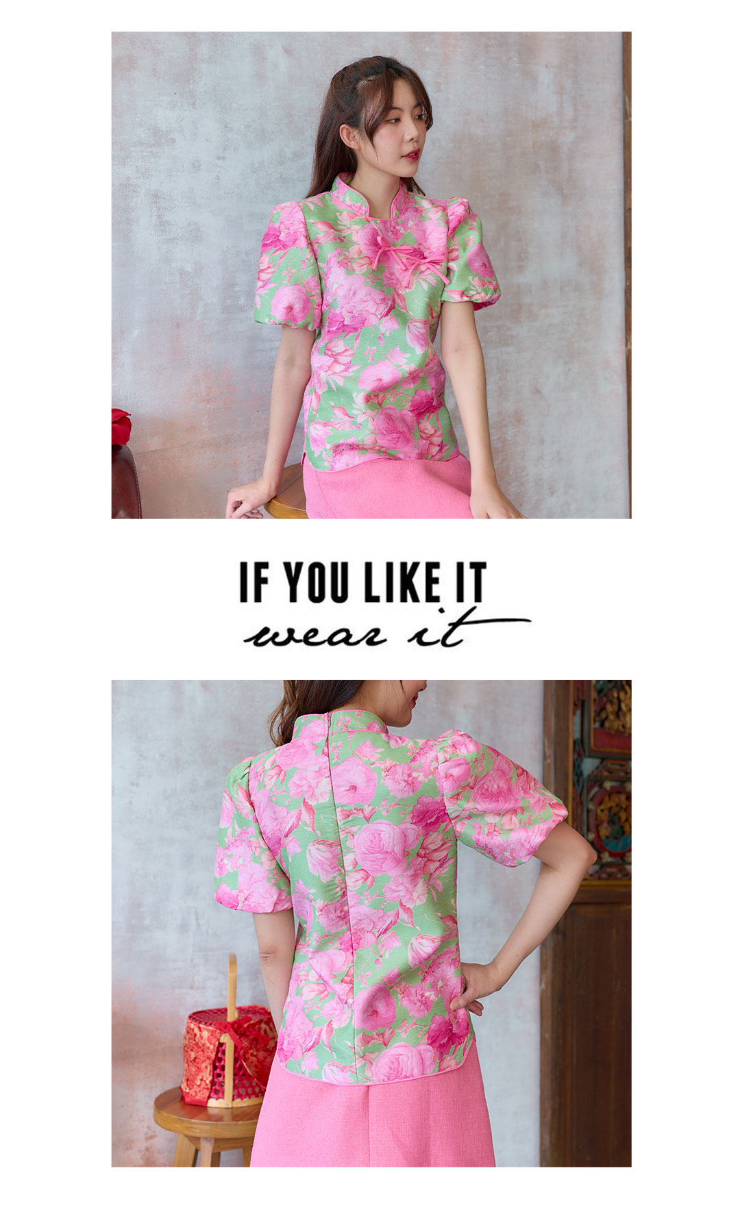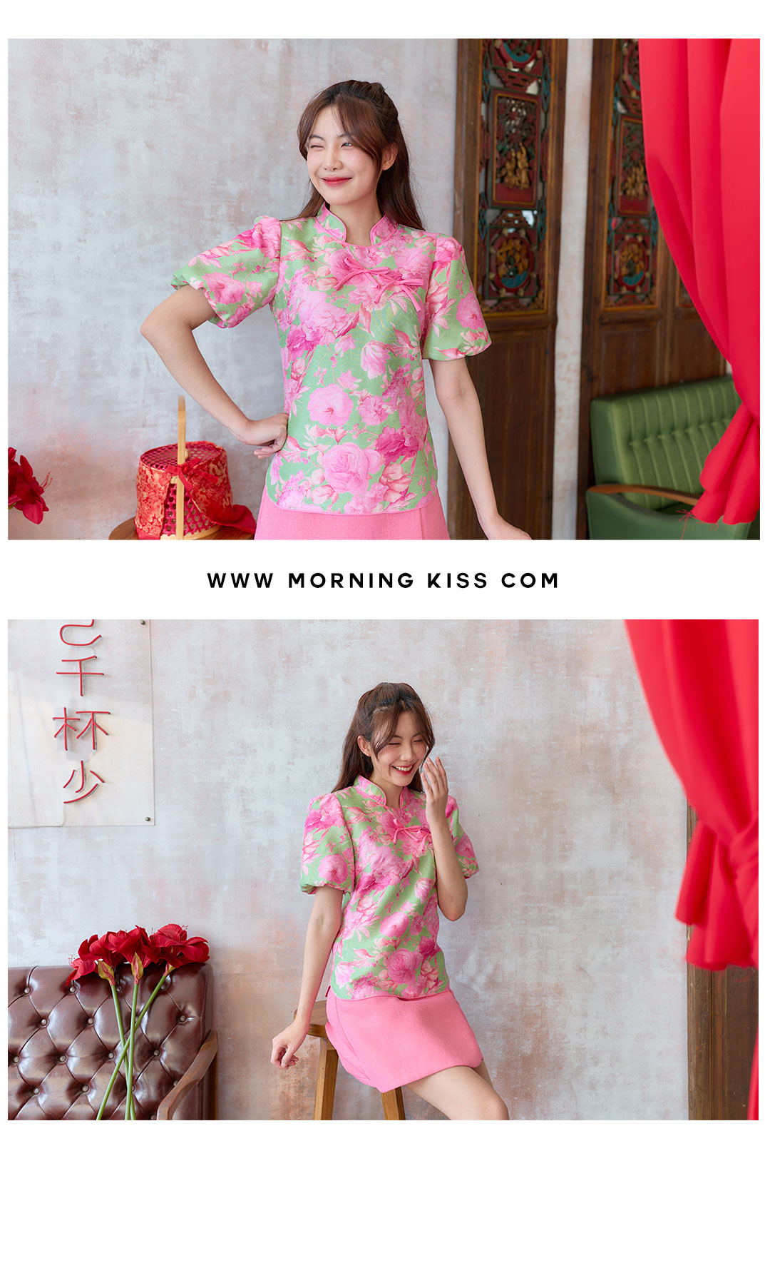 รุ่นนี้สวยหวานน่ารักมาก กับเสื้อคอจีนโทนสีเขียวชมพู ดีไซน์เย็บแบบเฉียง ติดโบว์คู่สีชมพูน่ารักๆ ทรงแขนบอลลูนแบบยาว ทรงใส่ง่าย เข้ารูปเล็กน้อย ชายเสื้อโค้งผ่าข้าง ที่สำคัญเนื้อผ้าอัดกาวทั้งตัวคะ งานดีเว่อร์วังมาก ซิปซ่อนหลัง แมทคู่กับกางเกงแดง สวยปังรับทรัพย์แน่นอน